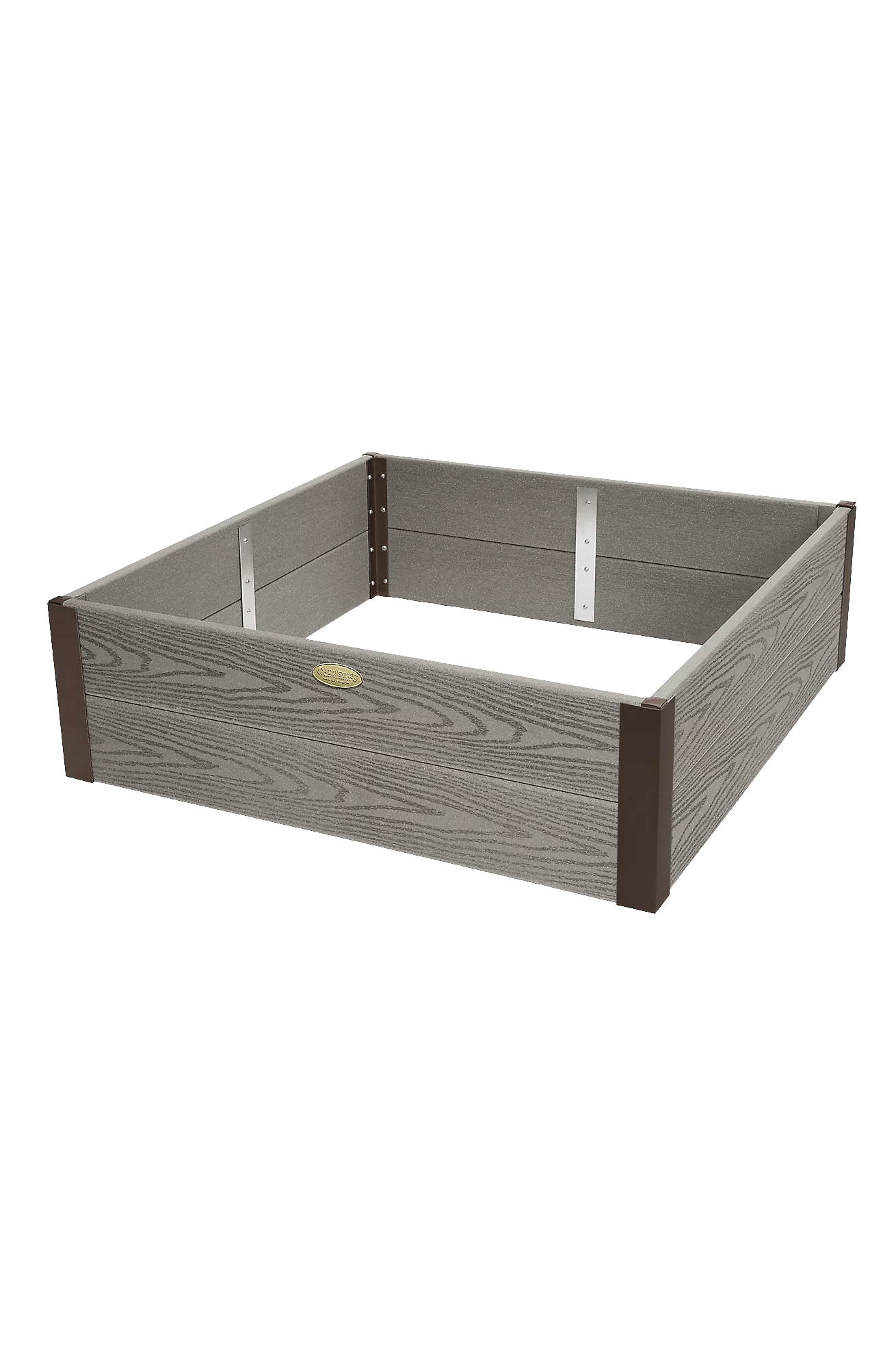 - Beds resemble aged cedar but are made from a long-lasting composite of recycled plastic and reclaimed sawdust