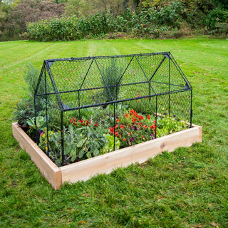 Peaked-roof design covers an entire 2’ x 4’ garden bed. With a 28” center height, you can fit peppers and eggplant underneath!