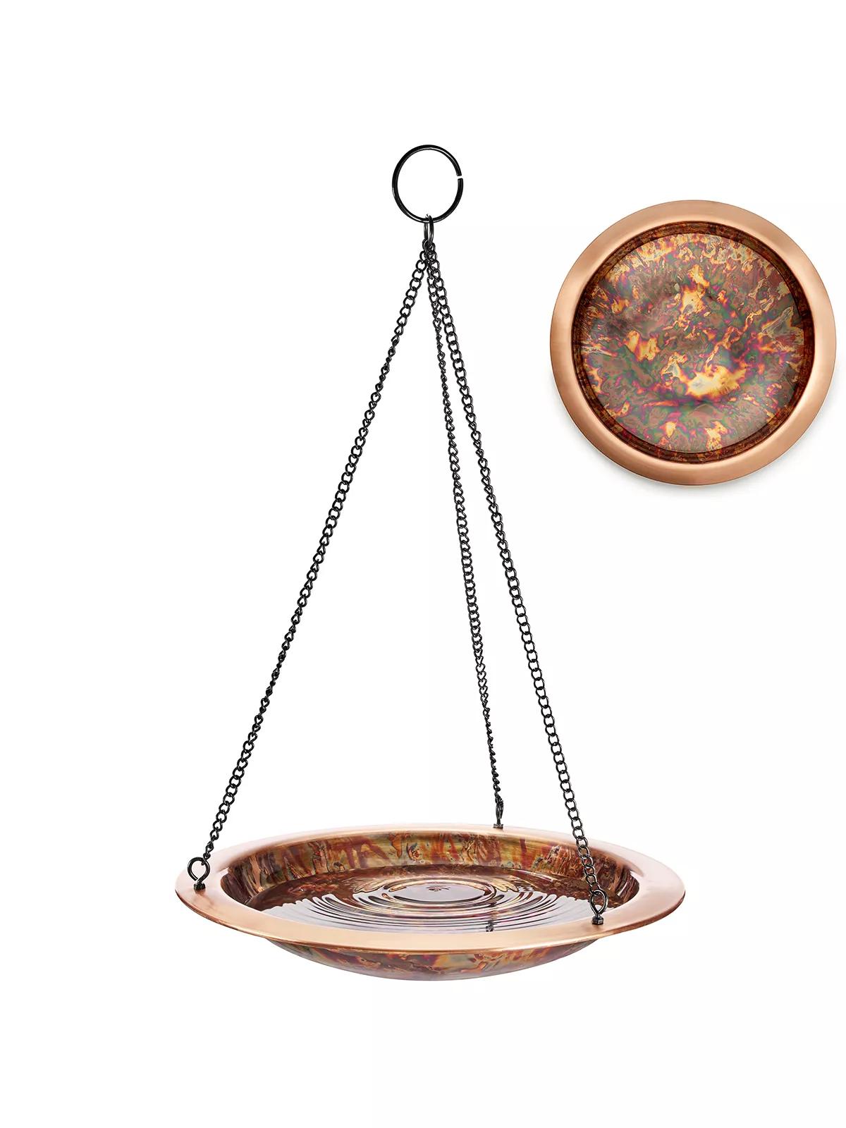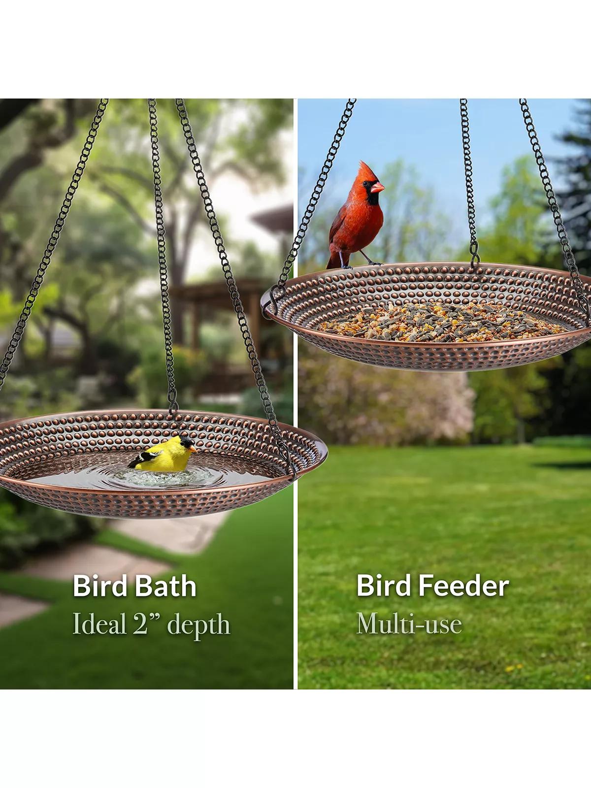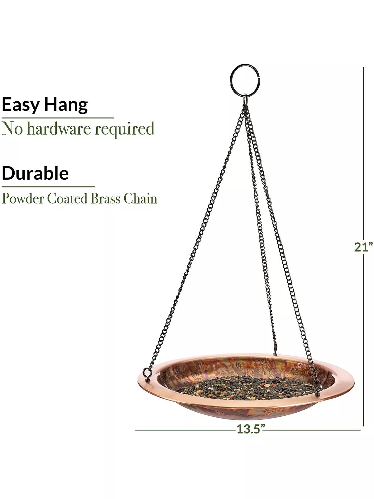 Attract birds elegantly with the 13" Pure Copper Hanging Bird Bath. The shallow basin and ridges provide a safe spot for birds to perch. A perfect gift for bird lovers, enhancing your outdoor space.