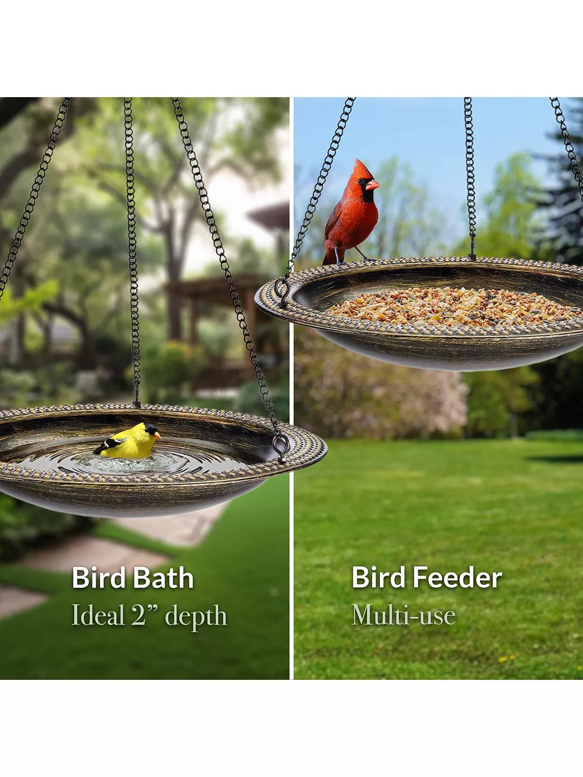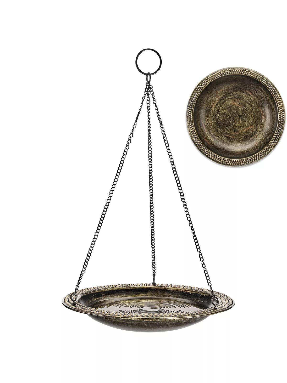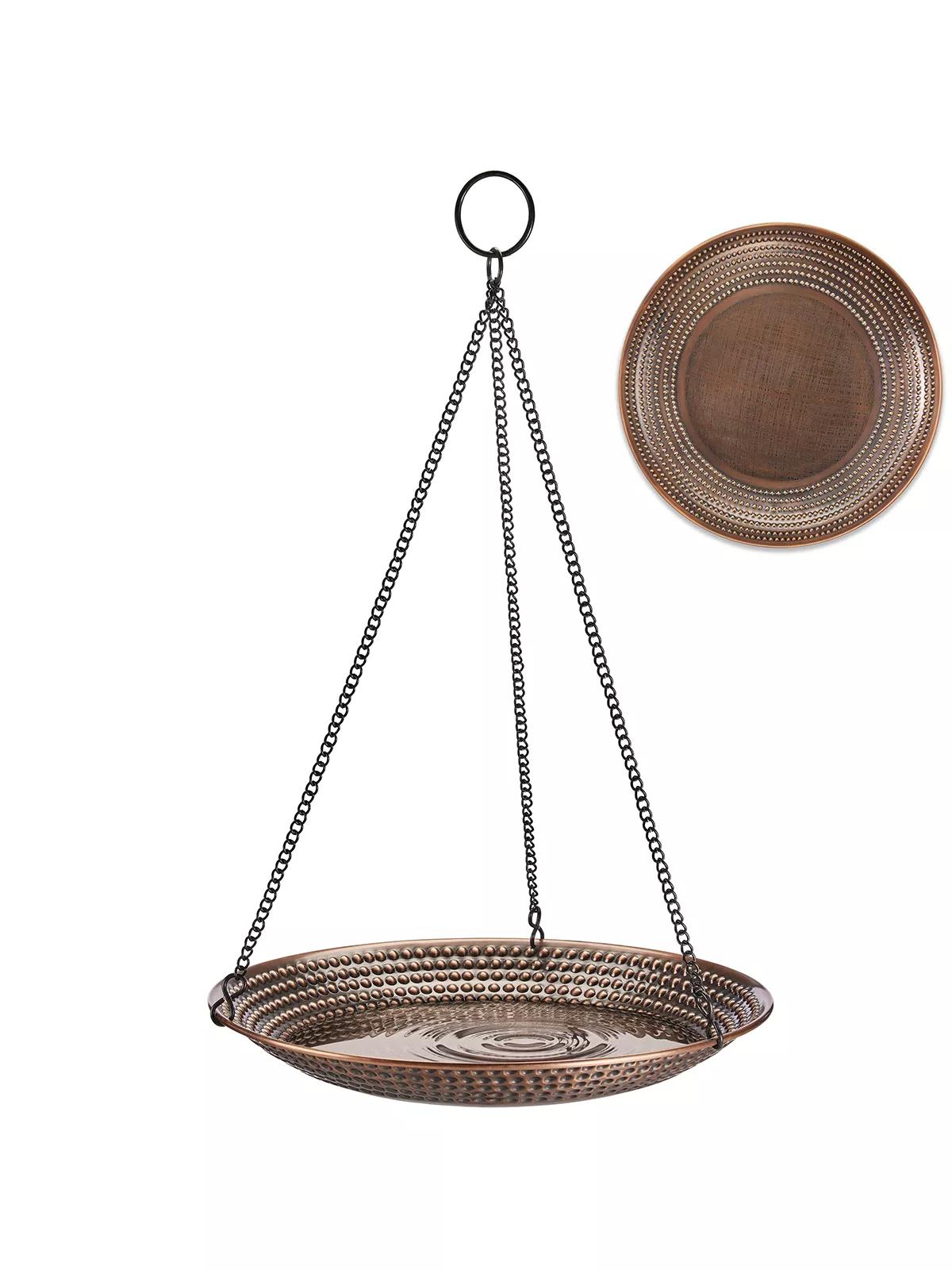Attract birds elegantly with the 13" Pure Copper Hanging Bird Bath. The shallow basin and ridges provide a safe spot for birds to perch. A perfect gift for bird lovers, enhancing your outdoor space.