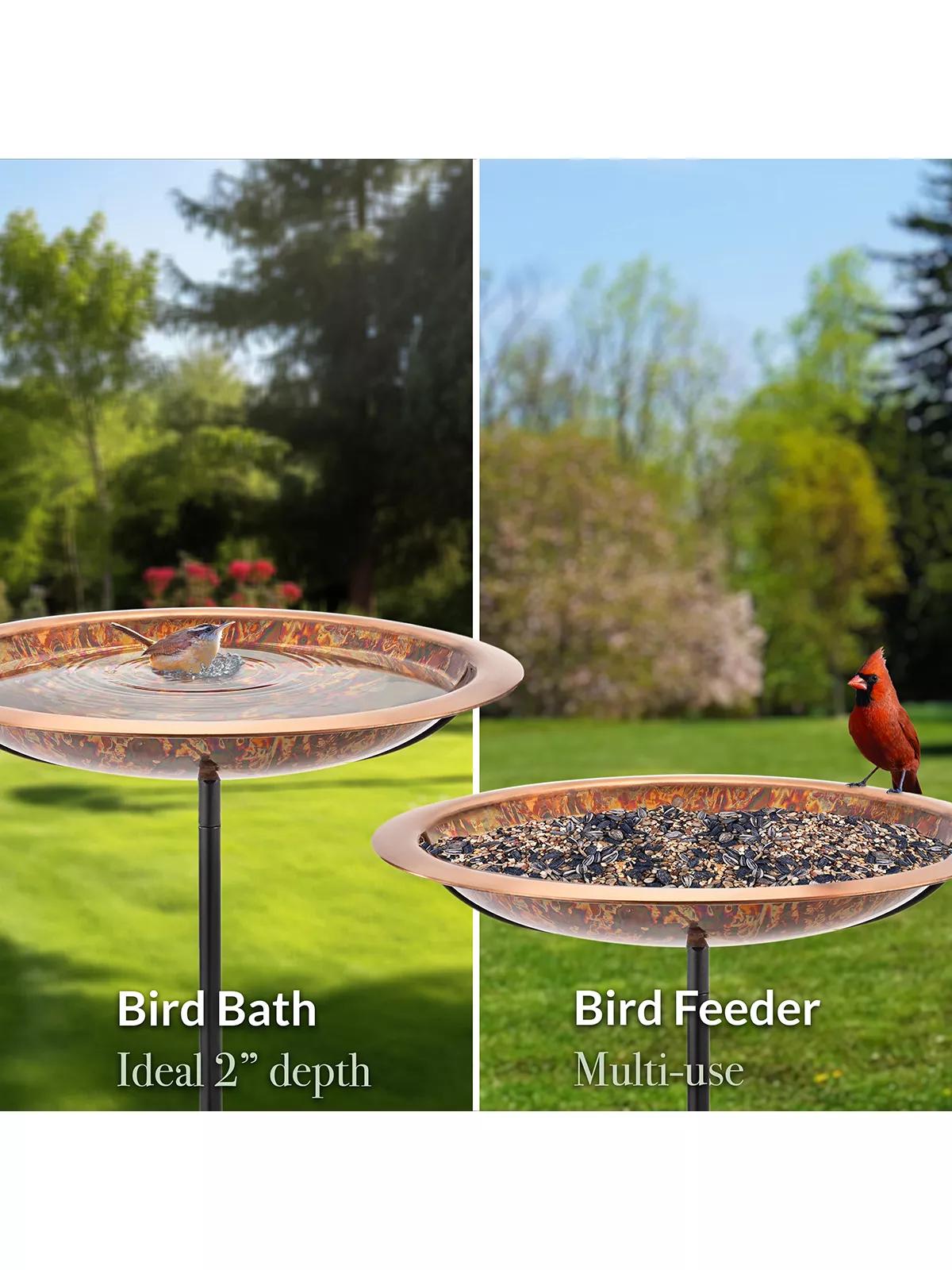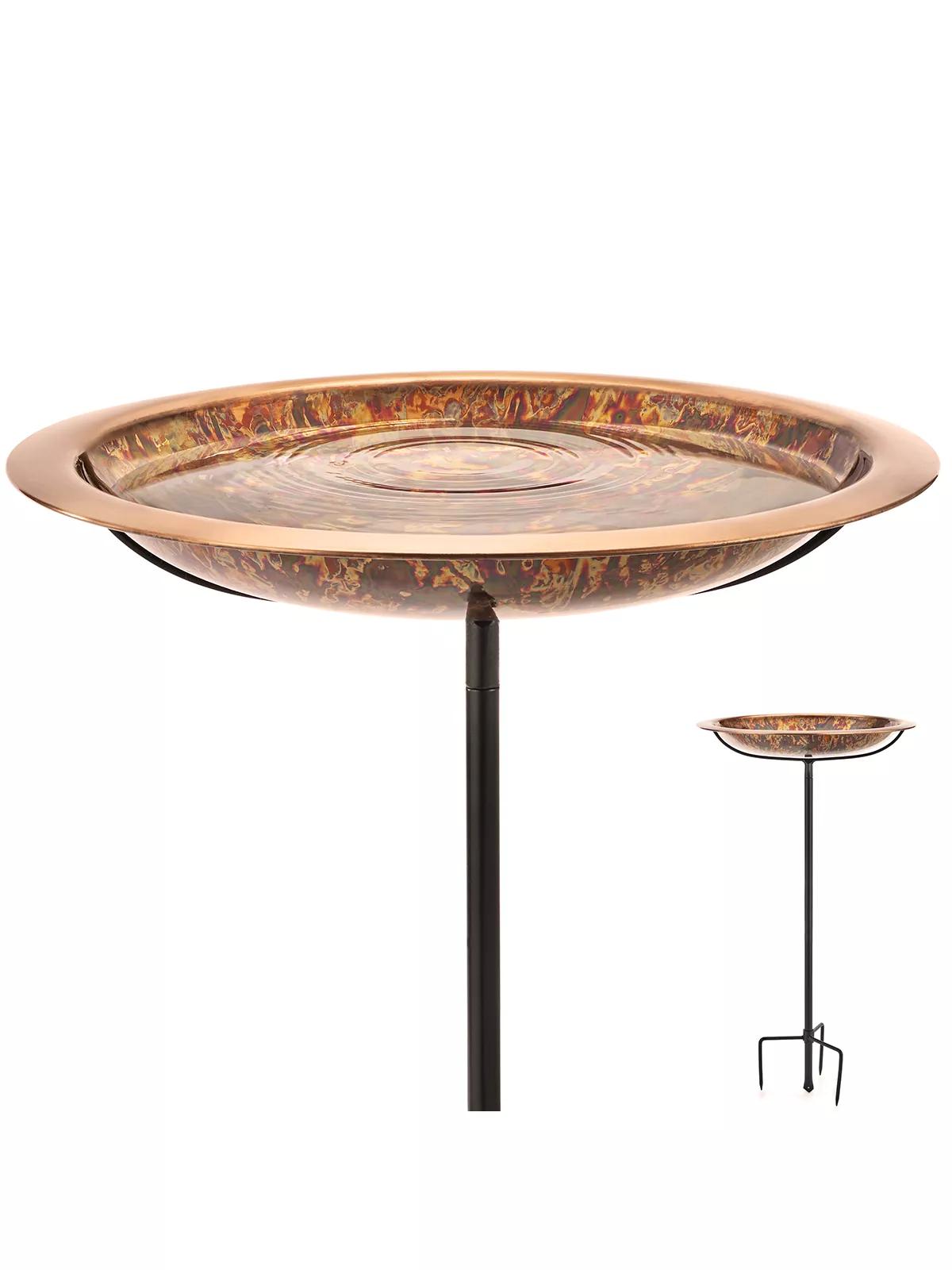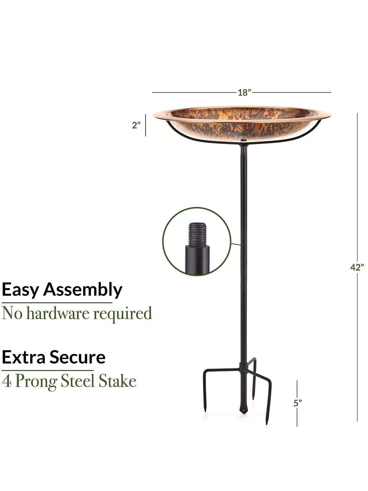 Enhance your outdoor allure with 18" Pure Copper Fired Torched Basin Bird Bath on a Garden Pole Stake. A charming gift for bird lovers, it creates a rustic oasis for birds to bathe and refresh in your garden.