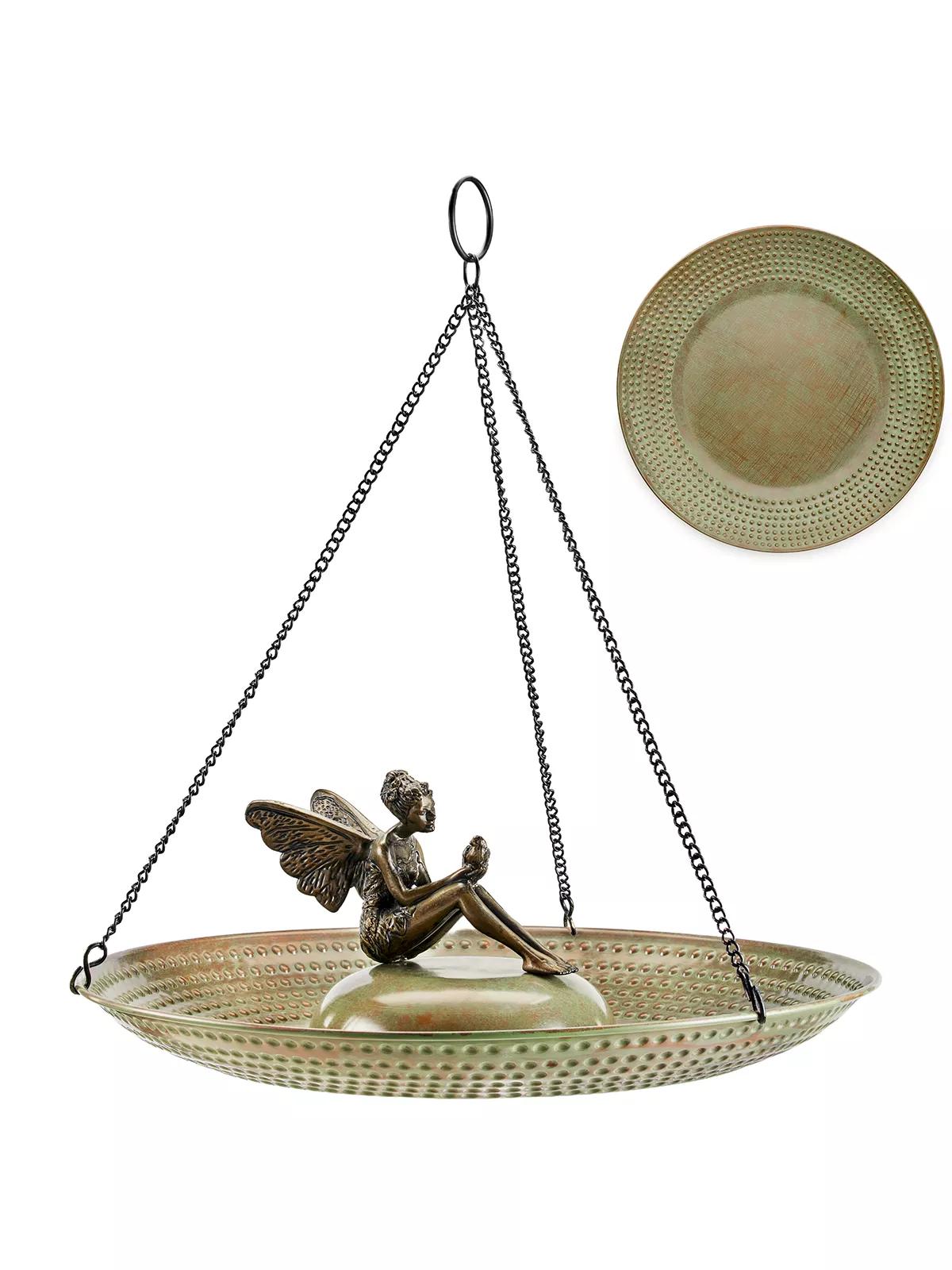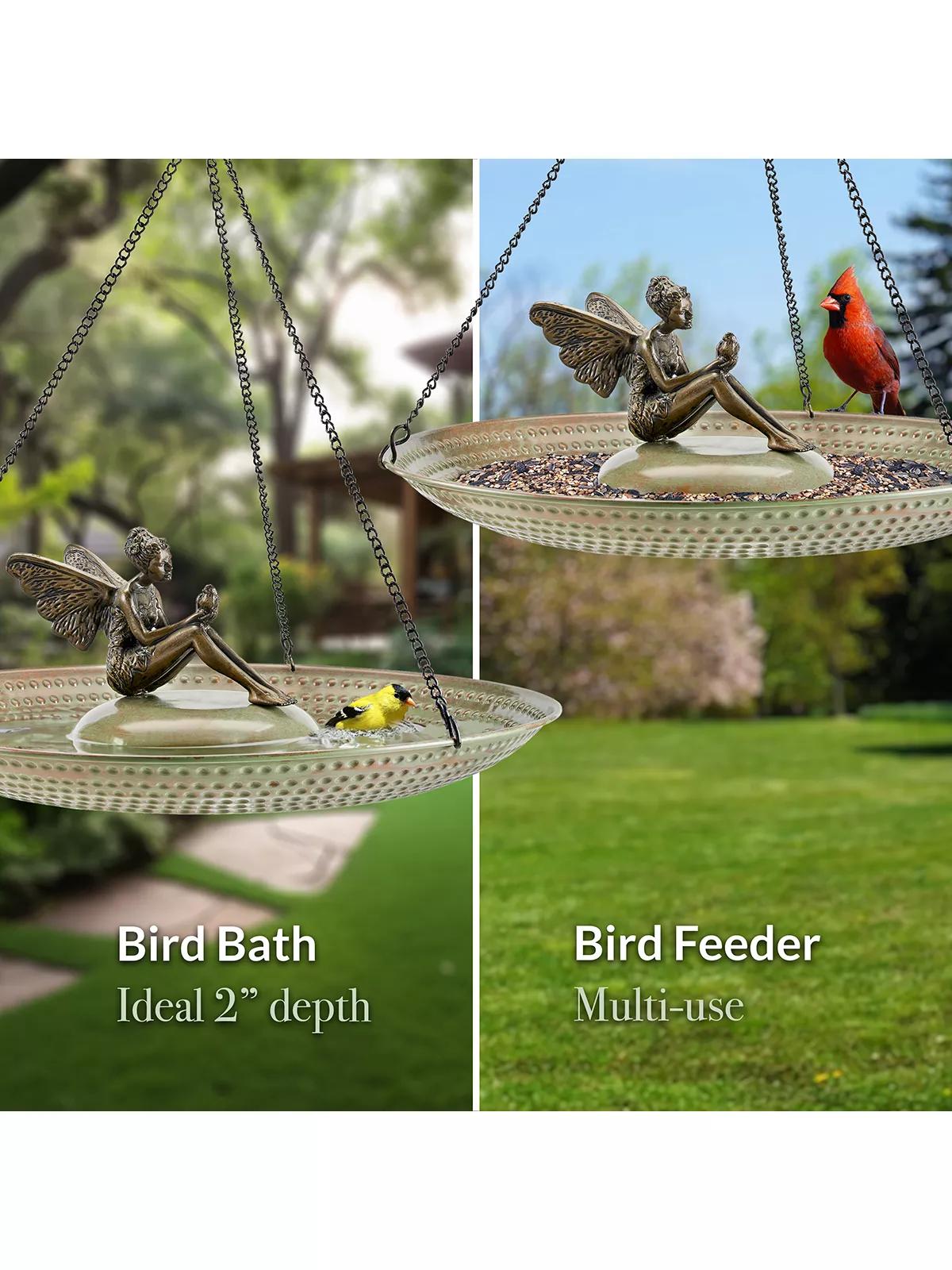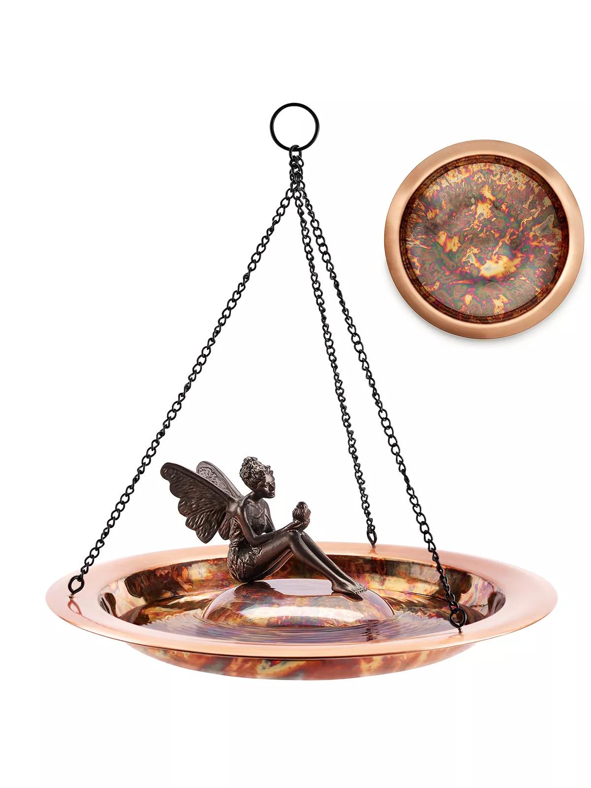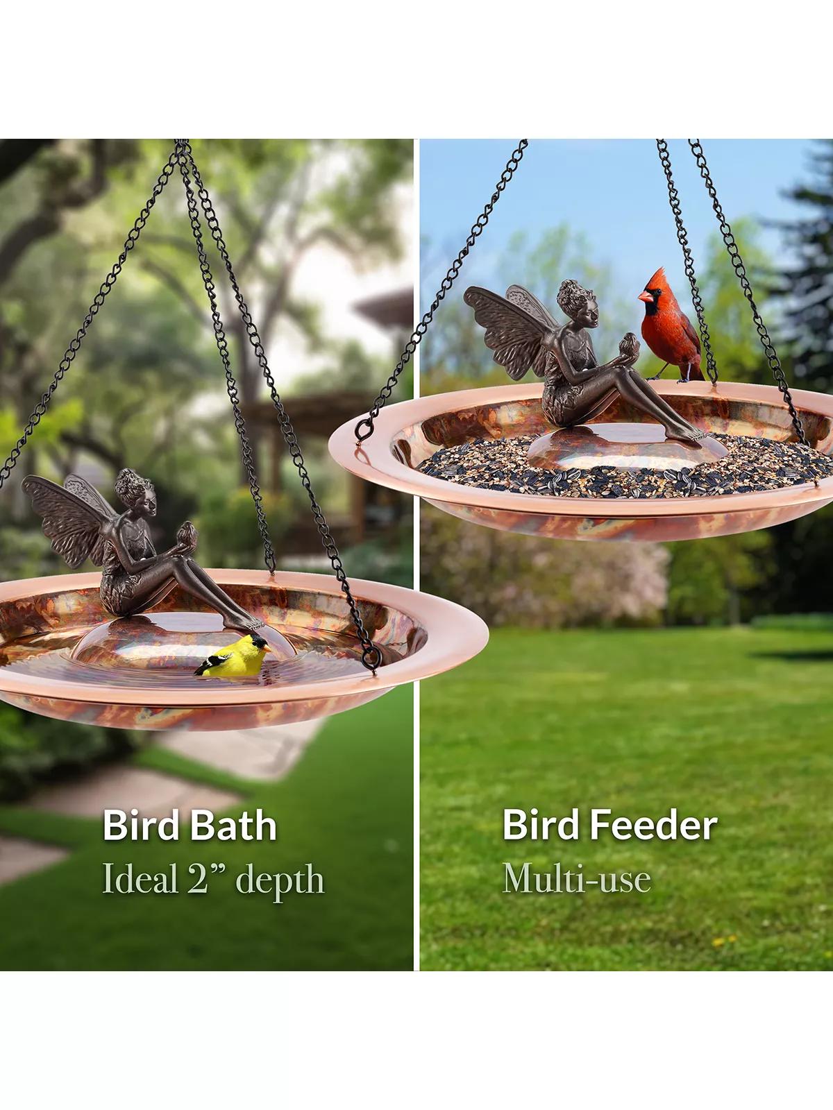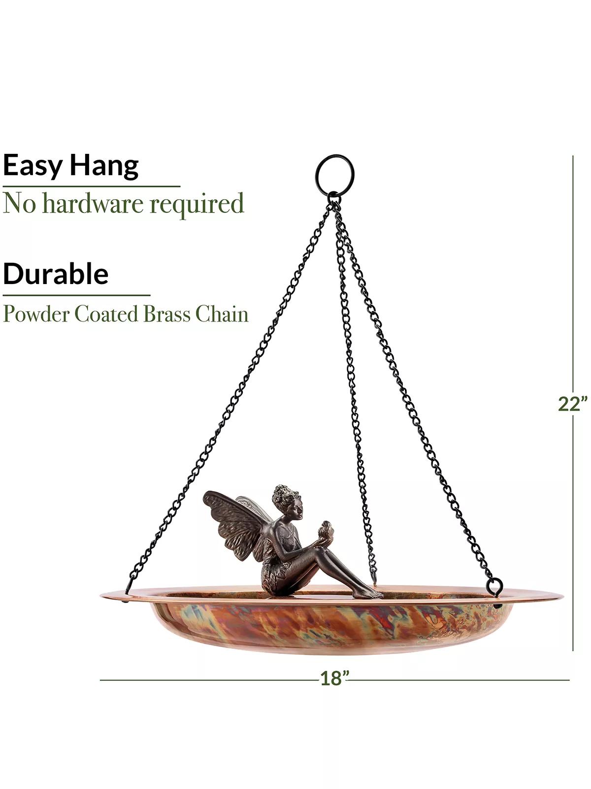 Attract birds gracefully with 18" Pure Copper Hanging Bird Bath. Its shallow basin and ridges provide a safe perch, inviting more birds to your outdoor space. Perfect for bird enthusiasts.