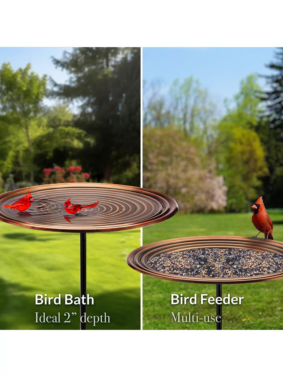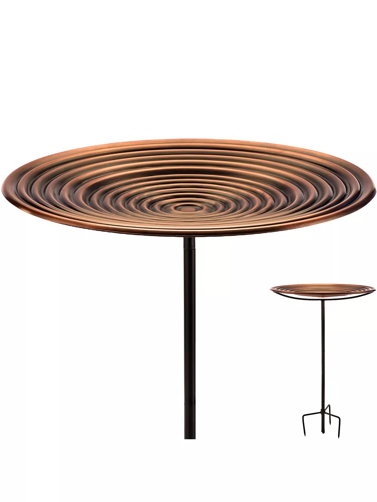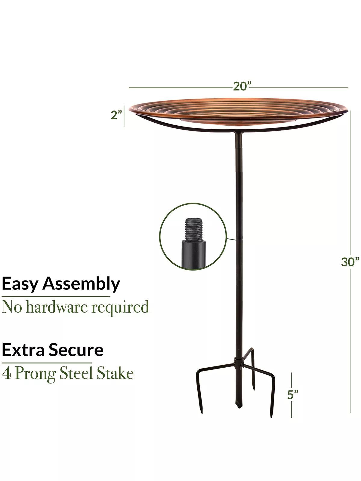 Attract birds effortlessly with the 20" Bronze Copper Garden Pole Stake Bird Bath. Its shallow basin and ridges provide a safe perch. Made of bird-safe copper, this birdbath enhances any outdoor space.