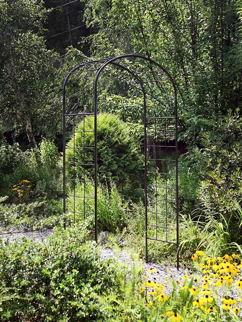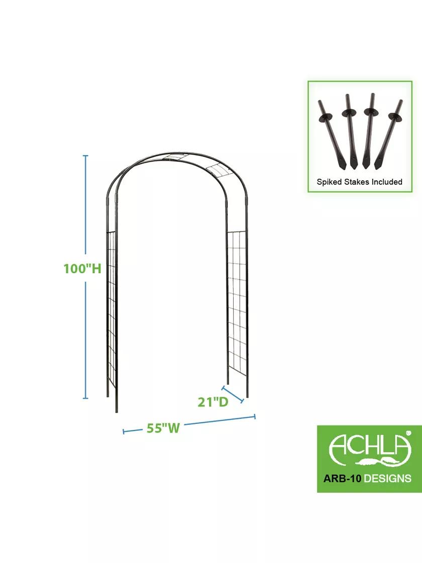 The Monet Arbor has a simple arched design with a grid-like lattice along the sides. It can be placed over a walkway or over a bench seat, with the sides of the arbor used to trellis climbing plants. All Achla garden arbors are designed to ship flat, with easy set-up using slip-in components, so no tools are necessary. Four spiked feet are included for installation. Wonderful for garden parties, weddings and events. Create an elegant garden entrance with the appearance of a handcrafted wrought-iron arbor, designed by Achla Designs.