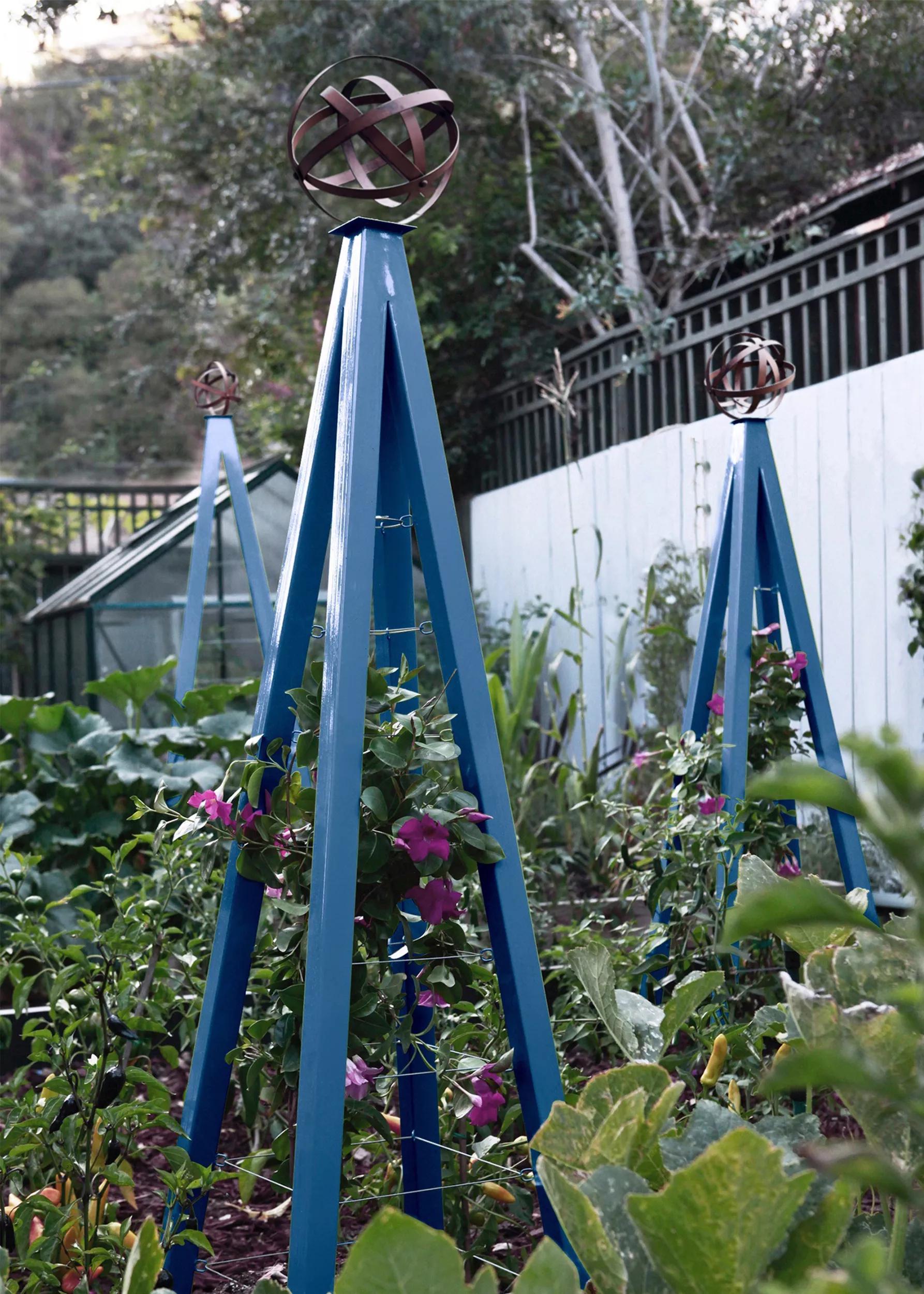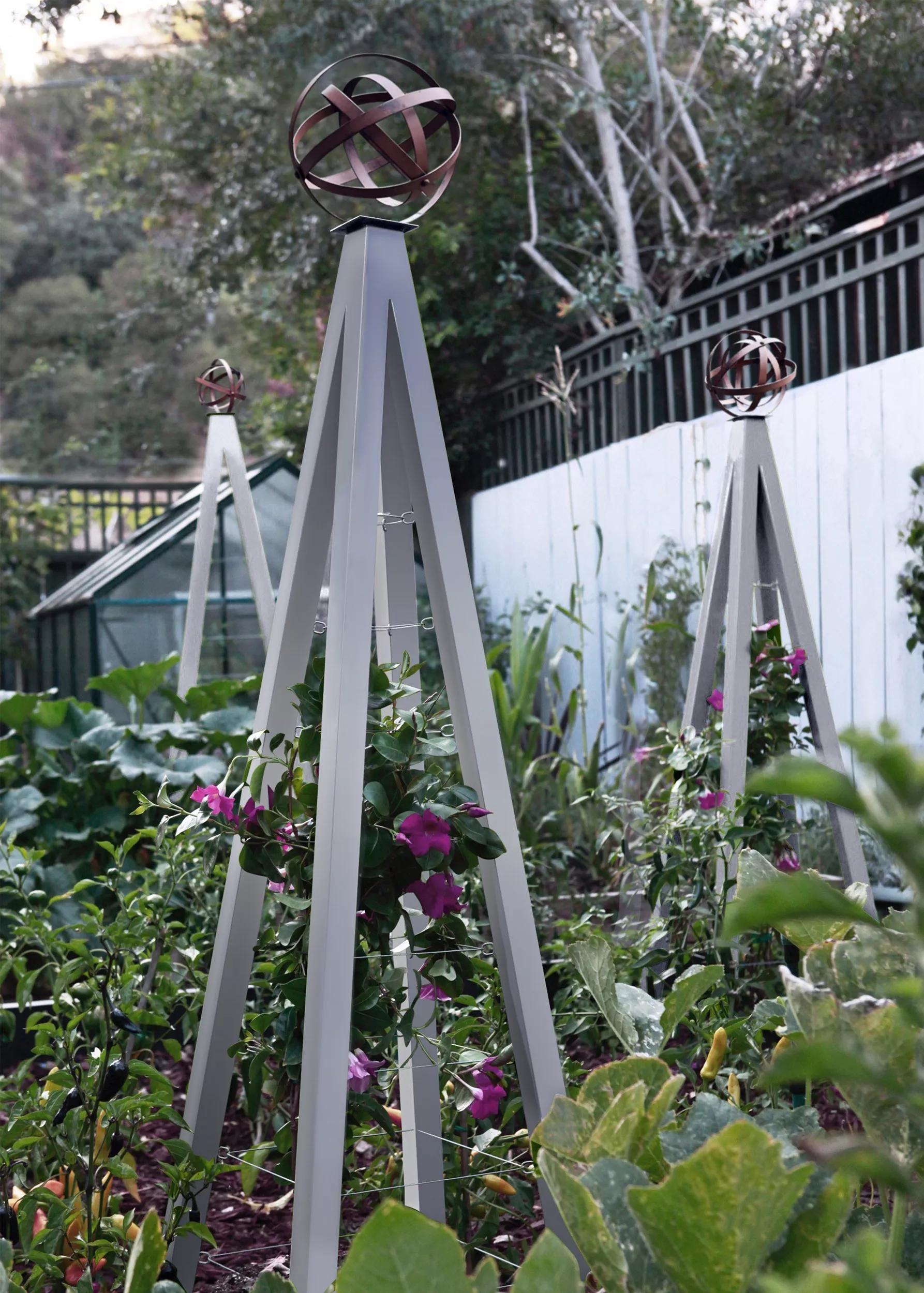 Create an instantly stylish garden with this contemporary obelisk topped with a sculptural steel sphere by Terra Trellis. Use to train plants that climb or need support, or place in the garden for simple architectural punch. During the off-season, this tuteur becomes a striking work of art. Designed and hand-crafted in the U.S. from steel and steel cable, finished in brilliant water-resistant powder-coated colors or a natural oxide patina. A sturdy structure for edible or ornamental gardens, great on the ground or on patios with containers. Very impactful in multiples.