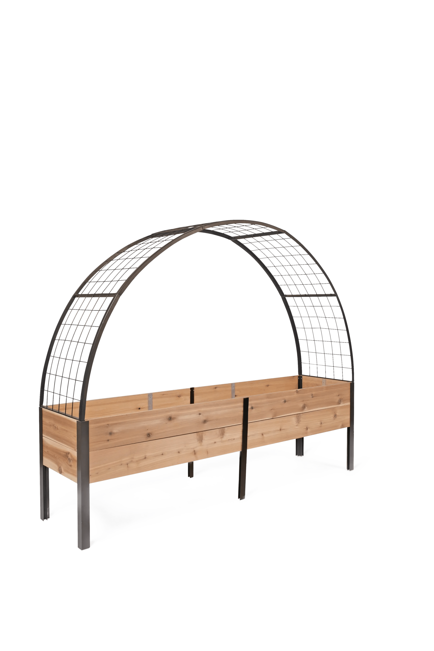 Unlock the full potential of your Vermont-made elevated planter box or raised bed by adding this trellising arch to it. Tall enough to grow tomatoes underneath, you can plant all your favorite herbs and veggies in the center and robust climbing plants at the sides. Or make a walk-through arch by placing it between two planter boxes or raised beds. Easy to install: just pop the corner caps off your elevated planter or raised bed and slide the trellis feet in.