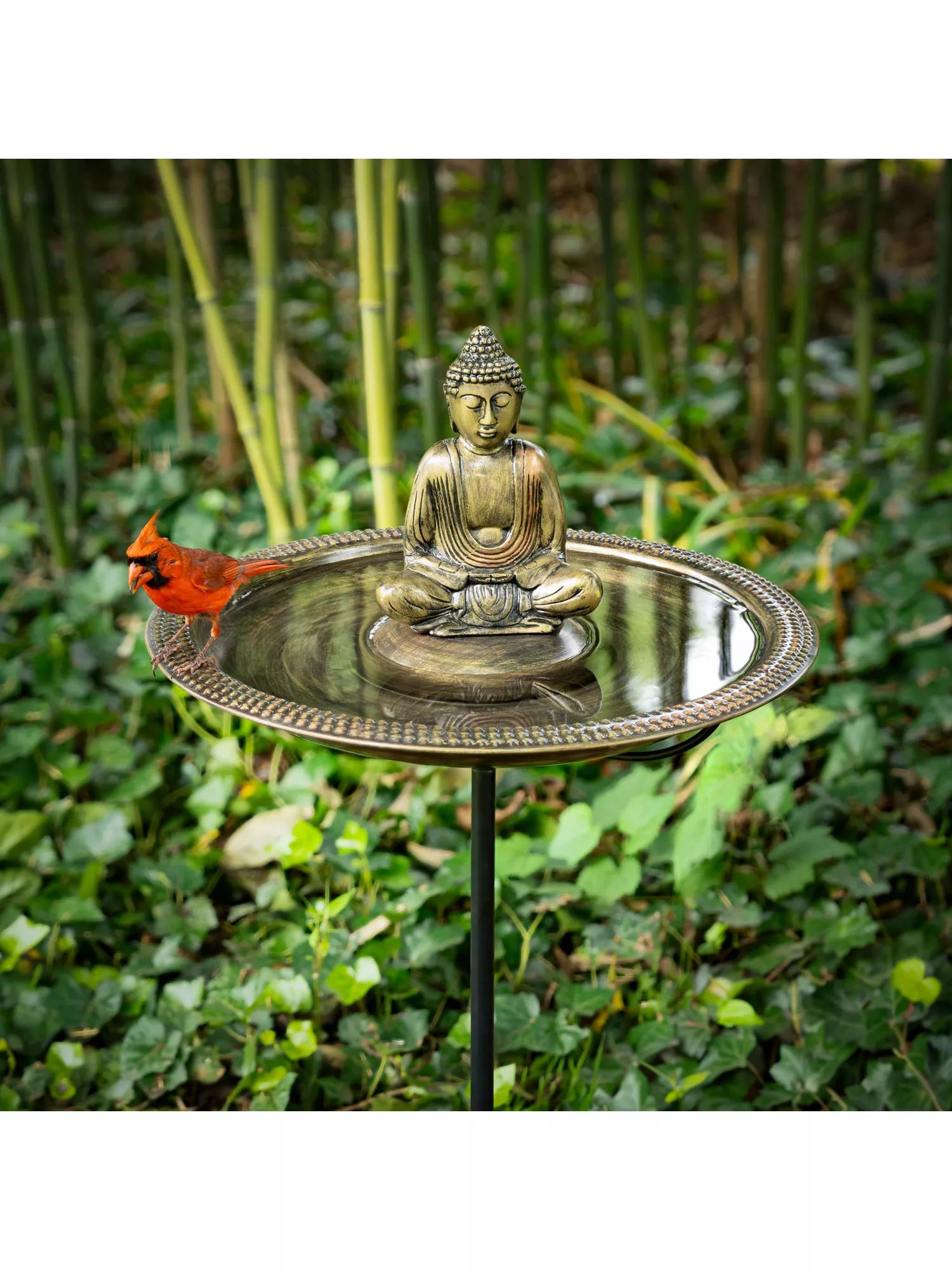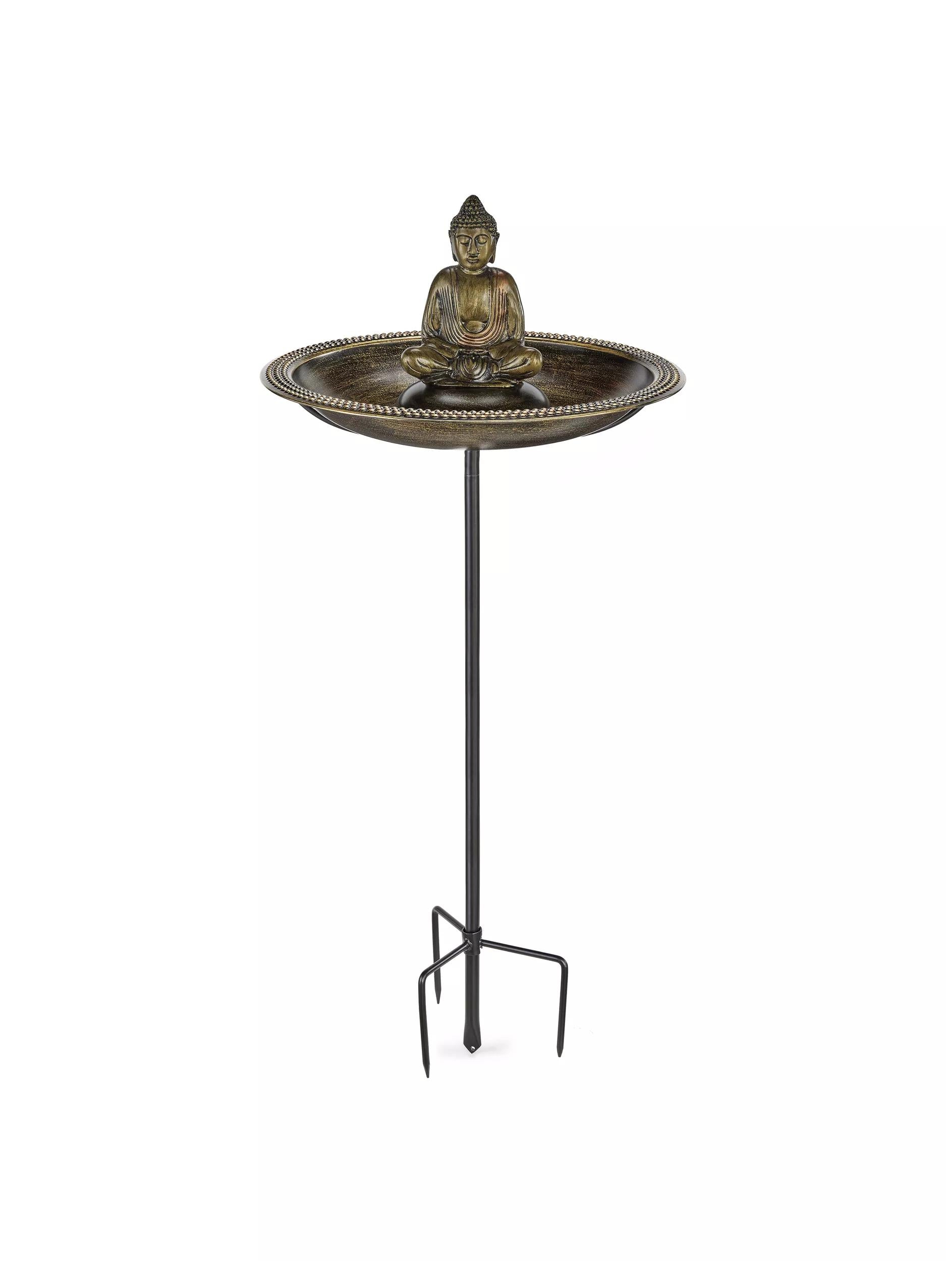 Meticulously designed by skilled American Artisans, This beautifully handcrafted copper birdbath finished in an aged bronze patina, is also the perfect bathing depth as advised by the esteemed National Audubon Society. The basin features an individually hand-punched, beaded rim for perching in between baths. Resting on a multi-pronged garden pole for sturdy support. For added interest add the meditating Buddha sitting on a central pedestal, crafted from highly durable cast aluminum coated in an aged brass finish. Face your birdbath’s Buddha towards your home or in a place you find calming and peaceful to reap the rewards of serenity! Easy to assemble and easy to clean.