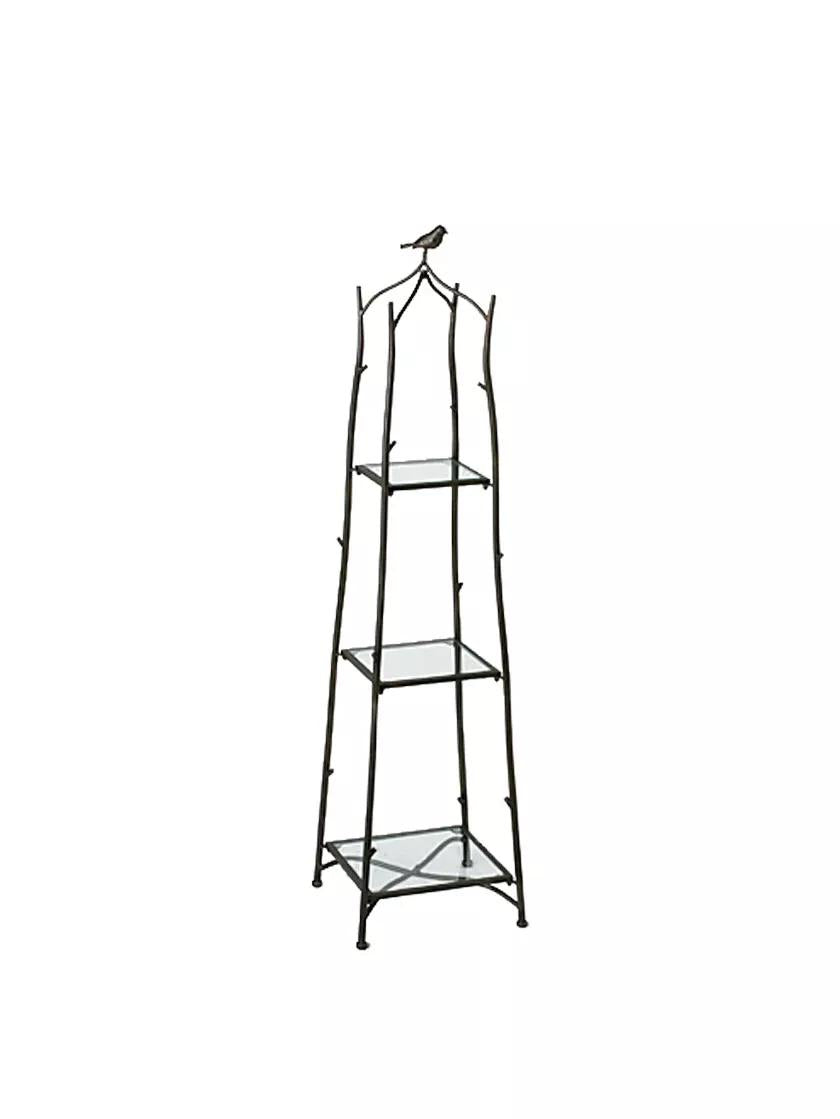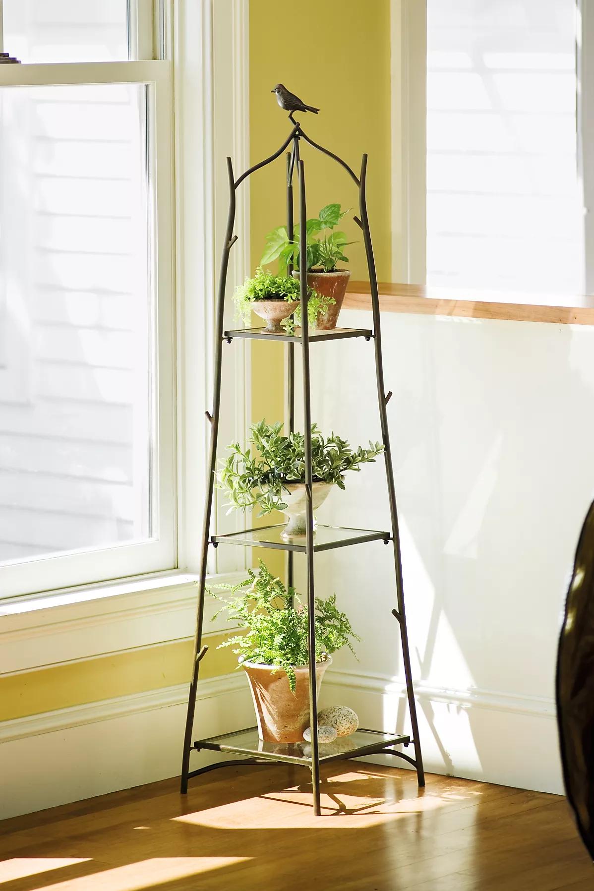 Plants and cherished curios take center stage when displayed on this handsome, nature-inspired plant stand. The sturdy steel frame has a rustic bronze finish and holds three glass shelves. The compact footprint fits easily into any indoor living space, and is ideal for use in a corner. 52" H; folds flat for easy storage. A customer favorite!