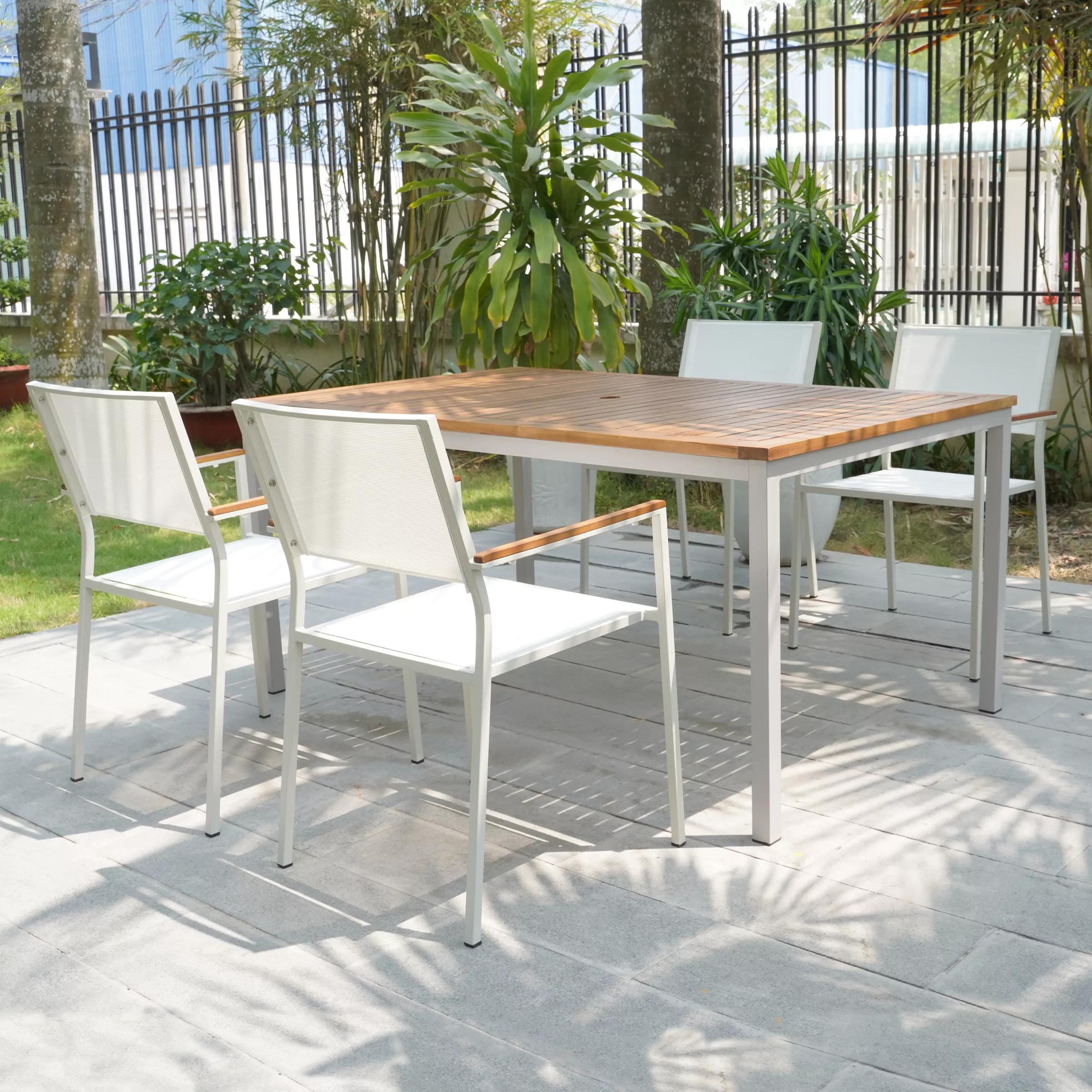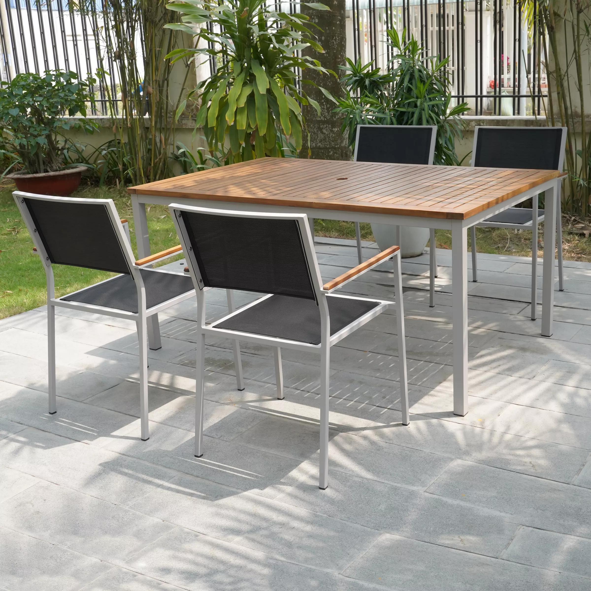Deck out your porch, patio, or yard with the Braylee five-piece dining set, complete with one rectangular table, and four sling seat arm chairs. Crafted with a galvanized steel frame, each design sports a powder-coated finish to resist rust and weather. The tabletop is made from acacia wood.