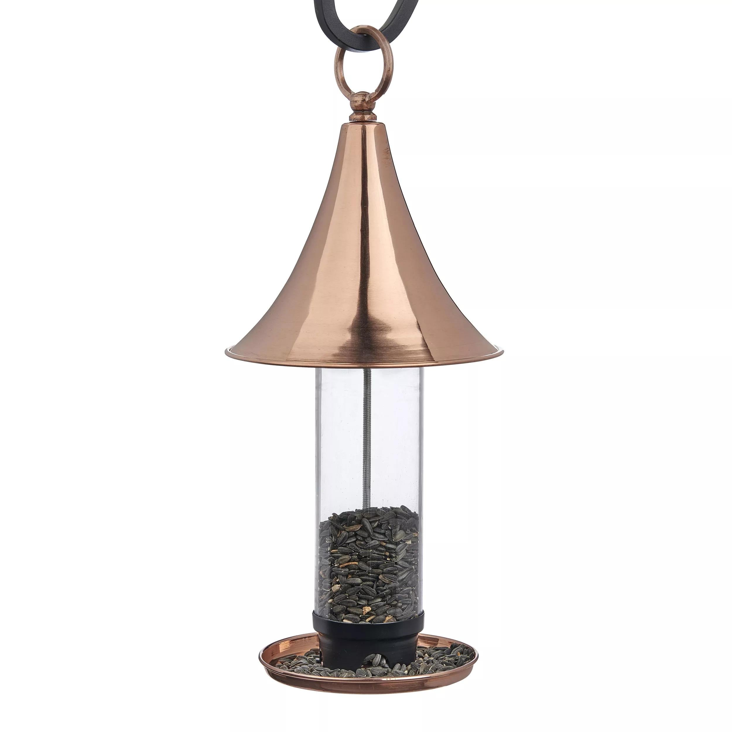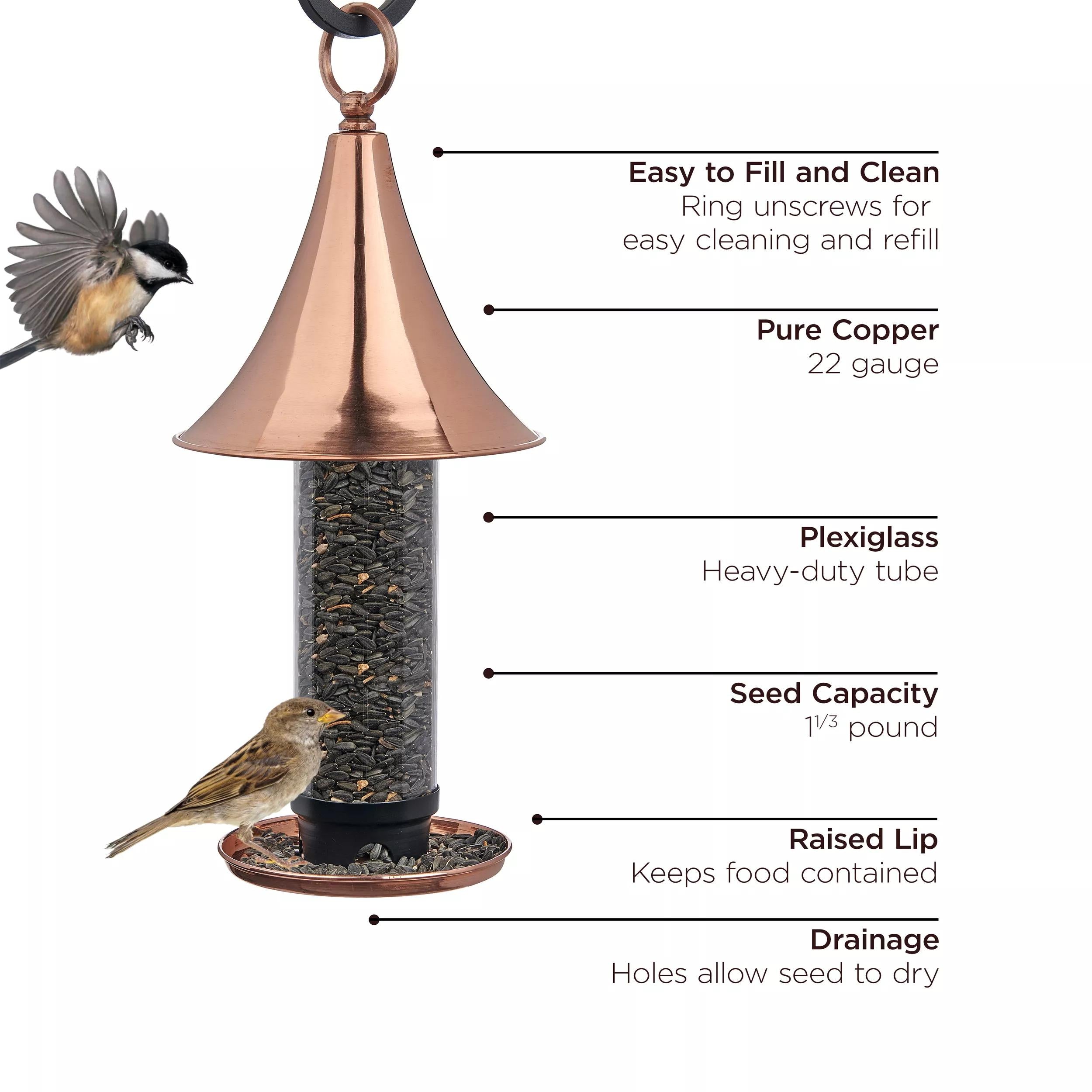 The all-new Castella Bird Feeder combines the classic lines of Old World design with a contemporary flair. This easy-to-clean tube feeder, is topped with a polished copper turret roof that soars to a graceful peak. The lipped feeding tray — with convenient drain holes built in — prevents waste and keeps seed dry for your feathered friends. . Holds 1-1/3 pounds of seed.