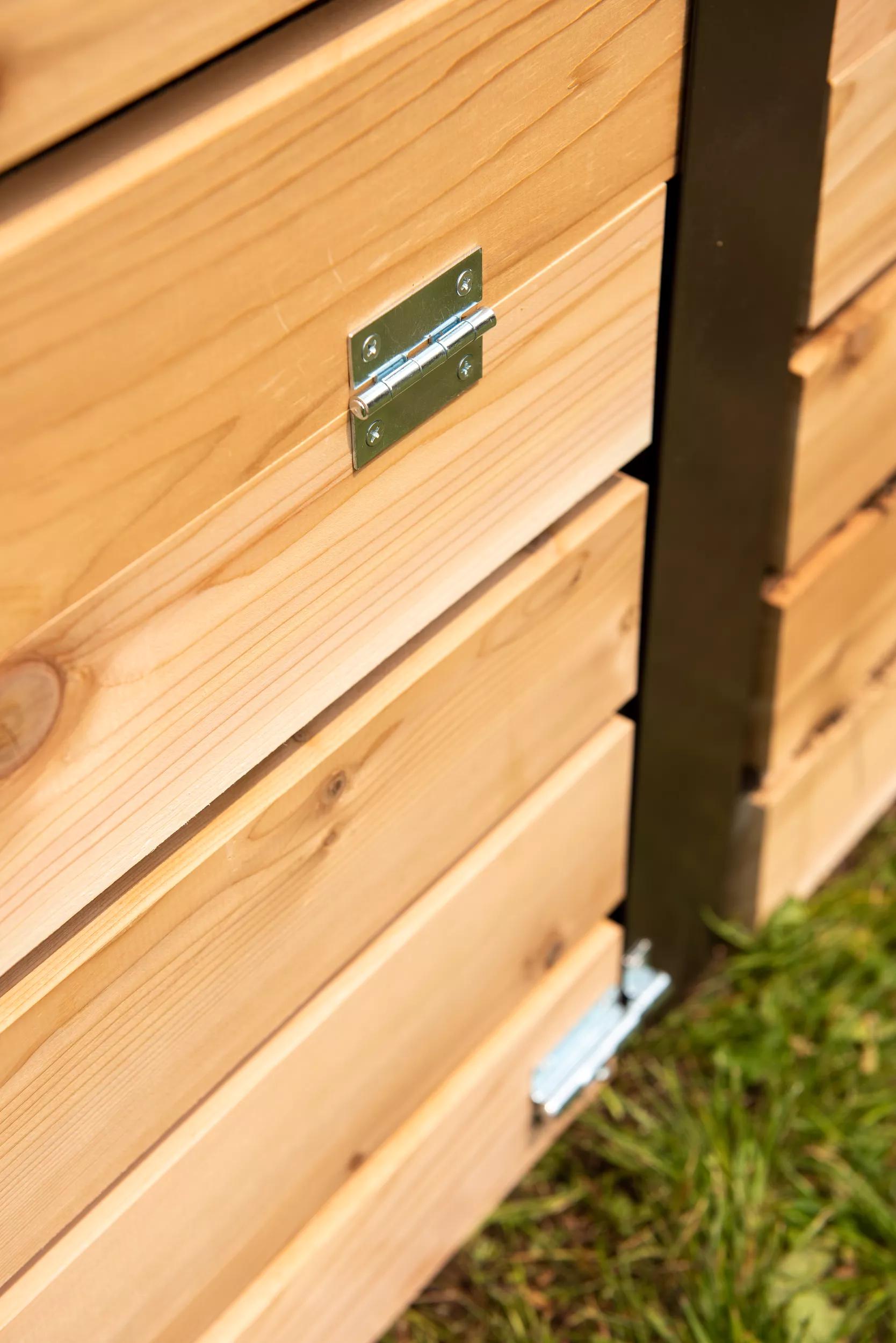 Solidly constructed from naturally pest- and rot-resistant lumber and framed by our rust-proof, industrial strength Lifetime aluminum corners, the functional and fashionable Cedar Three-Bin Composter is built to last, with a generous 110-gallon capacity in each bin. Slatted design allows good air and water flow to help the composting process along. Hinged lids give you easy access for adding and turning materials. Front access panels lift up and stay in place so you can move batches and harvest garden-ready compost. Secure latches keep hungry or curious critters out.