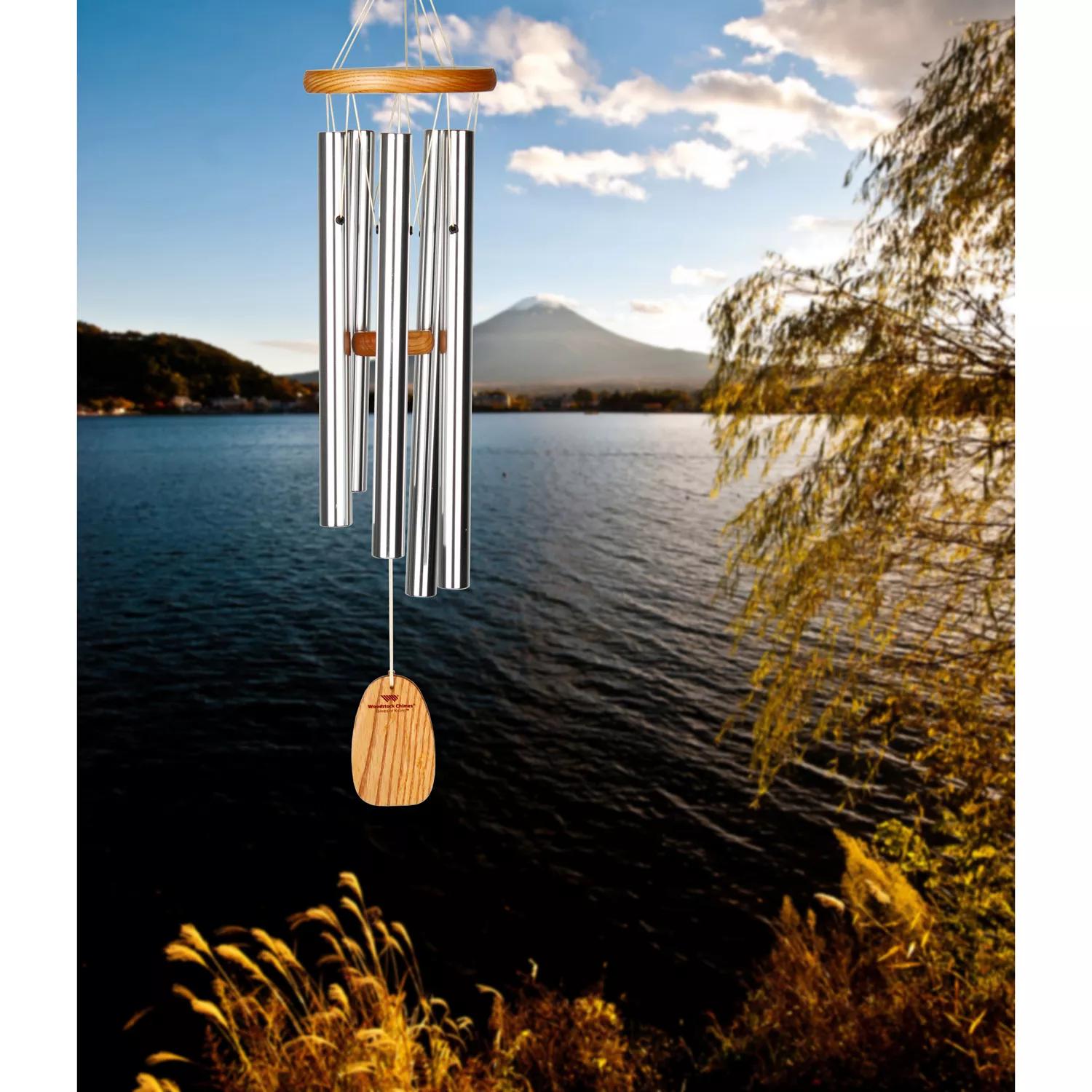 This graceful and spirited wind chime, from world-famous Woodstock Chimes®, is named for the Chionin Buddhist temple in Kyoto, which houses one of the largest ringing bells in the world. It takes 17 monks to ring the 74-ton bell, 16 of them to raise the giant wooden hammer by pulling it away from the bell with hanging ropes, while the 17th monk rides the hammer, pushing off with his legs in the split second before impact. It only takes a gentle breeze to play these Chimes of Kyoto™ and you will have years of pleasurable sounds reminiscent of the Japanese koto, the musical instrument from which it gets its beautiful tuning.