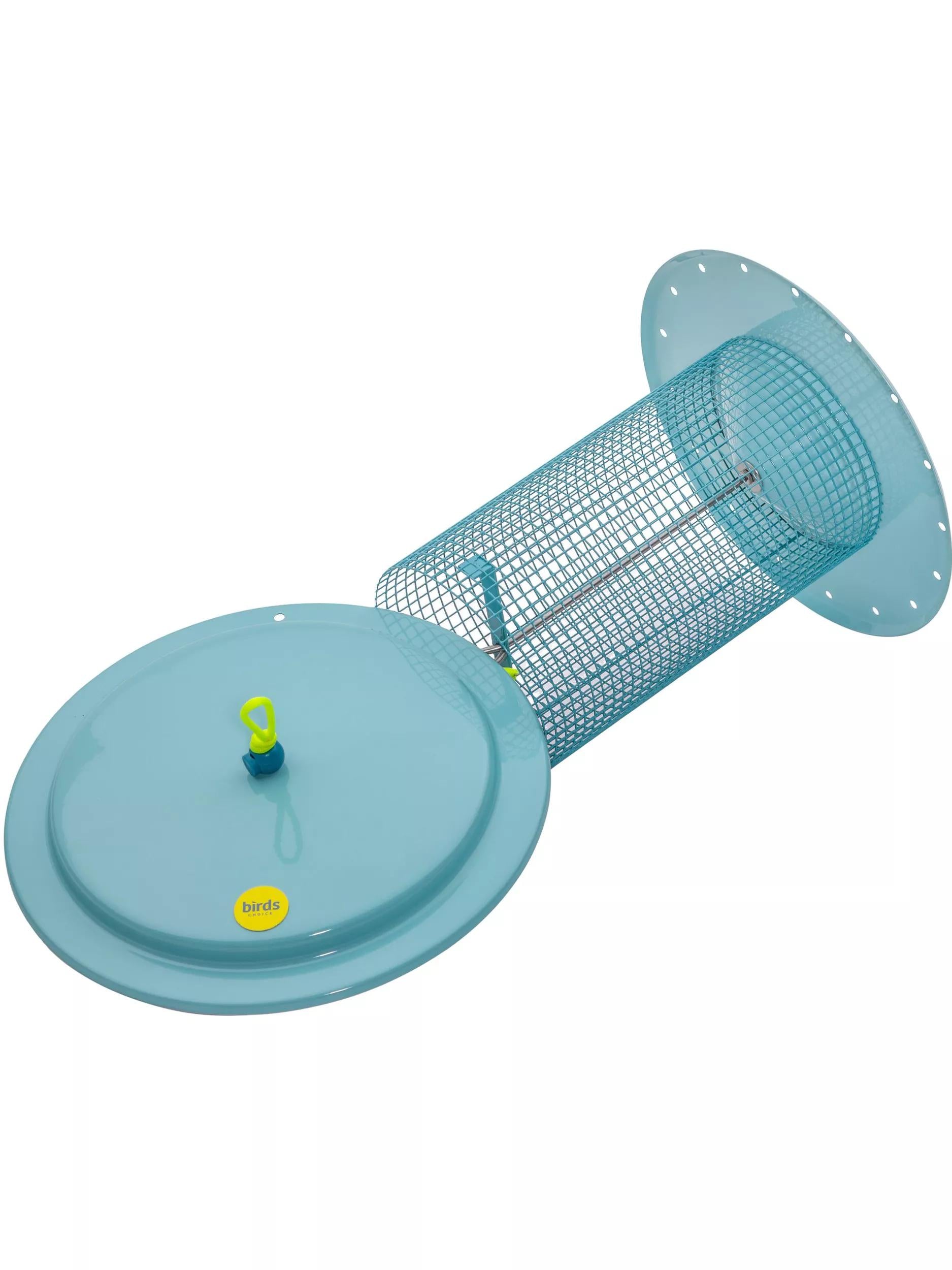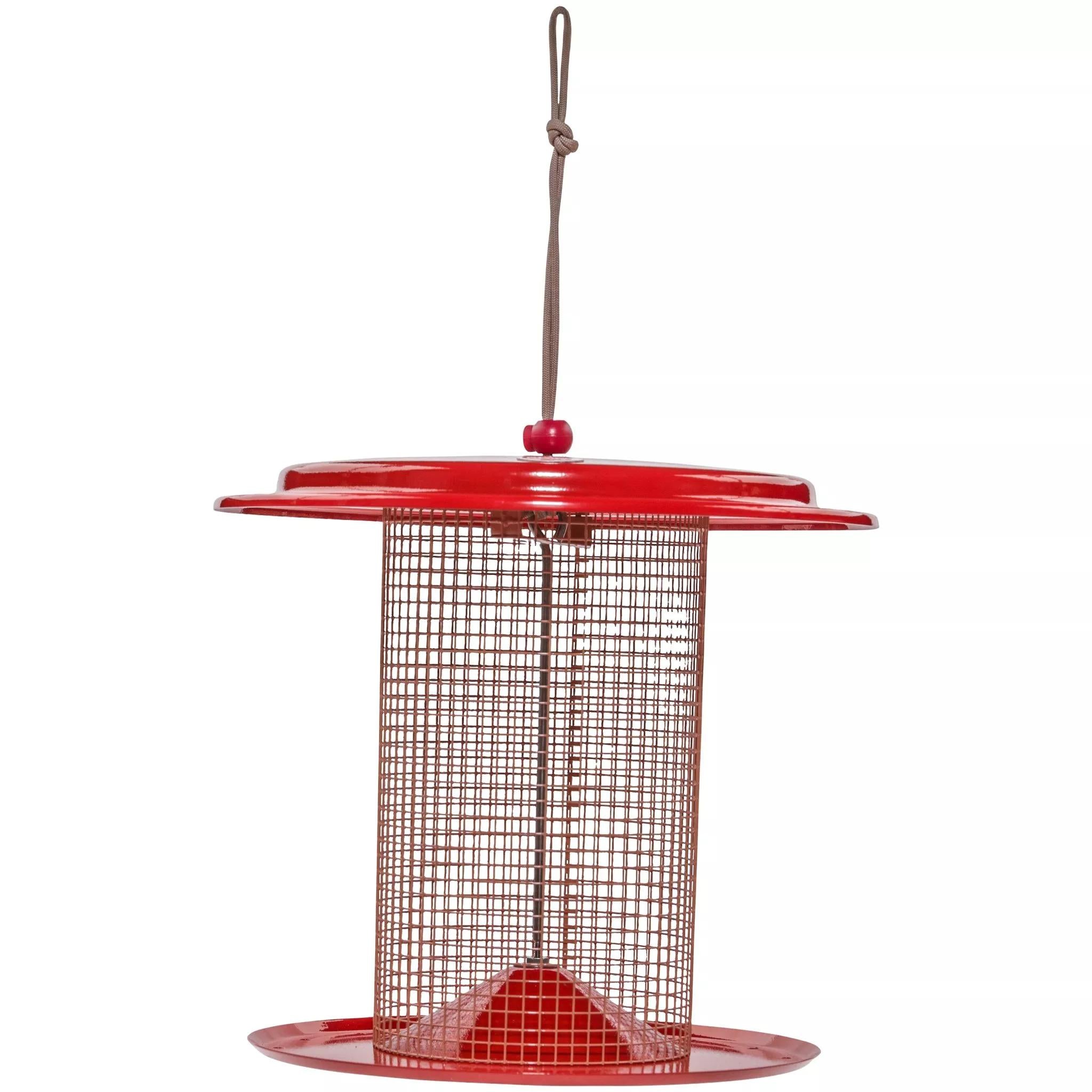 Made in the usa, all metal construction, powder coated top, bottom and screen, center seed diverter, drainage holes in base, paracord hanger with cordlock, capacity: approximately 3 lbs. of seed, mixed or sunflower. Attracts chickadees, cardinals, purple finches, grosbeaks, titmice, nuthatches, goldfinches, house finches, sparrows.