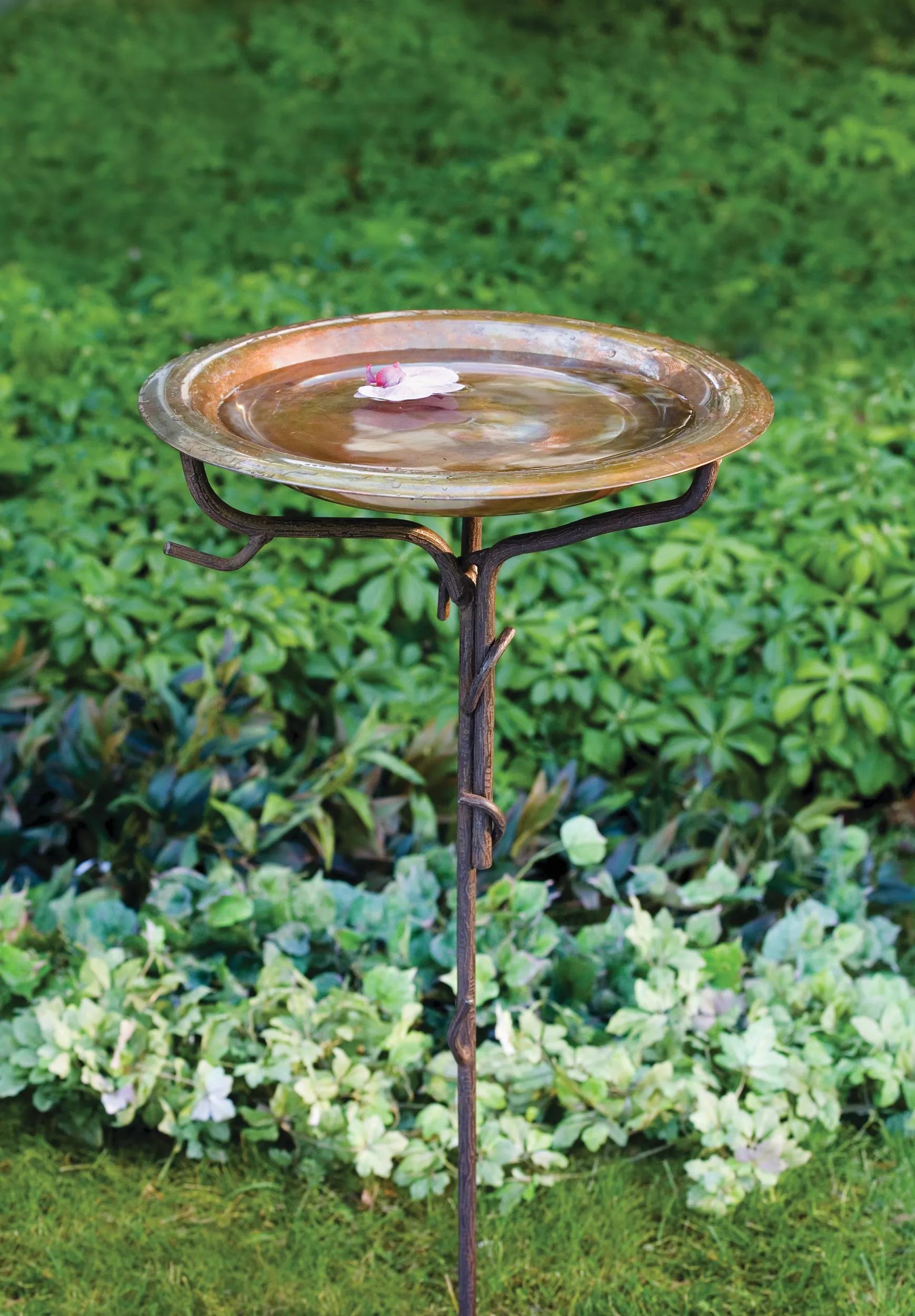 Solid Copper birdbath with twig-like base for the birds to enjoy. Over time recycled metal products will rust if not treated so we recommend applying an additional coat of polyurethane periodically.