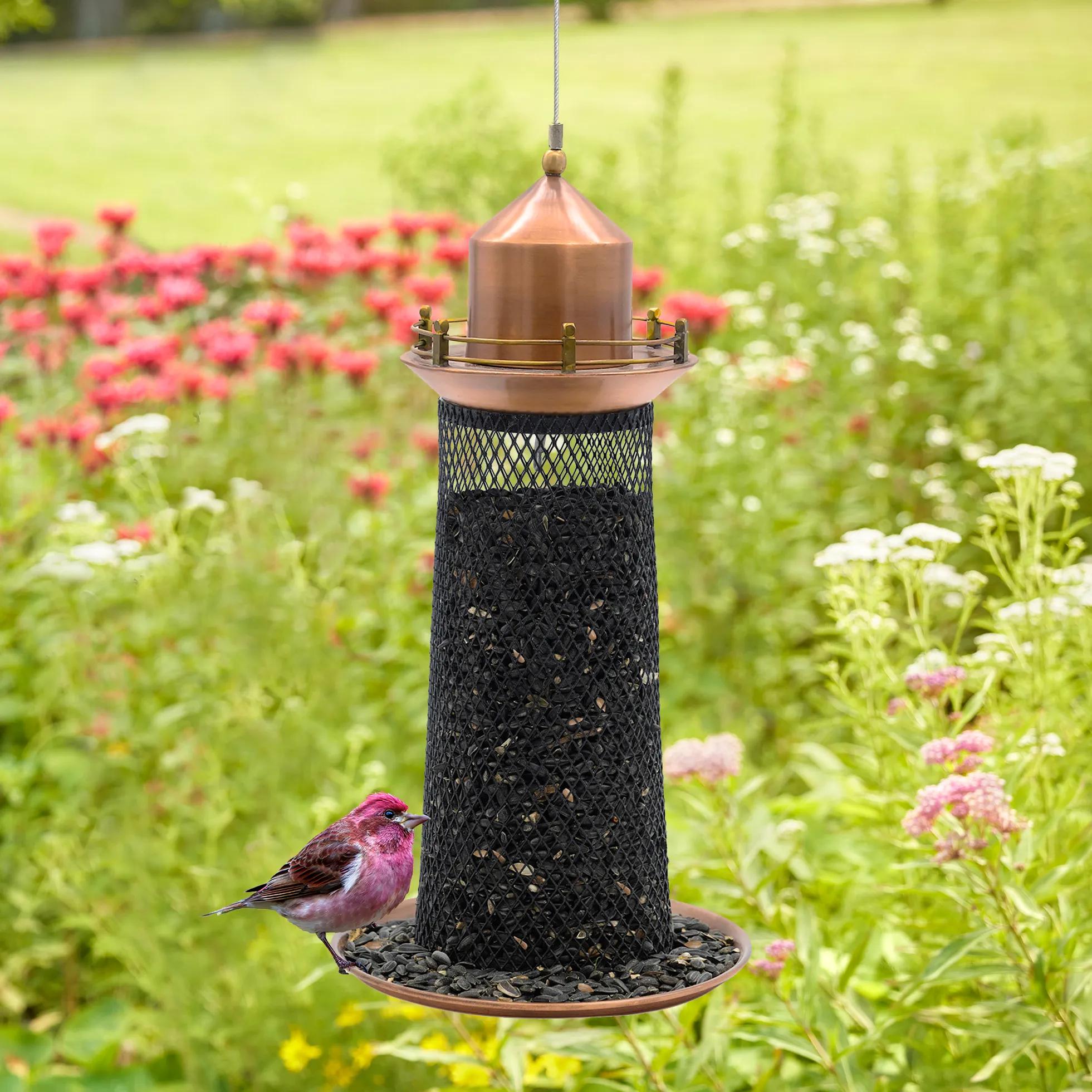 - PURE COPPER - the lighthouse bird feeder is made of pure copper with a bronze finish, and features a pure brass railing around the catwalk