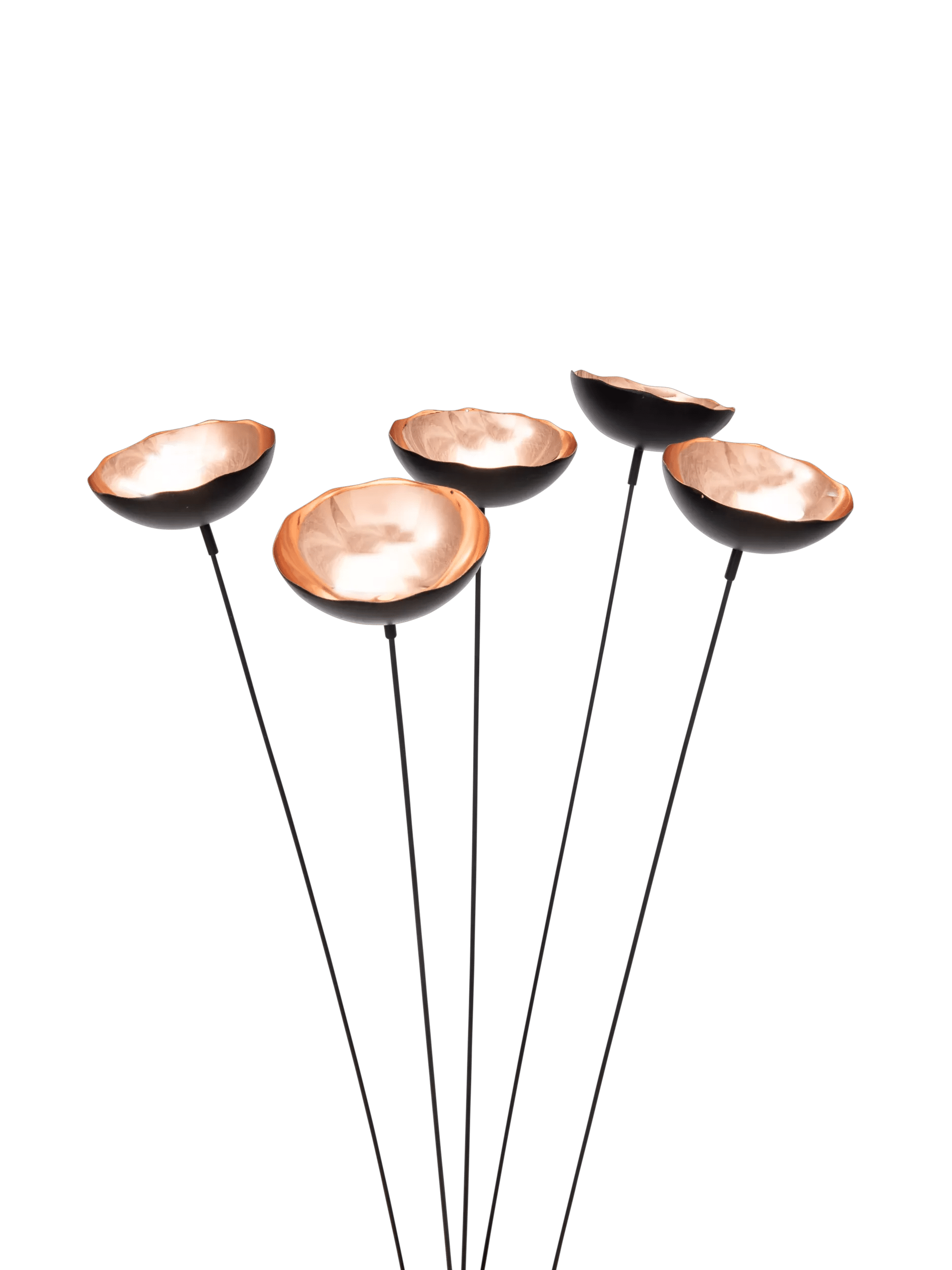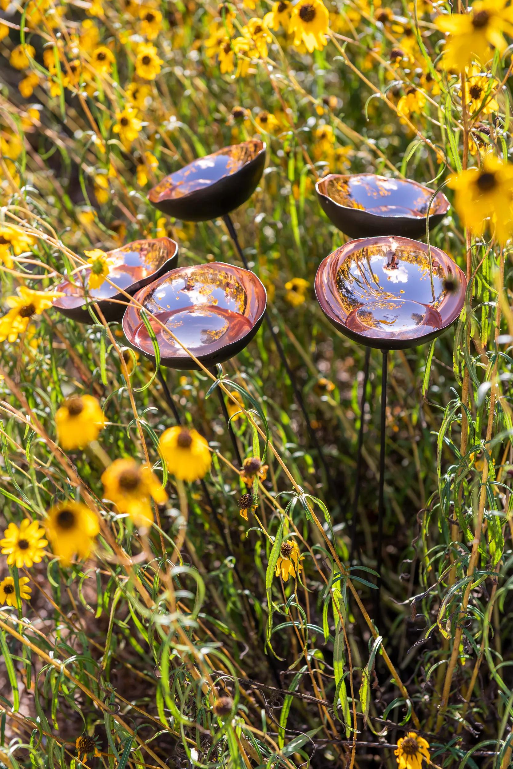 Add height, movement, and color to bring your yard to life. Simple and simply charming, this set of 5 Copper Poppy Sways animate your garden with motion and light, providing a focal point for your landscape, and reacting and interacting with the elements. On clear days, the shiny copper-plated cups reflect the sun’s rays, brightening your garden with an alluring added sparkle. Gently swaying in the wind, they take on a meditative and entrancing natural rhythm. When it rains, they catch water, attracting curious and thirsty birds in the days that follow.
