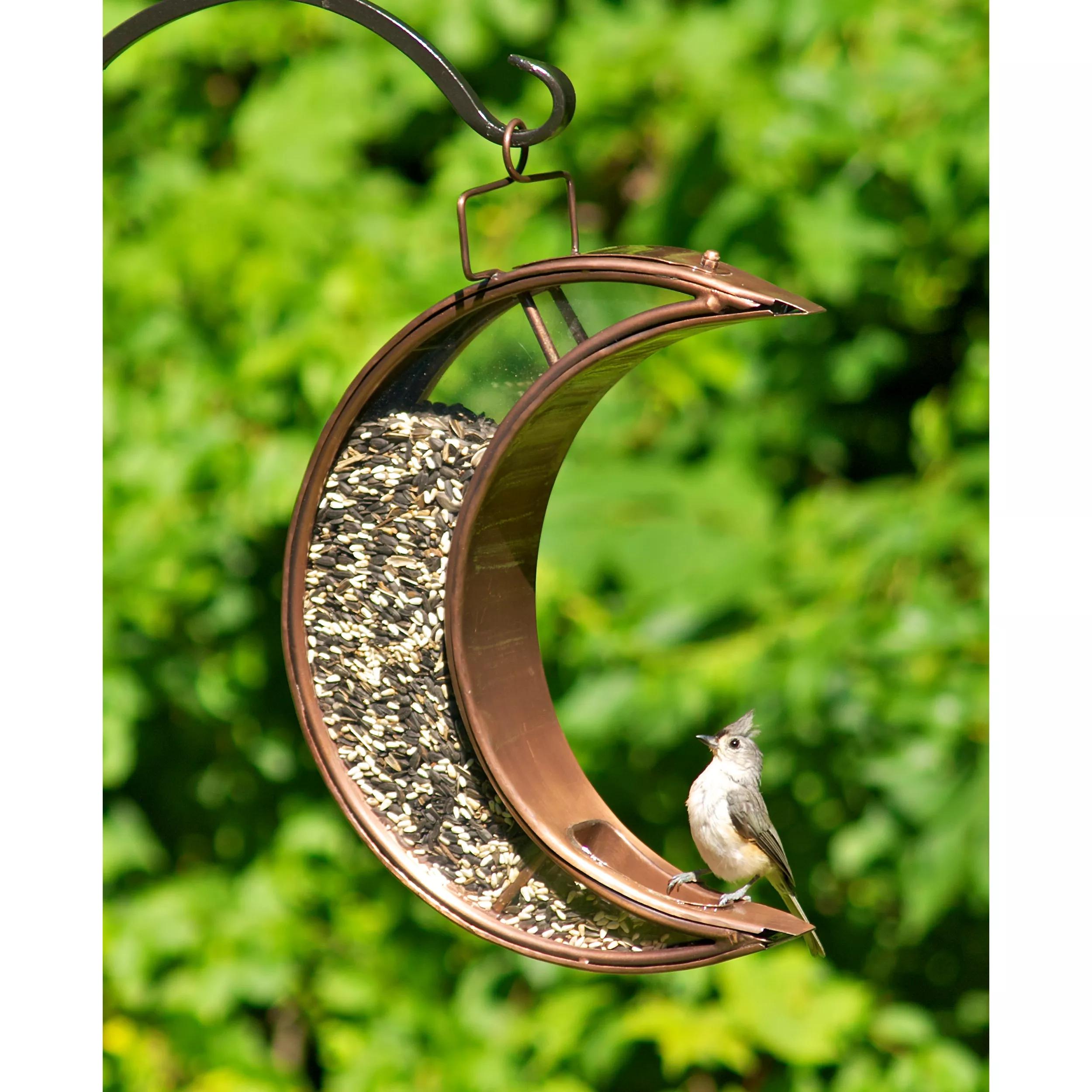 Make it easy for birds to eat everything under the sun — and moon — with the Crescent Moon Bird Feeder by Good Directions. The unique crescent shape invites birds to perch and eat in comfort, so that bird lovers can enjoy more of their favorite activity. The long-lasting copper finish and durable plexiglass make this feeder the perfect addition to any garden setting. The feeder is easy to hang, and because it's also see-through, it's easy-to-know-when-to-fill! It is sized to hold a generous 4 pounds of seed!