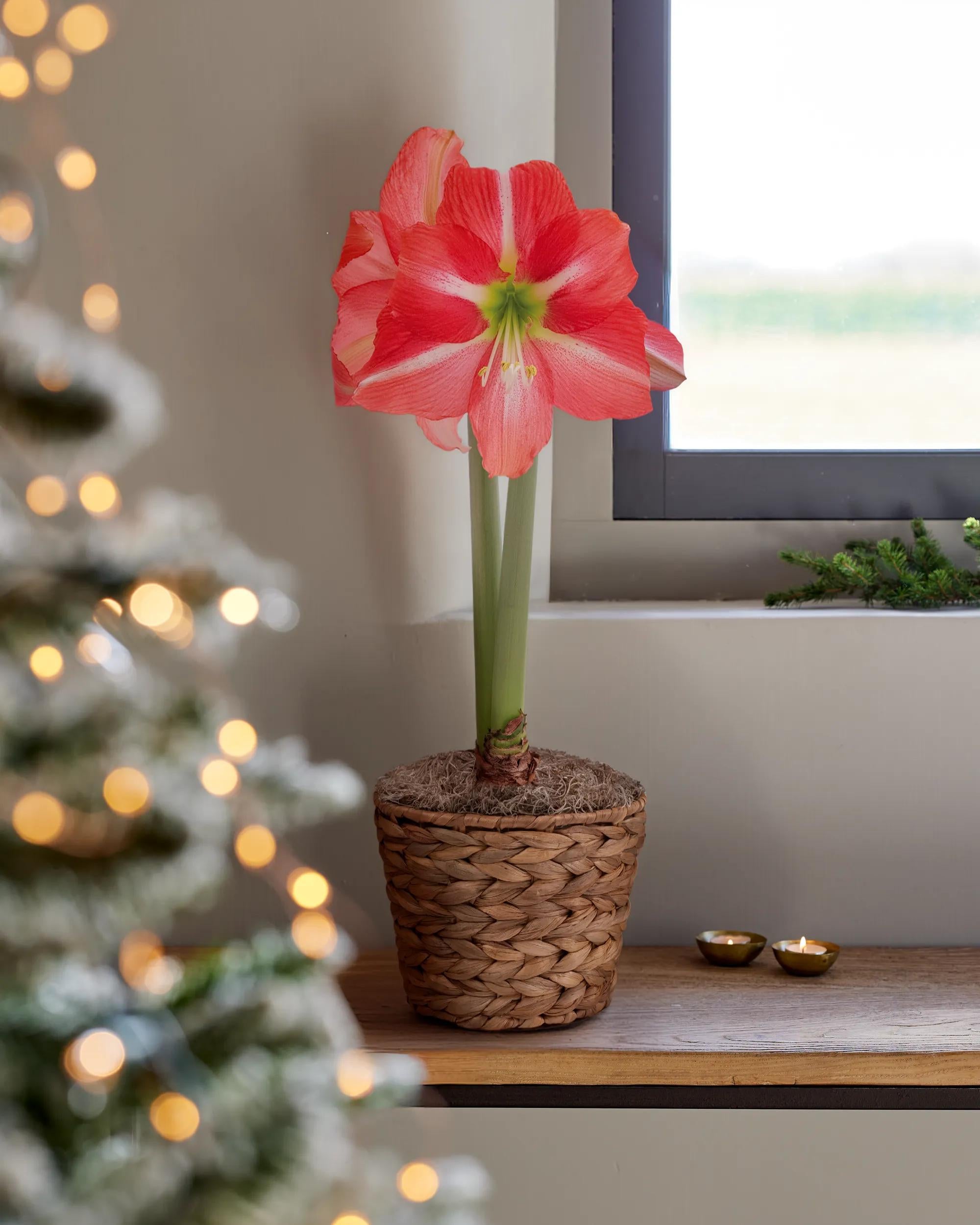 Each of our premium amaryllis bulbs is selected for its size and vitality, promising multiple stems and an extended bloom period. Whether you're gifting to someone special or treating yourself, Dolce Vita is an easy-care favorite that brings natural elegance indoors. Nestled in a reusable woven cachepot, it's ready to display right out of the package.
