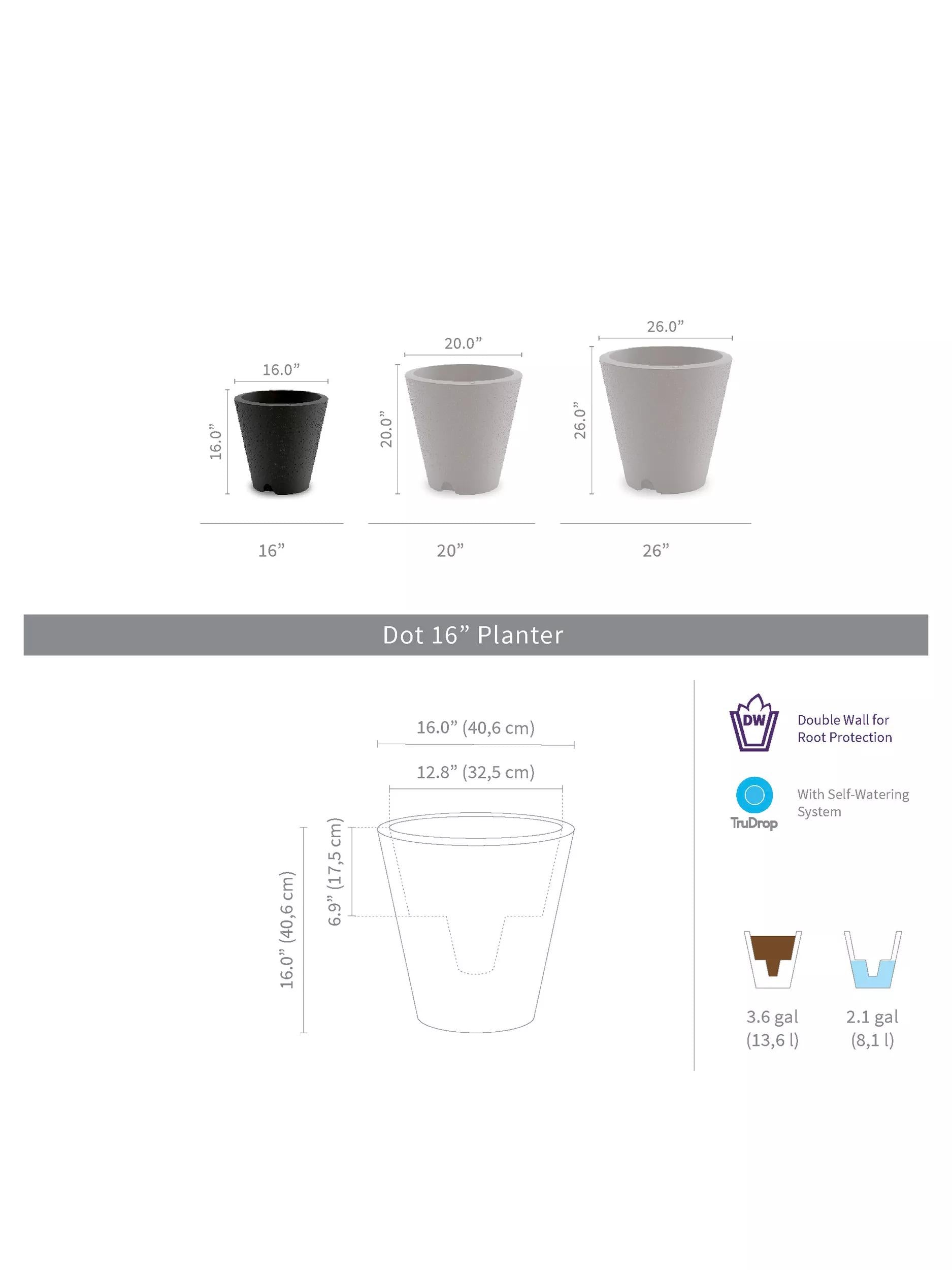- 16" Dot Trudrop Self-Watering Planter: Top diameter 16", base diameter 9-7/8", 16" H