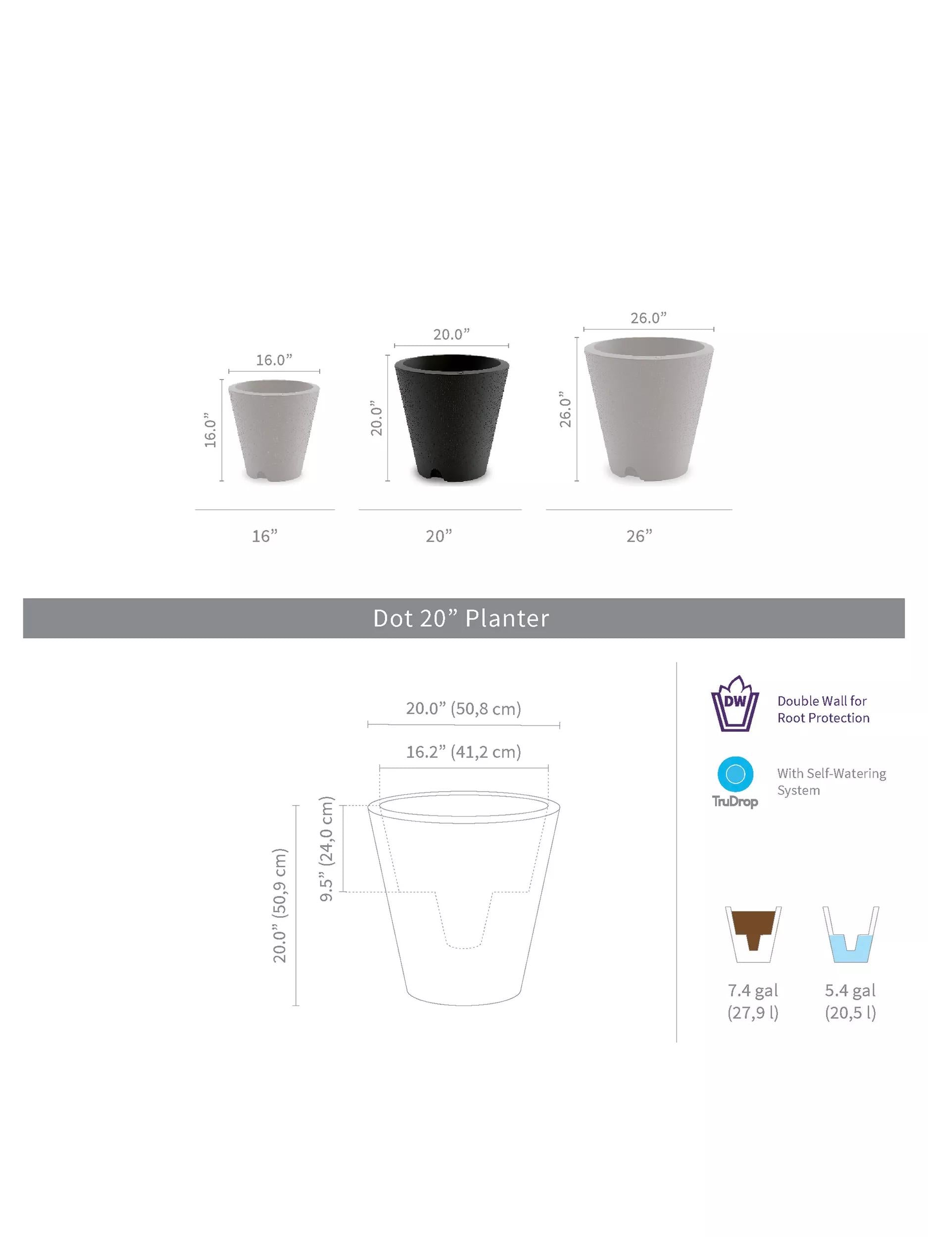 - 20" Dot Trudrop Self-Watering Planter: Top diameter 20", base diameter 12-1/4", 20" H