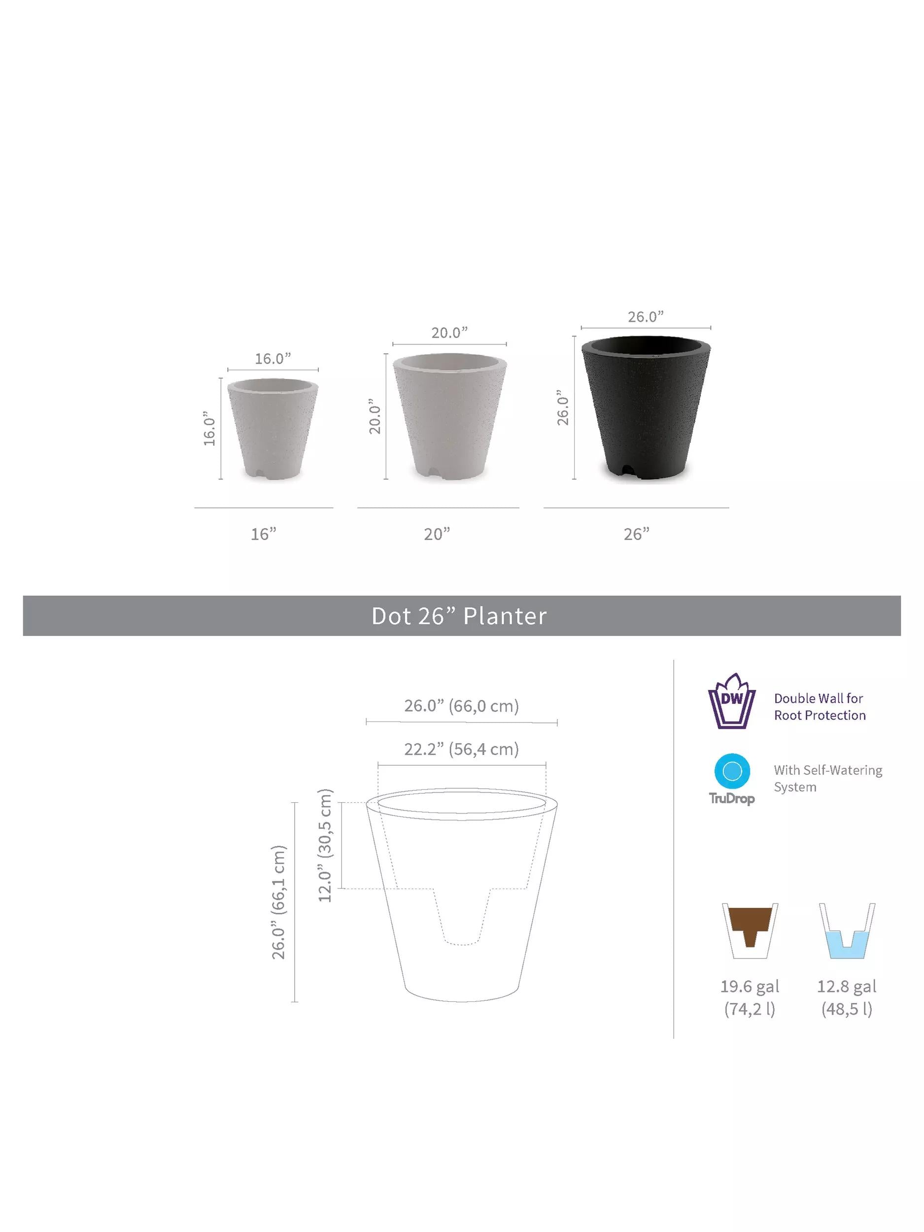 - 26" Dot Trudrop Self-Watering Planter: Top diameter 26", base diameter 16", 26" H