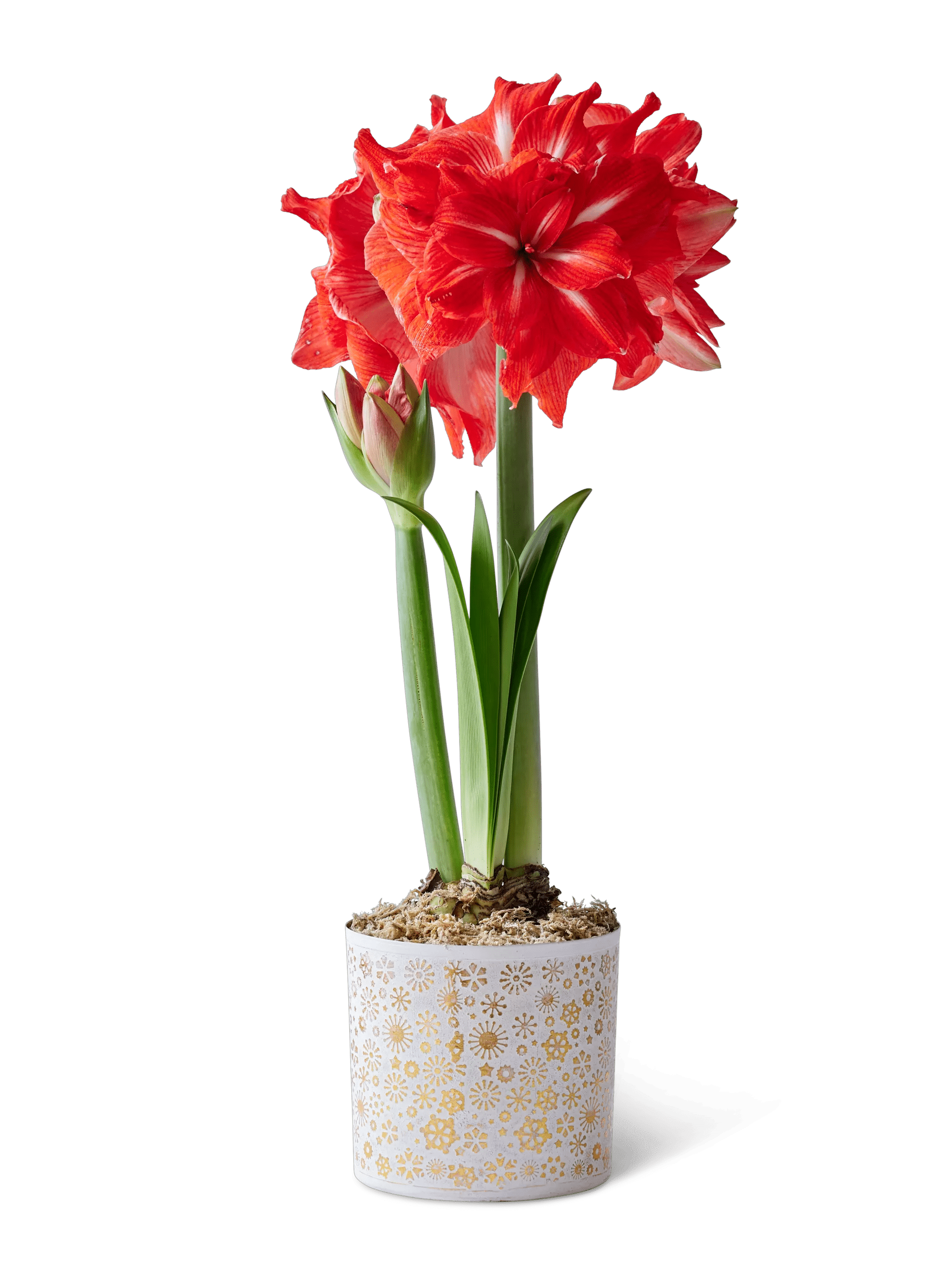 If you only choose one amaryllis for yourself this year, this one should be a contender! With its plush and frilly double blooms, deep scarlet hue, and glorious shimmering cachepot, it will add pizzazz to any setting. The woven cachepot is sturdy and reusable, ready to house your bulb for many years. With a little care, these bulbs will rebloom for you year after year.