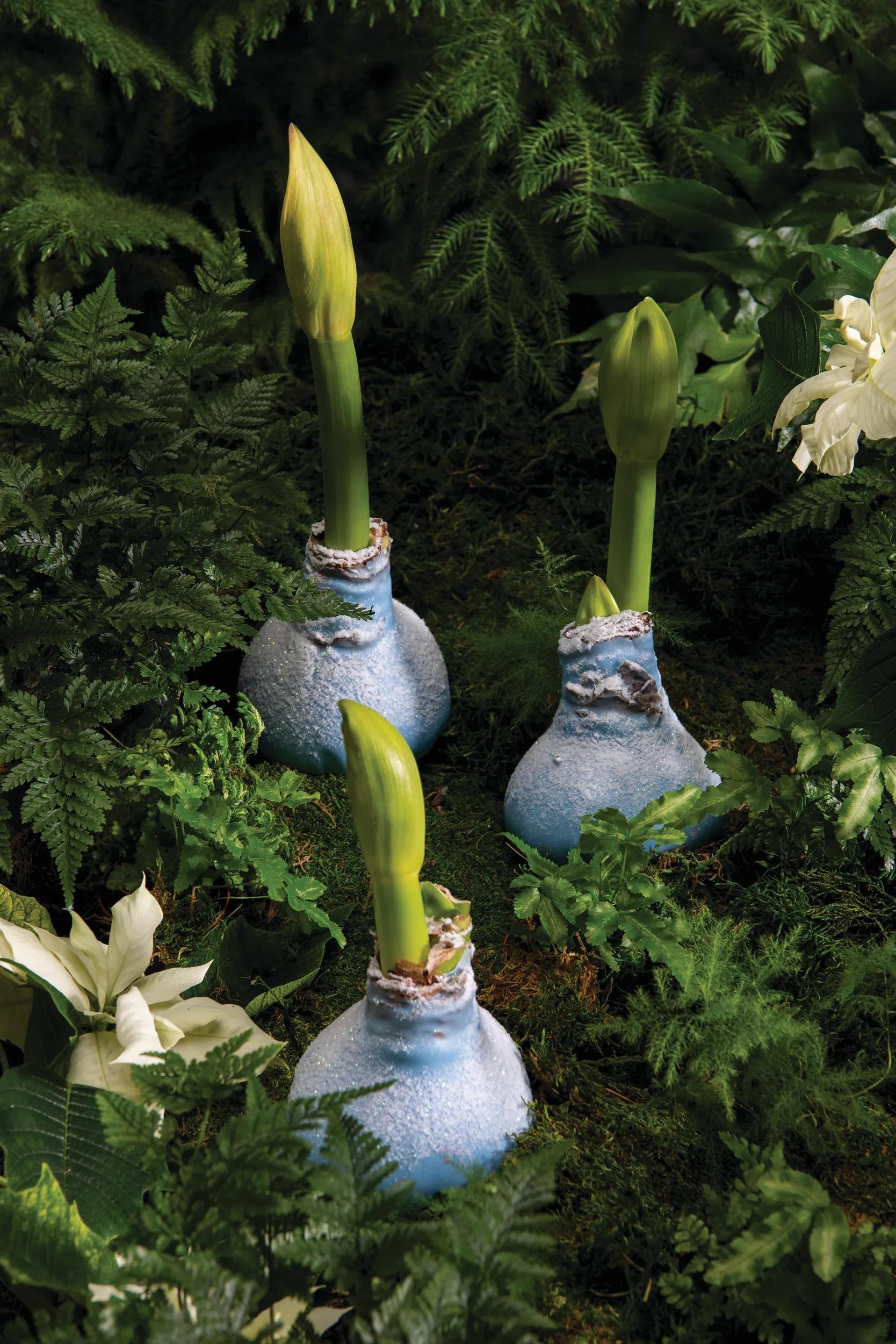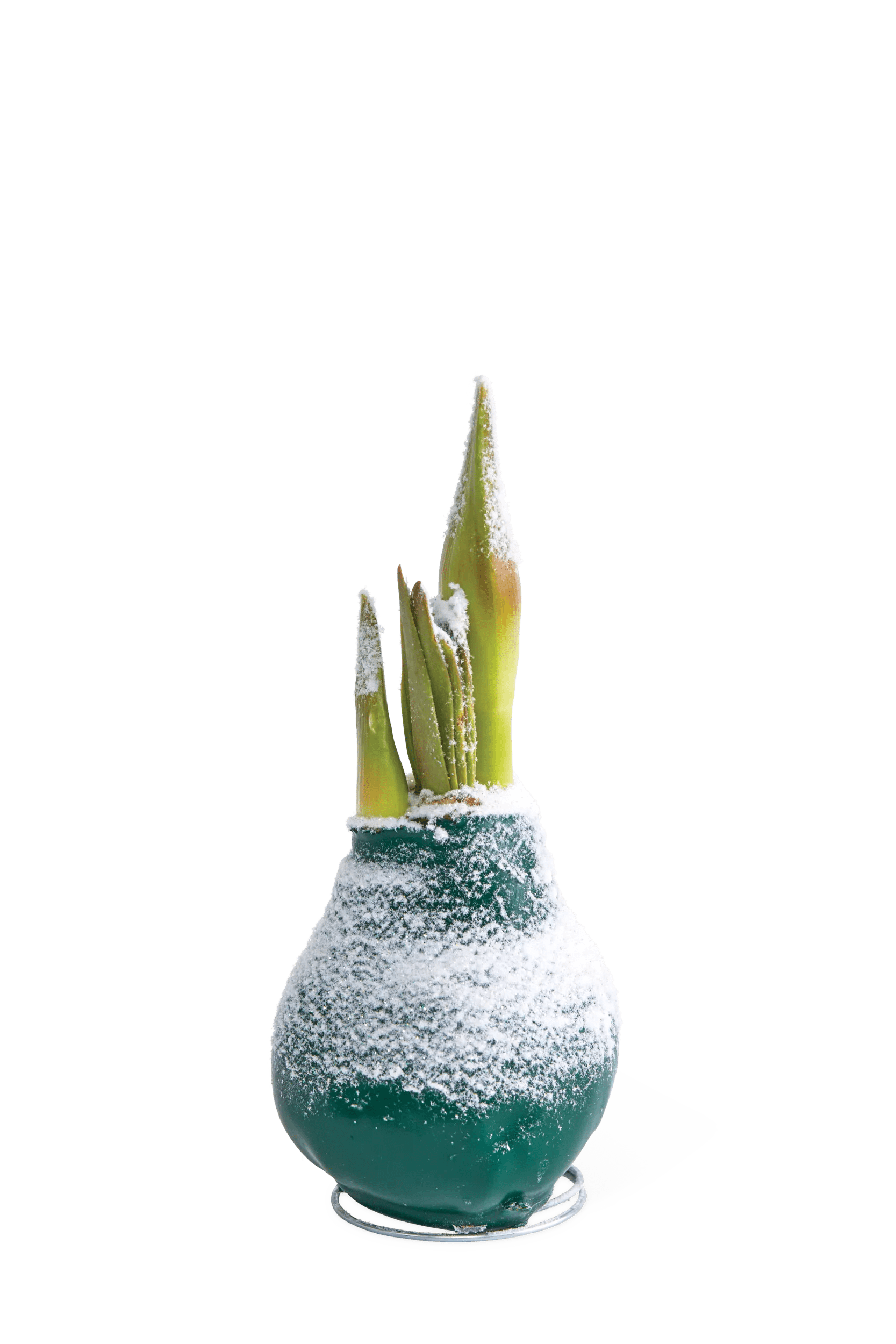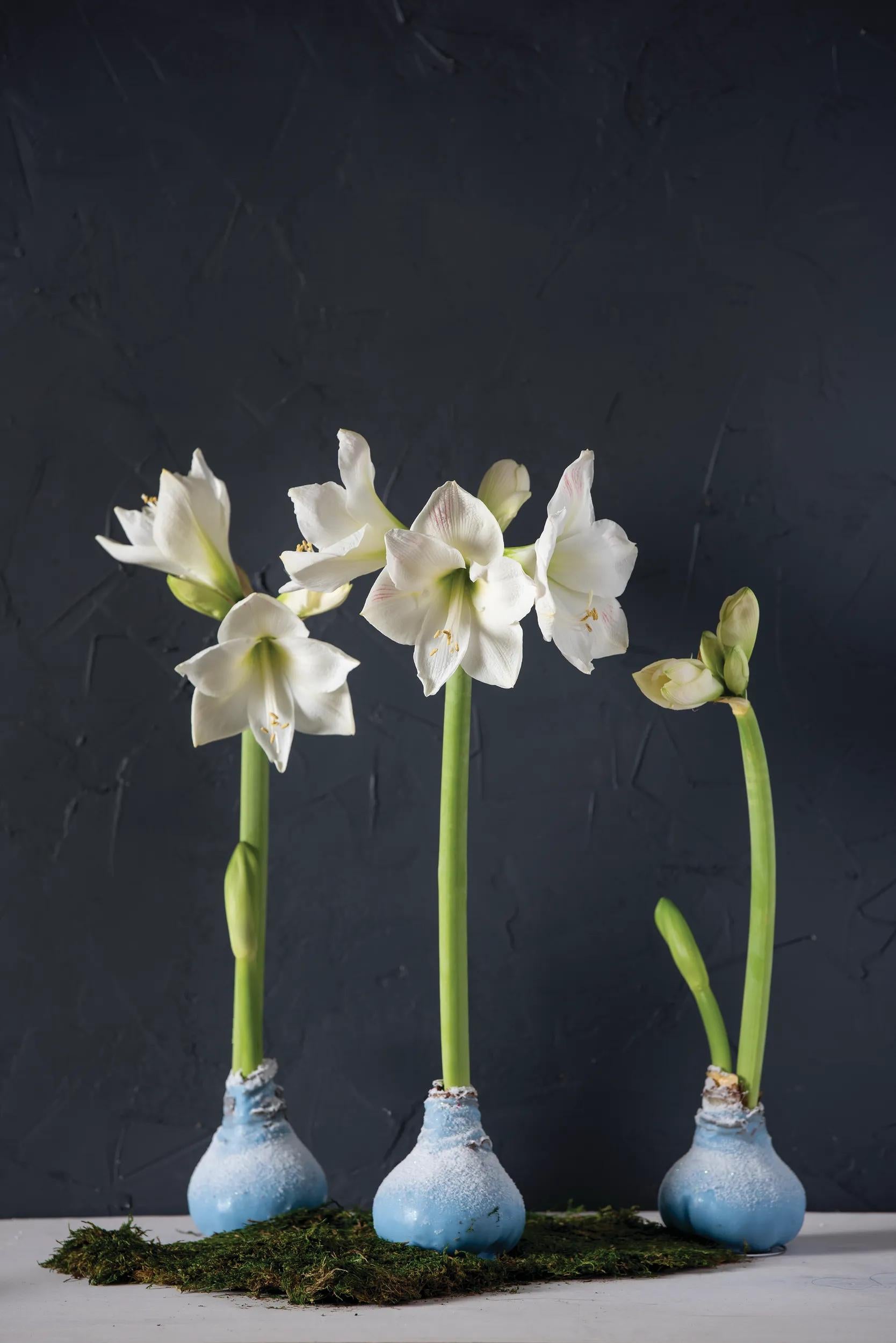 Our easiest-ever amaryllis needs no planting or watering; the waxed bulb holds all the stored energy and water it needs to grow and bloom. A dusting of faux snow adds a touch of winter wonder. A coiled wire embedded at the base makes it freestanding: simply place it on any flat surface, set it in a clear vase, or nestle it among other holiday decorations, and wait for shoots to emerge. Stunning white flowers will begin to bloom in four to six weeks — you can expect one or two flower stalks, each with up to four blooms. No staking required.