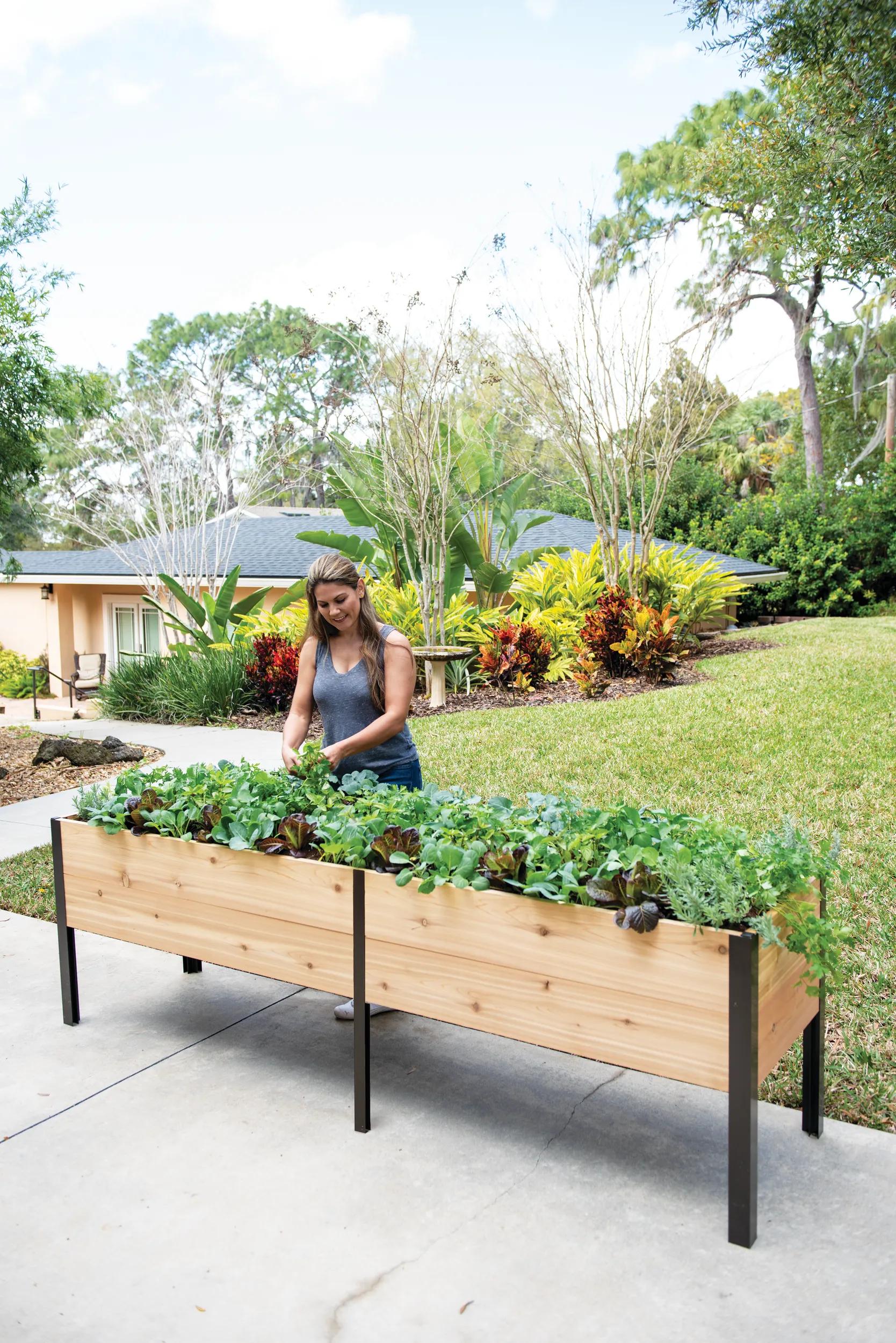 Perfect for deck or patio growing, this generously sized garden box with a 10" planting depth supports bountiful harvests of veggies, fruits, flowers, and herbs! At 29" high, it's also the perfect height for no-bend gardening, so you can grow and tend more comfortably. For even more successful growing, we added 20 gallons of self-watering capacity from 4 connected reservoirs, extending time between waterings and creating more even moisture throughout the bed. In tests, our crops grew stronger, taller, and faster!