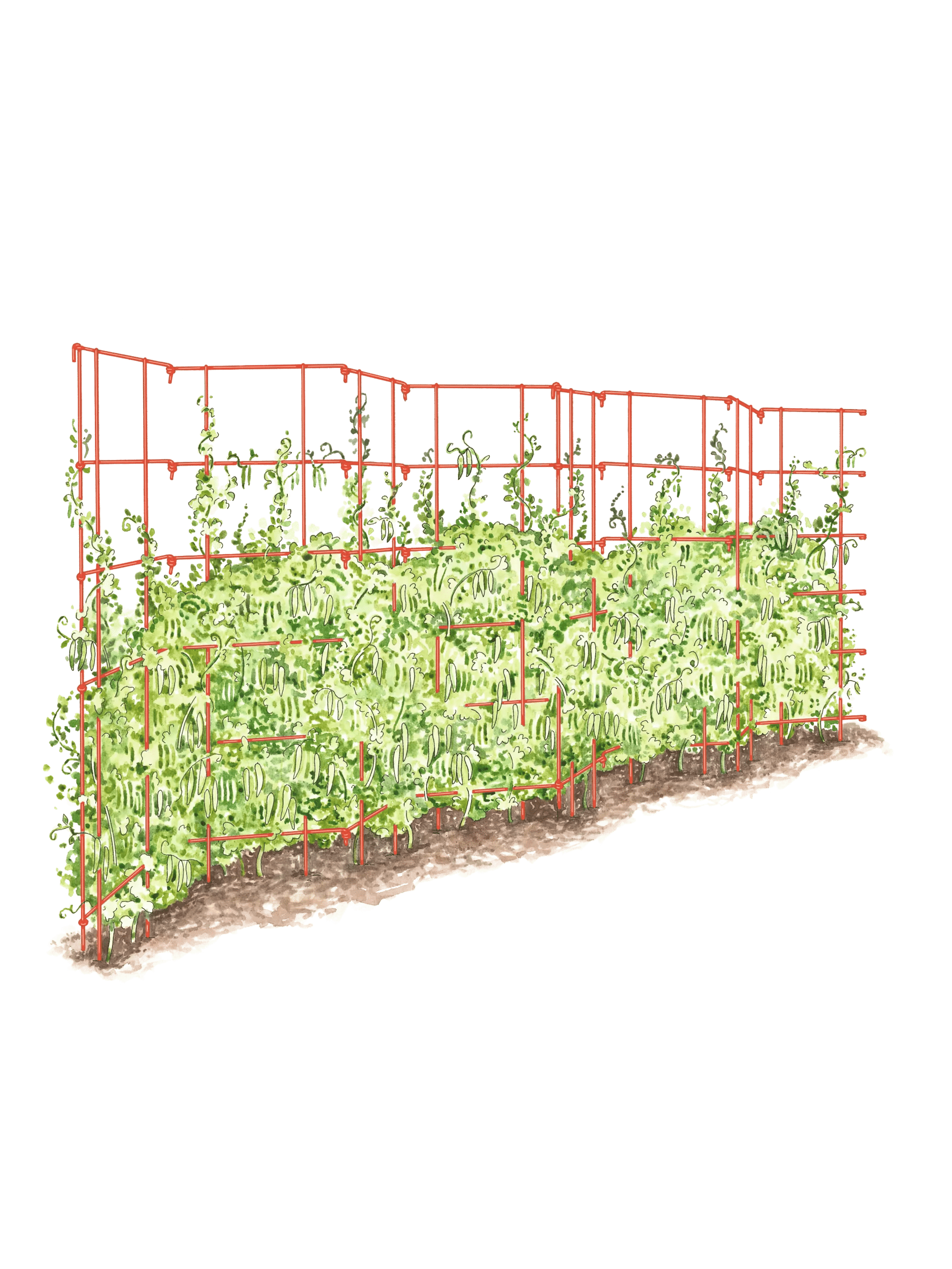 - Sturdy, easy-to-use support for climbing peas and other vining crops