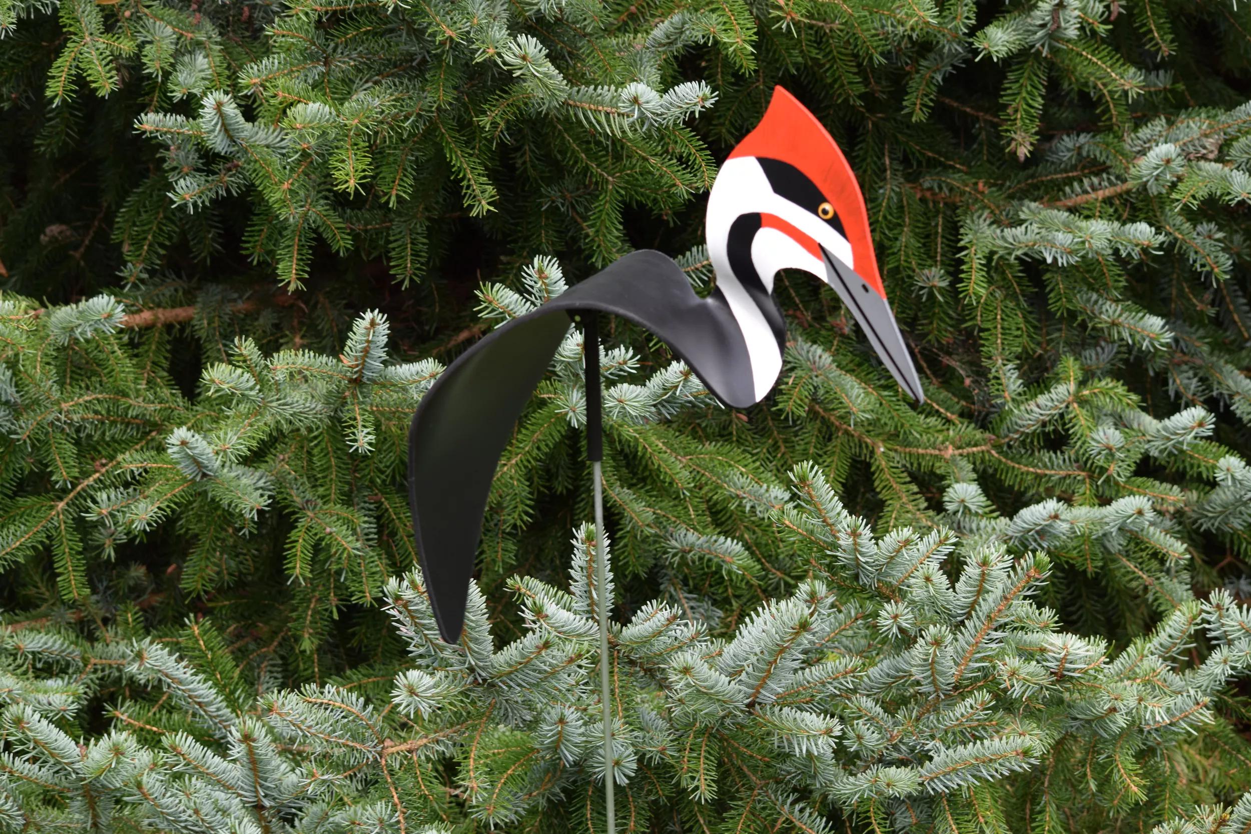 Our Pileated Woodpecker dances on the slightest breeze. Our special hinge allows it to swivel and dip atop a 35" galvanized stake. Made from UV-resistant PVC, entirely hand painted & hand formed, it is durable in day-to-day weather. Simply lift off the stake to take in during severe weather or extreme temperatures. Made in the USA.