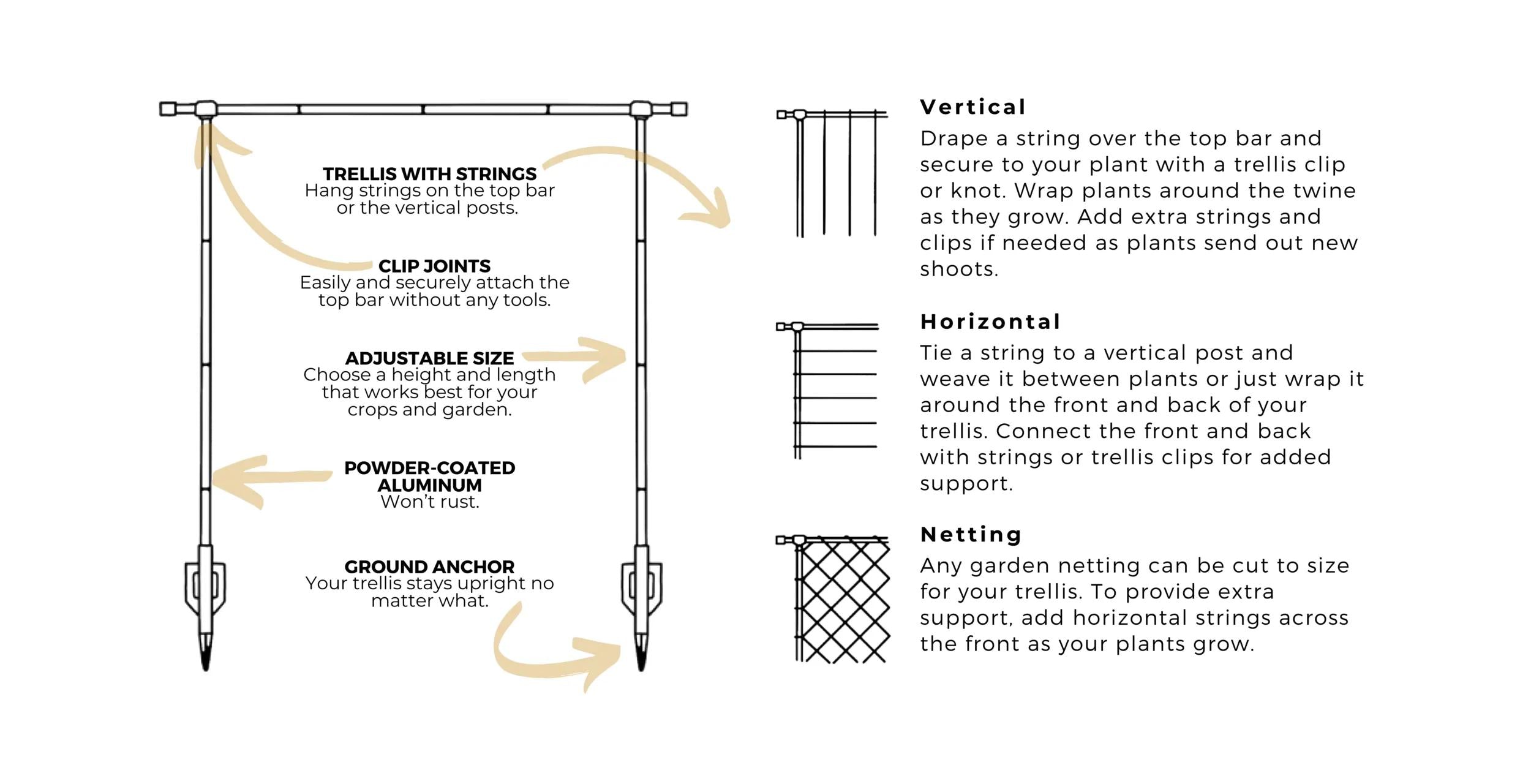 - Trellis materials: powder coated aluminum pipes and steel ground anchor