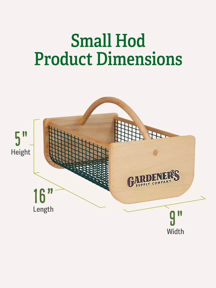 - Small Garden Hod is 16" L x 9" W x 7" H overall; basket is 5" H