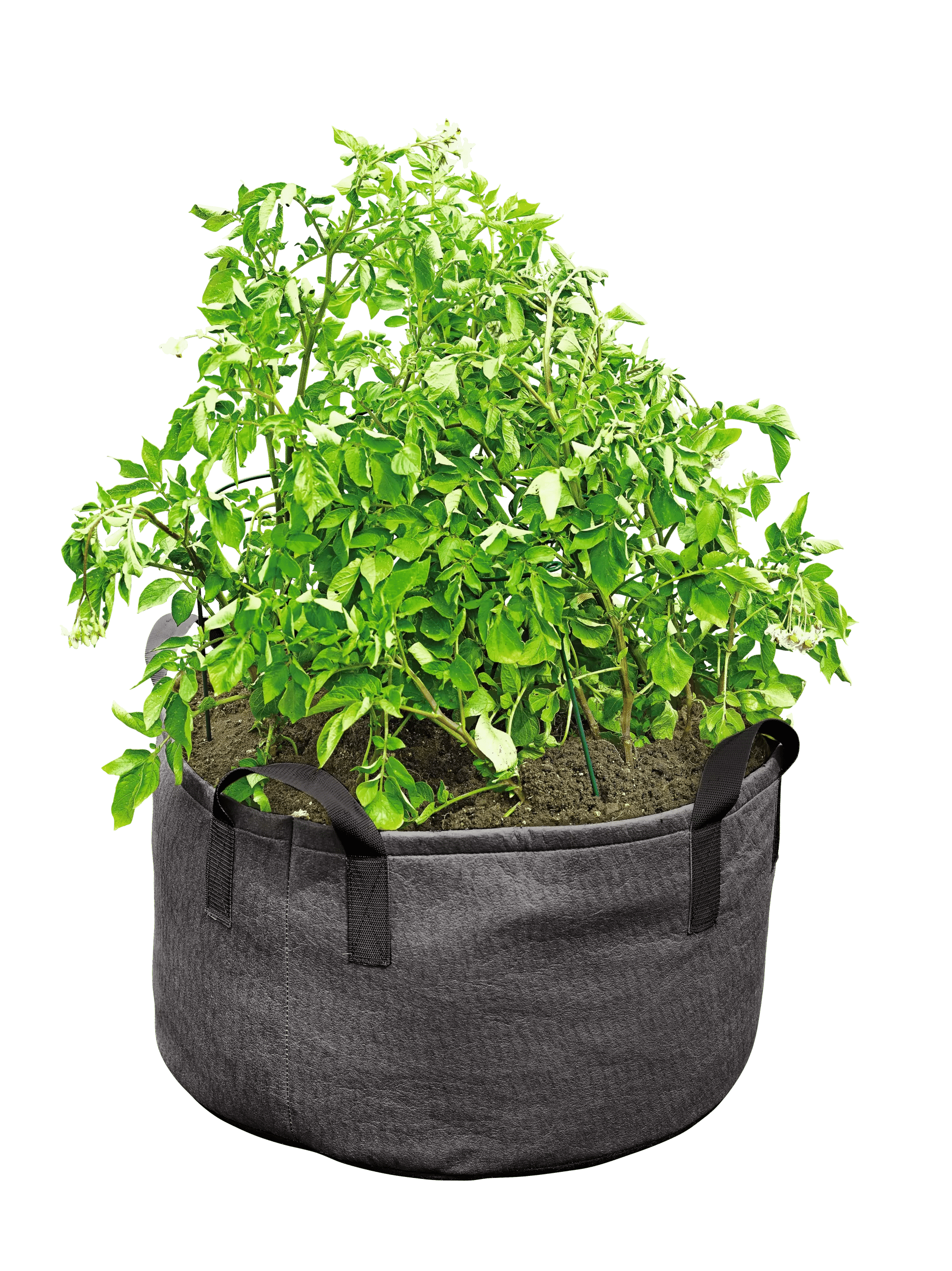 Grow potatoes anywhere, without tilling beds or hilling up soil. Harvesting is a snap; just dump out the soil and there they are! This jumbo fabric potato bin® offers plenty of room for a big harvest. The patented fabric air-prunes roots for stronger, healthier plants. It also aerates soil, prevents heat build-up and allows excess water to drain away. Reinforced nylon handles. Fold for storage, reuse year after year.