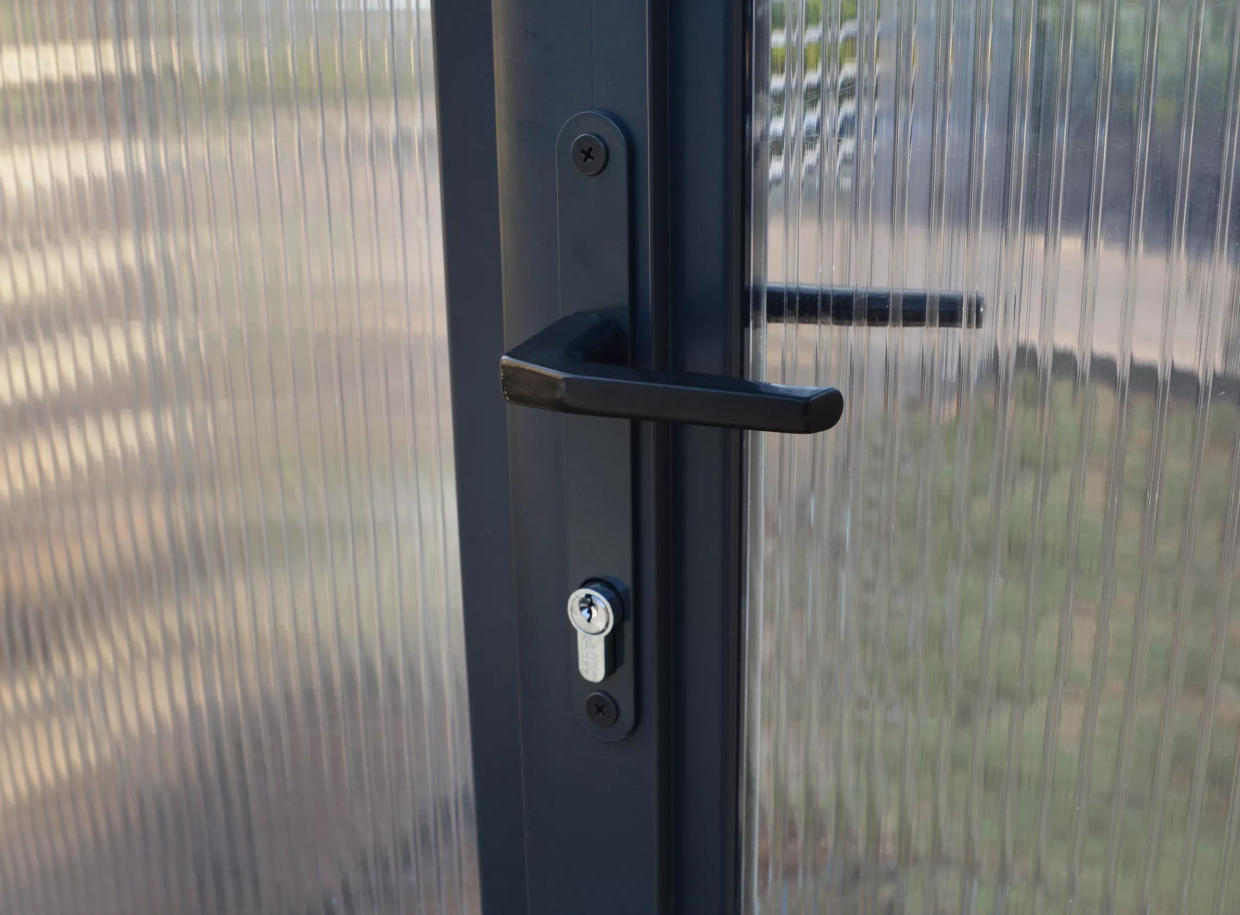 This greenhouse also includes a full galvanized, rust-resistant steel base kit, crucial for adding height, structural support, stability and alignment. It is aesthetically pleasing with its elegant, dark anthracite powder coated finish and its robust aluminum framework. The Glory greenhouse is built from high quality materials for long, lasting use. The greenhouse itself features 10 mm Twin-Wall 100% UV-protected, light-diffusing polycarbonate panels with over 90% light transmission and provides a comfortable, insulated environment for growing your plants. The virtually unbreakable, thick panels also protect plants from harsh weather conditions such as hail, snow and frost and provide additional insulation.