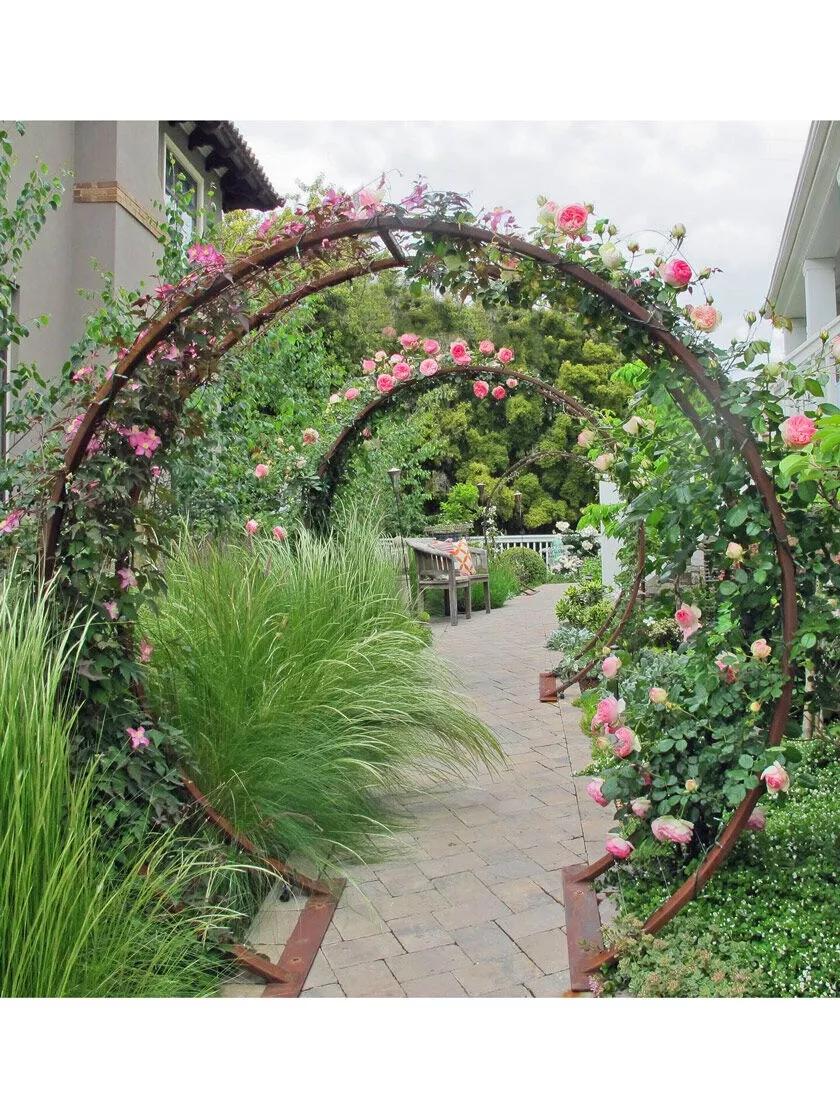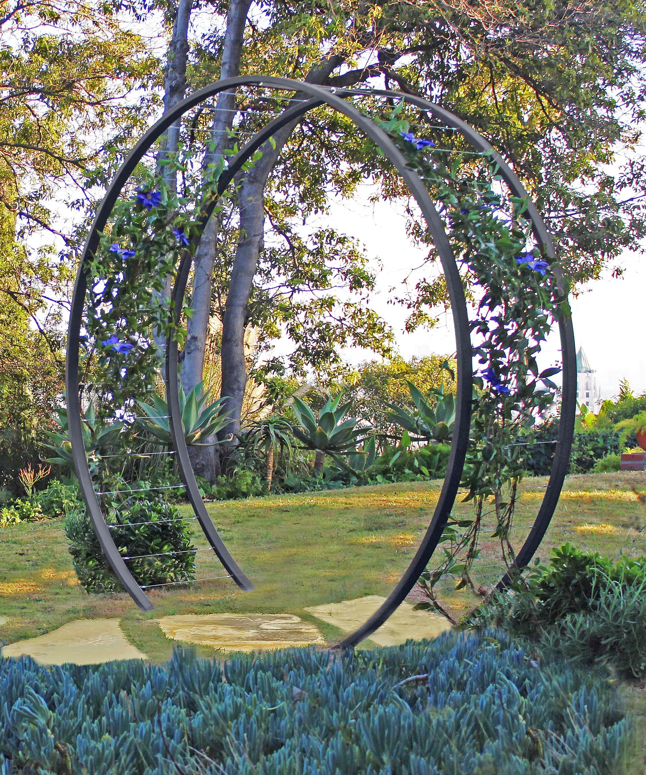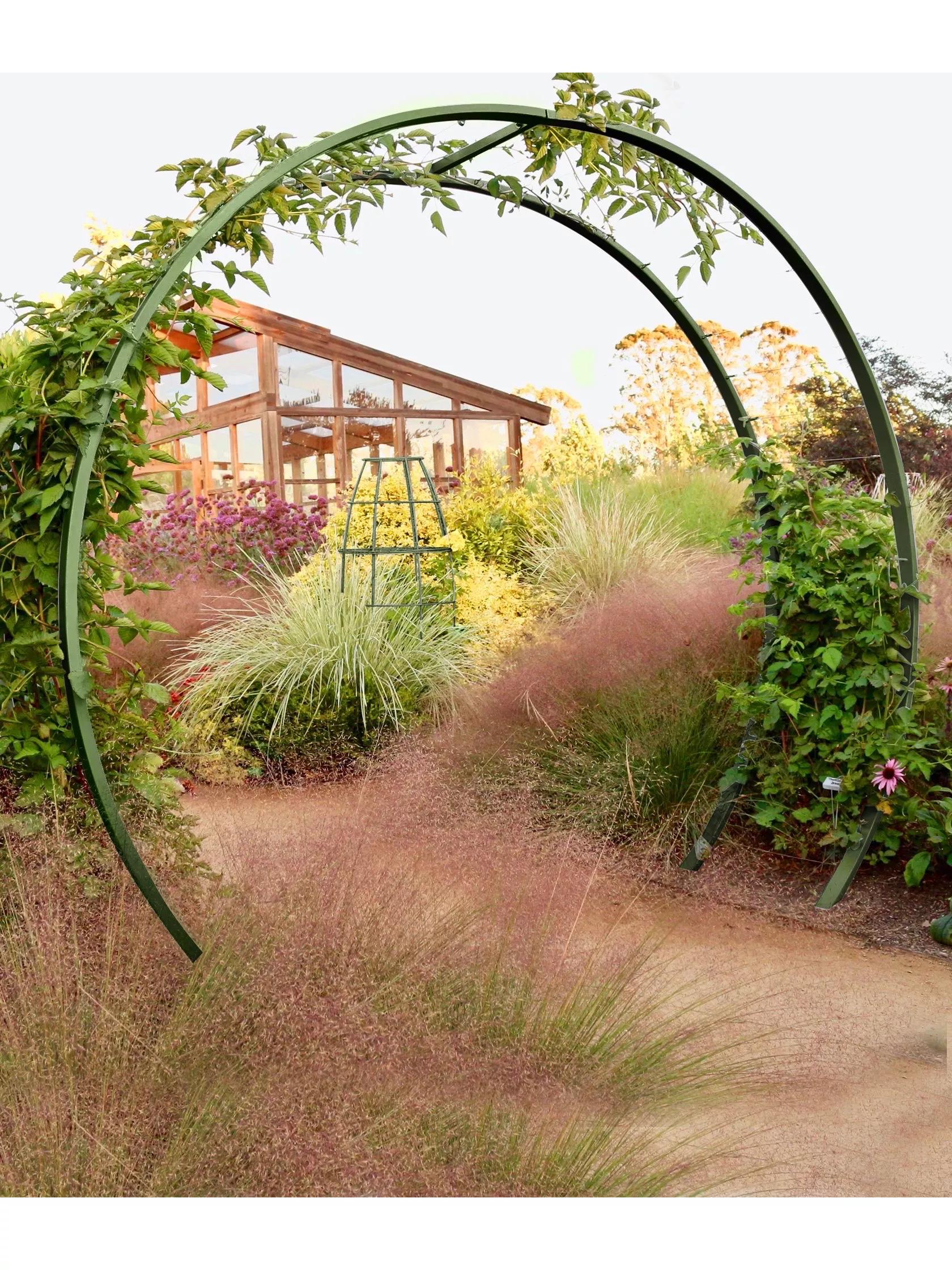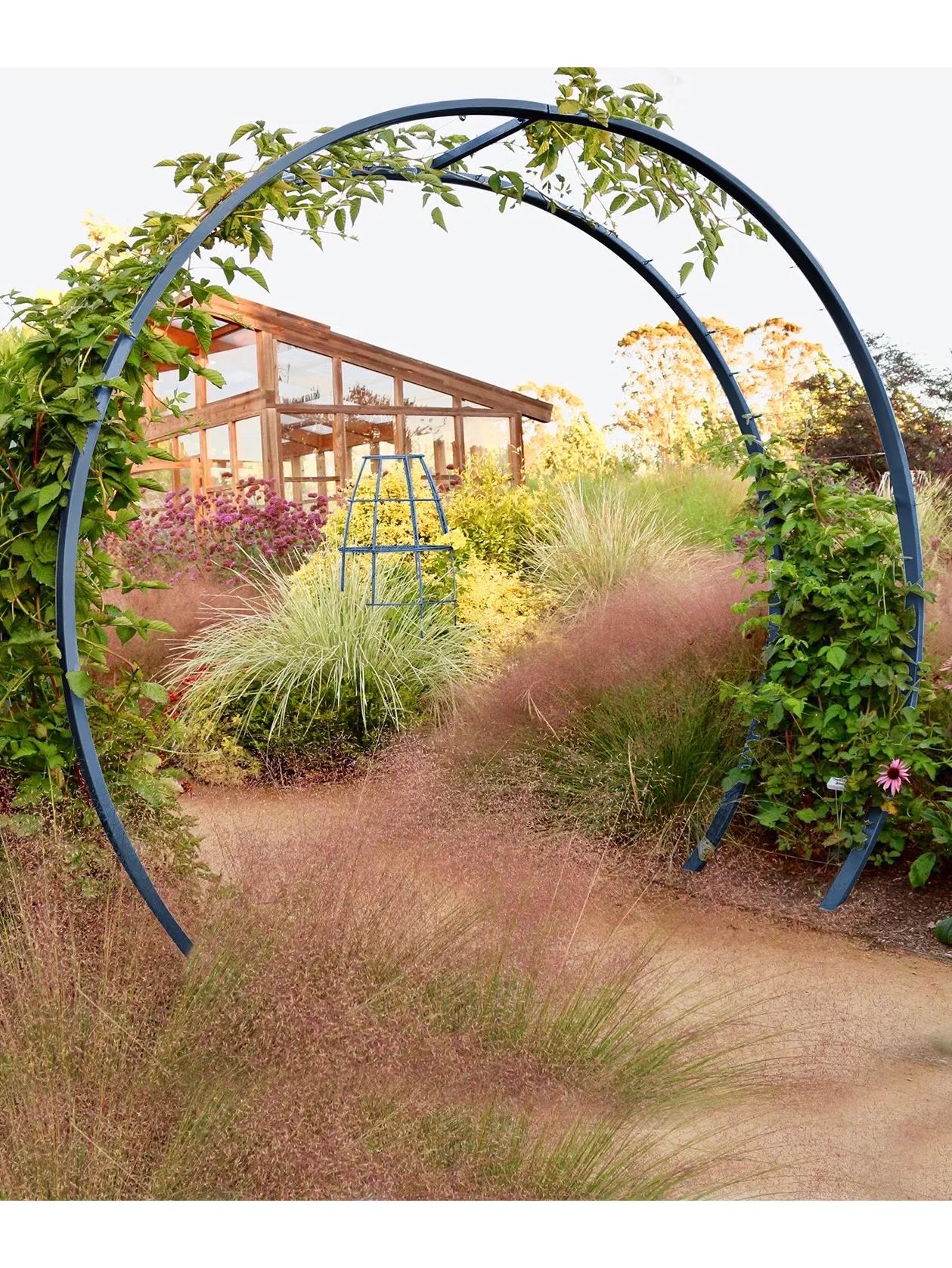 Featured in iconic public gardens, the grand Gracie Modern Arbor creates a stunning sculptural garden gateway whether supporting plants or left bare. Designed and hand-crafted in the U.S. from steel and stainless steel cable, finished in brilliant water-resistant powder-coated colors or a natural oxide patina. This contemporary moon gate is as sturdy as it is striking and doubles as a beautiful garden sculpture when plants are dormant. Train everything from climbing roses, clematis or sweet peas to squash, cherry tomatoes or cucumber. Base plate can be bolted to hardscape or staked into ground to create floating circle effect. Simple assembly.