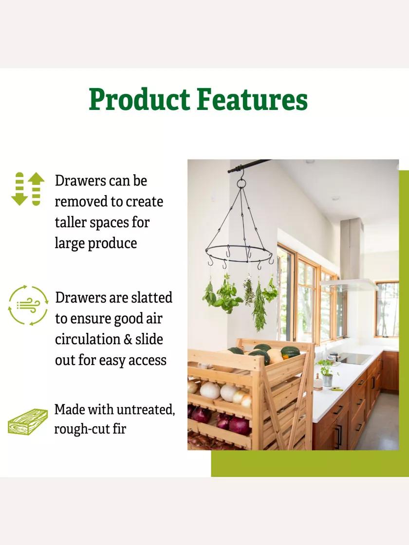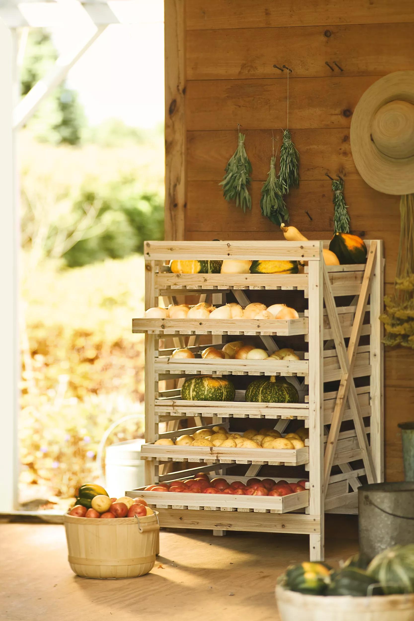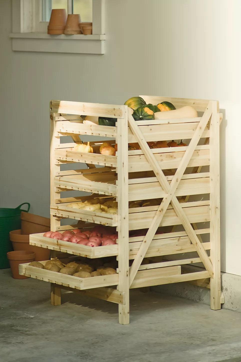 Years ago, people stored "keeper" crops such as apples, winter squash, onions and potatoes on rustic wooden racks like this one. The drawers are slatted to ensure good air circulation, and they slide out for easy access. For best results, the rack should be located in a cool, dark cellar or shed.