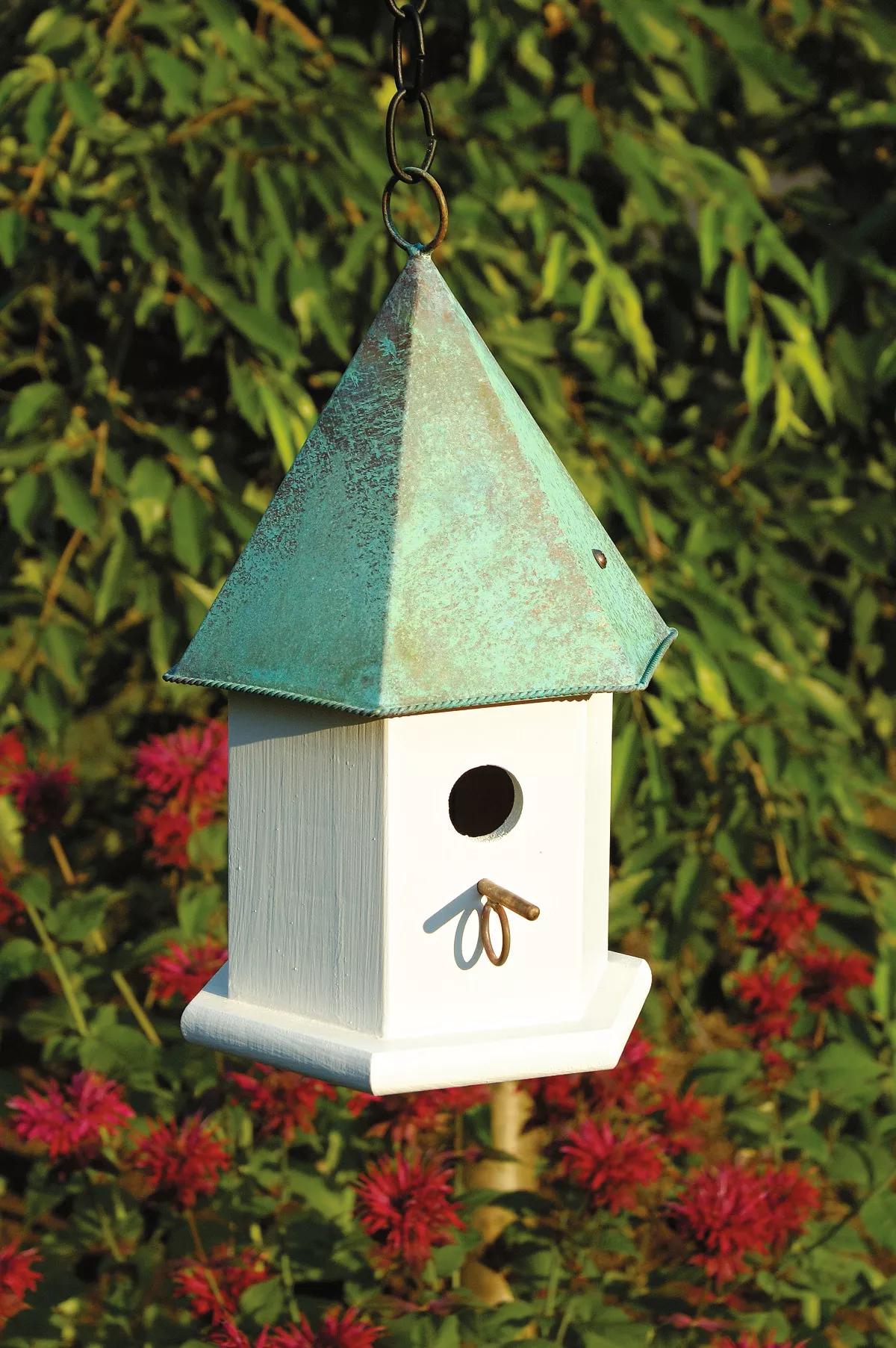 A stylish hexagonal body of heavy duty PVC and a real copper roof makes this a must-have for your garden. Copper perch with loop complete the look, with easy cleanout. 1-1/4" opening invites chickadees, nuthatches, swallows, downy woodpeckers and wrens. Proudly hand-crafted by Heartwood in the USA.