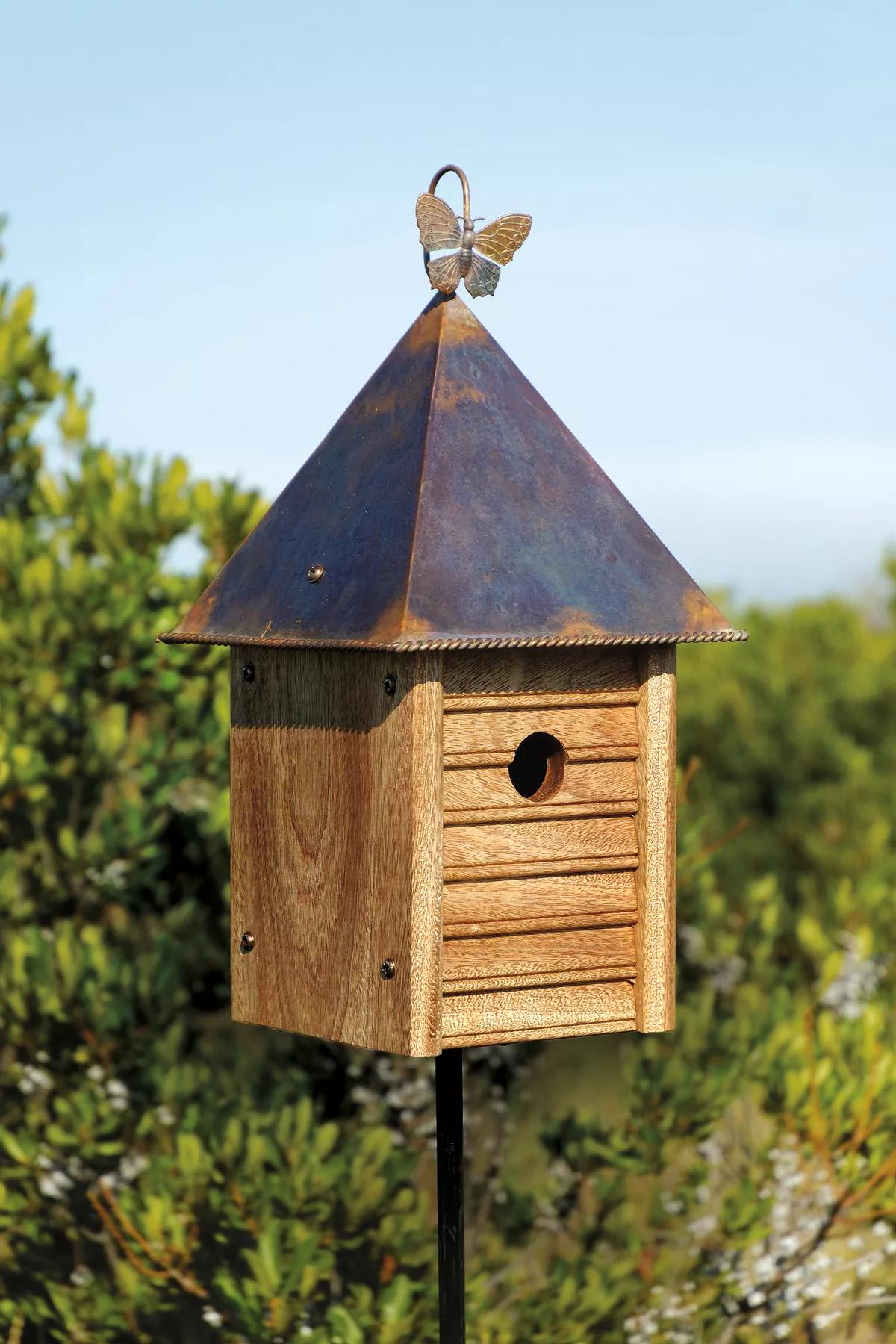 Americans have been in love with birds since our earliest days, and this bird house is a classic home style with loads of historic appeal. The exclusive Heartwood siding is assembled with bronze plated screws, a copper hipped roof with twirled rope edging and a hanging loop graced by a copper butterfly. 1-3/8" entry is perfect for wrens, chickadees, nuthatches and titmice. Proudly hand-crafted by Heartwood in the USA.