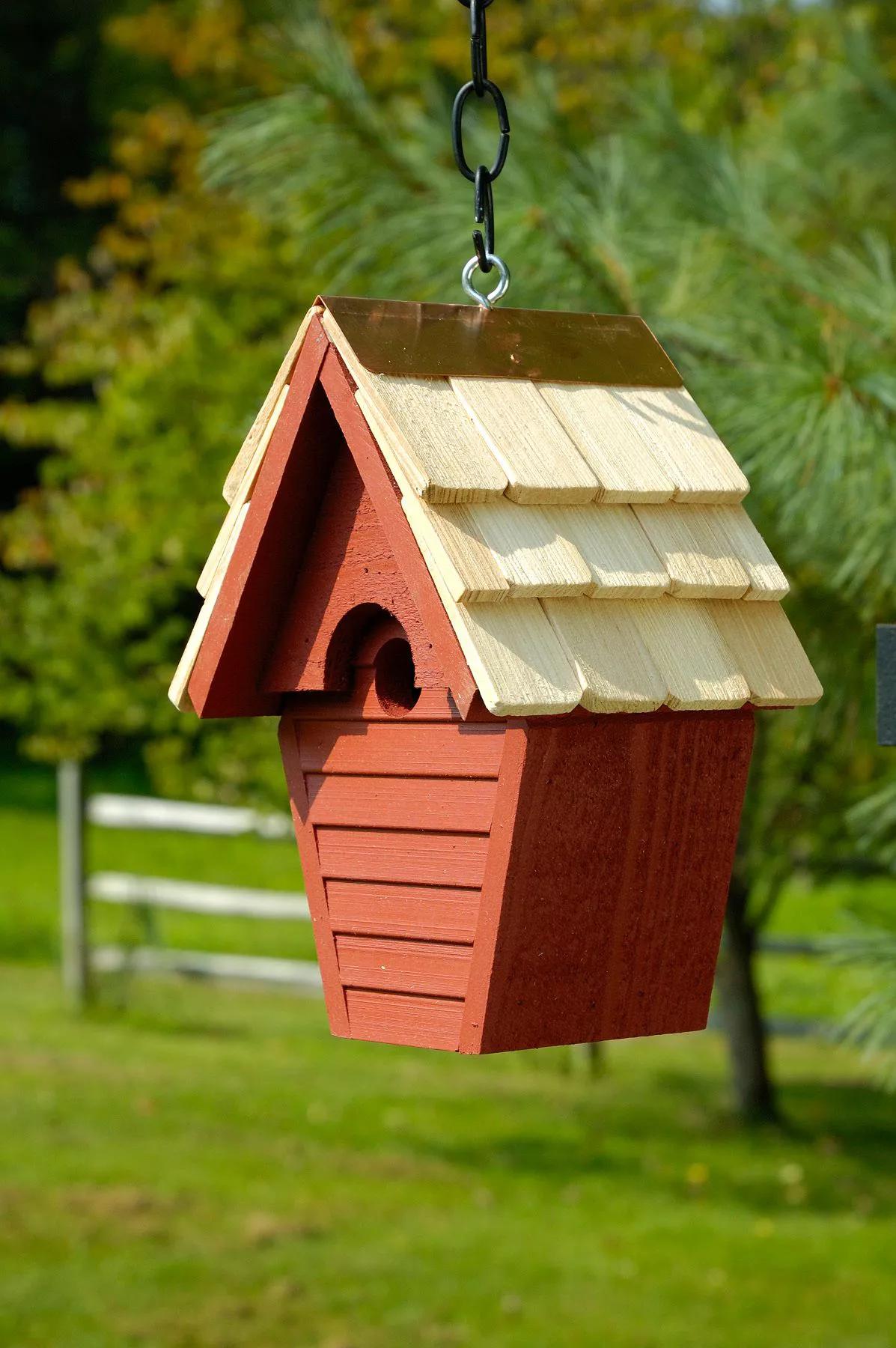 This graceful bird house will double as a spot for a spectacular air show – takeoffs and landings all day long! Made with solid cypress wood, which is naturally resistant to decay and insects. It also features copper trim and includes drainage, ventilation and a rear panel cleanout, and the 1-1/8" entry is perfect for wrens. This birdhouse has a loop that allows it to hang off a chain and remain suspended, perfect for wrens who don't mind their homes swaying gently in the breeze. Proudly hand-crafted by Heartwood in the USA.