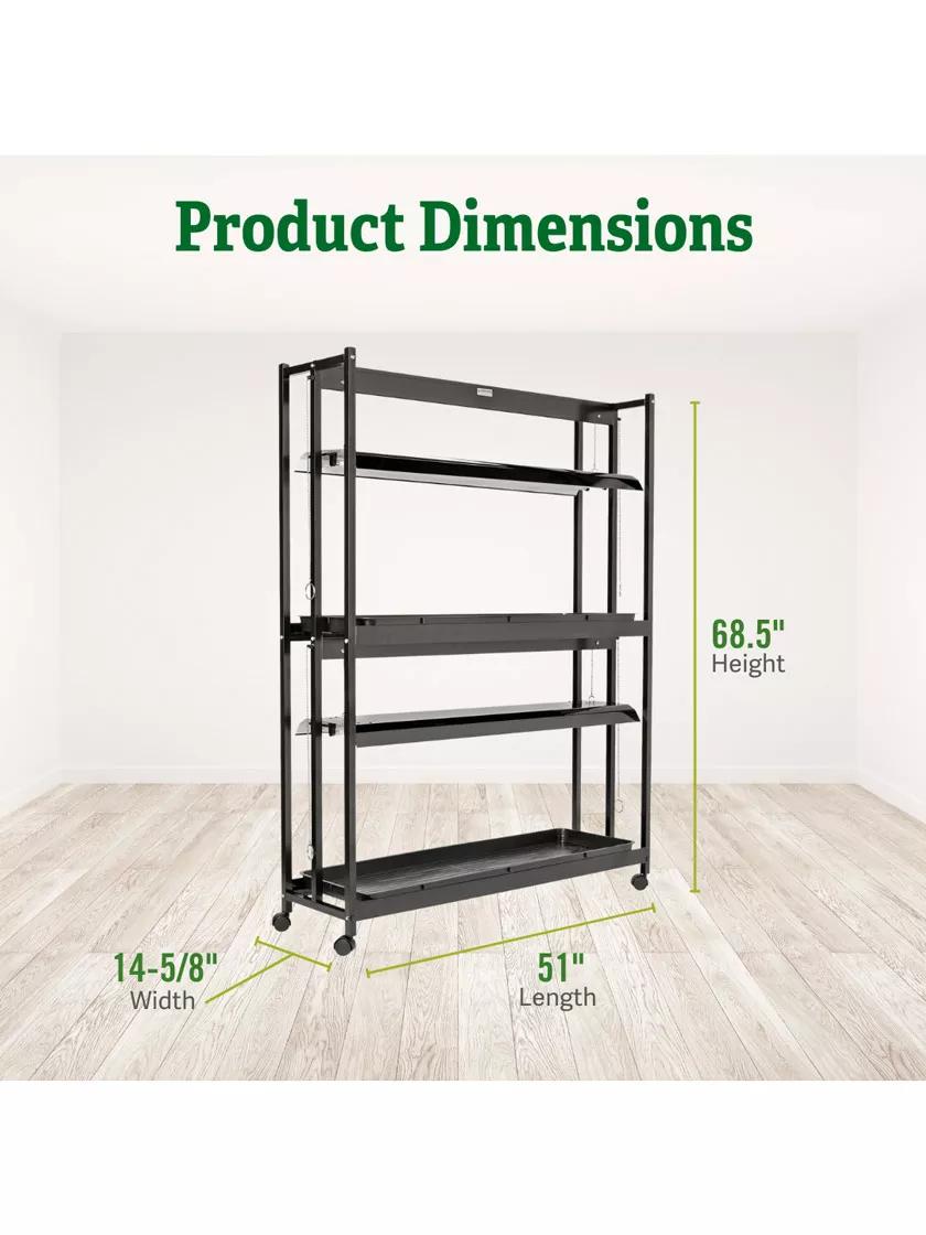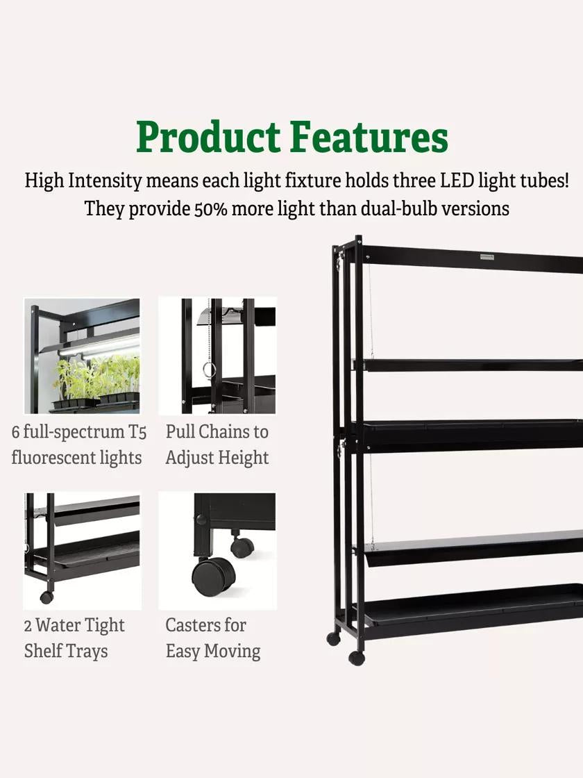 Grow orchids and other light-hungry plants! With these high-intensity lights you can grow plants from seed all the way to flowering and fruiting. Each fixture has three full-spectrum,T5 fluorescent bulbs, so they provide 50% more light than dual-bulb versions. The rugged, powder-coated, rustproof aluminum frame has two growing shelves that provide plenty of room for seedlings and houseplants. The light fixtures easily adjust up and down as plants grow, and there’s plenty of headroom for tall plants. Includes frame, light fixtures, T5 fluorescent bulbs, watertight trays and casters.