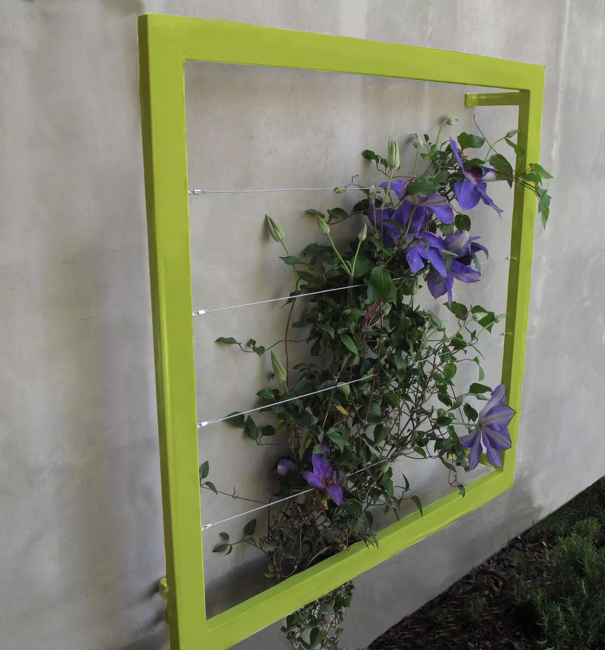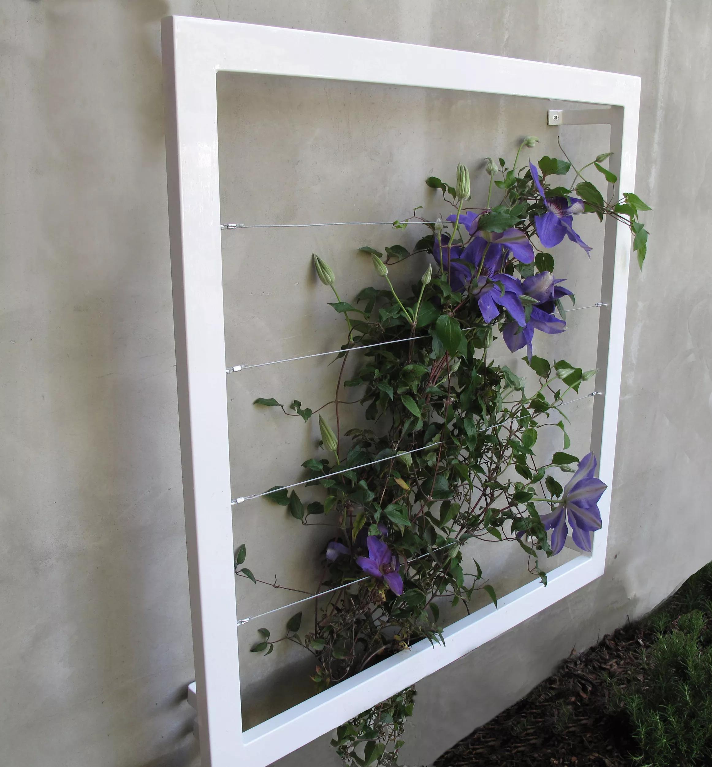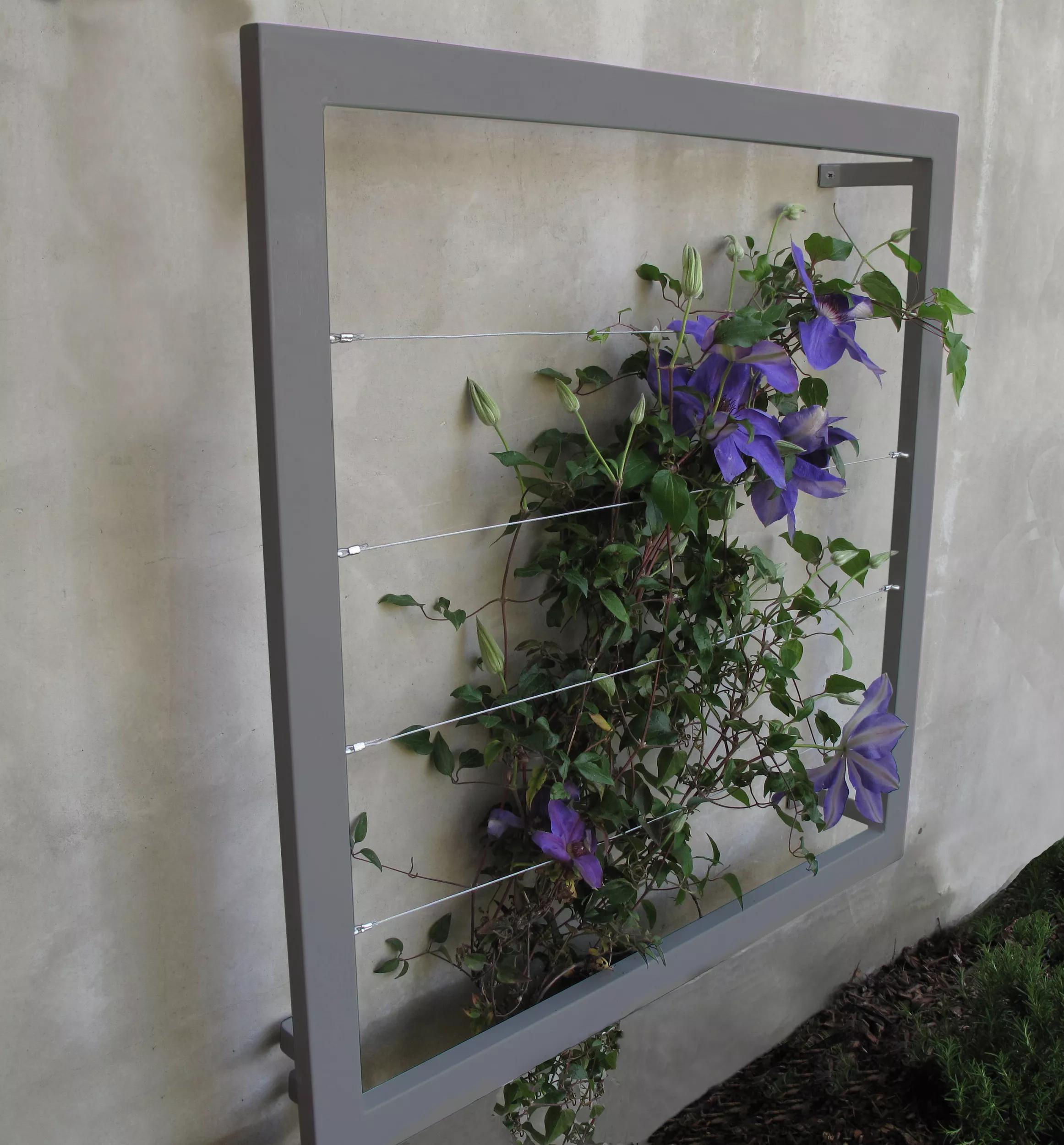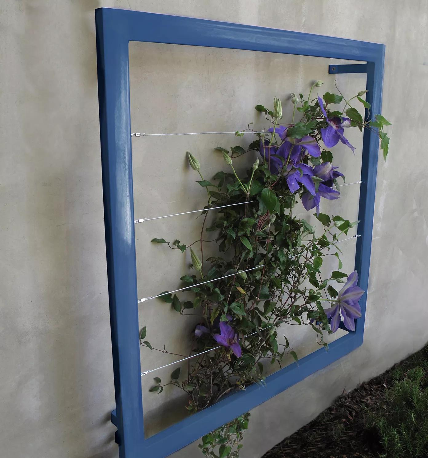 Create an instantly stylish vertical garden on any wall or fence with this modern wall trellis by Terra Trellis. Designed and hand-crafted in the U.S. from steel and stainless steel cable, finished in brilliant water-resistant powder-coated colors or a natural oxide patina. Welded brackets stand out 4" from wall allowing edible or ornamental vines to weave throughout, creating a spectacular natural tapestry. Beautiful in multiples is lightweight and easy to install.