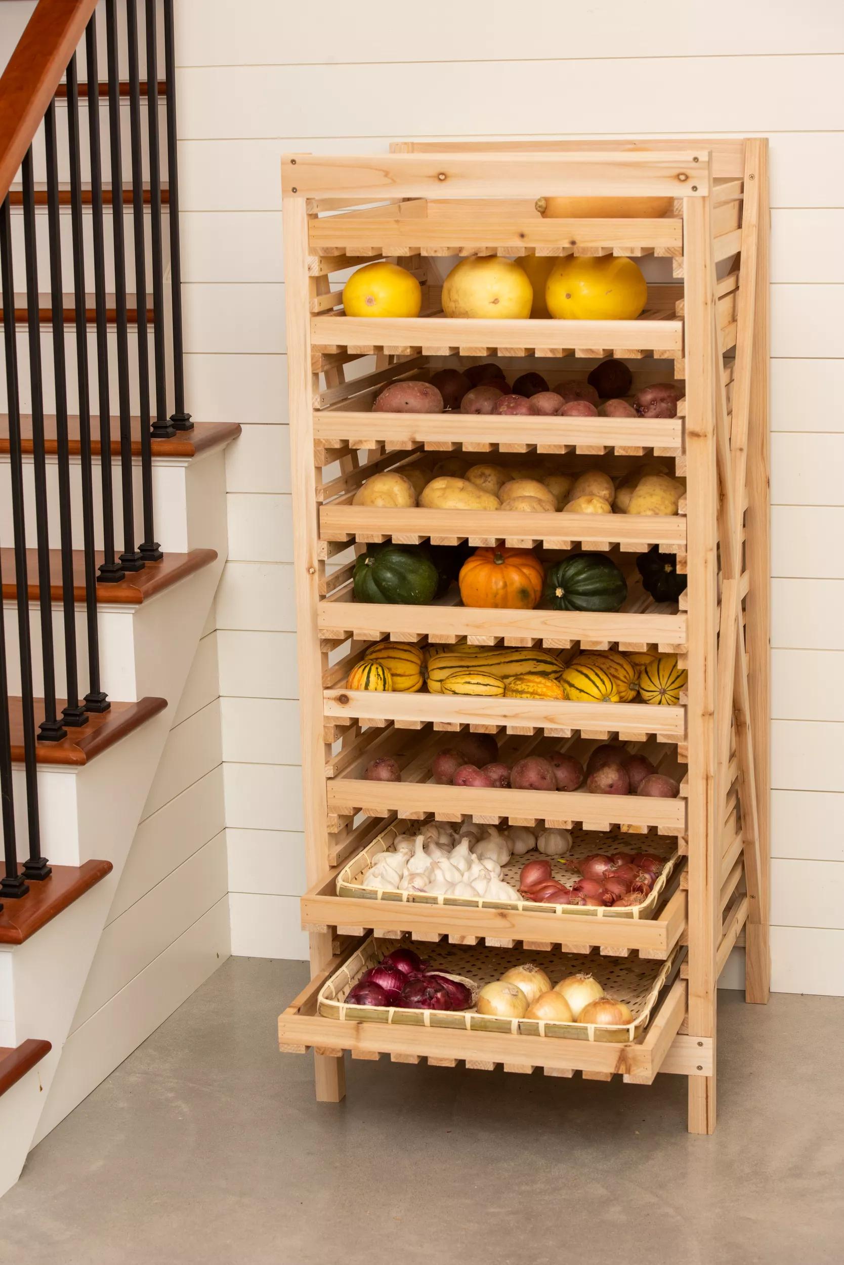 Years ago, people stored "keeper" crops such as apples, winter squash, onions, and potatoes on rustic wooden racks like this one. The drawers are slatted to ensure good air circulation, and they slide out for easy access. For best results, the rack should be located in a cool, dark cellar or shed.