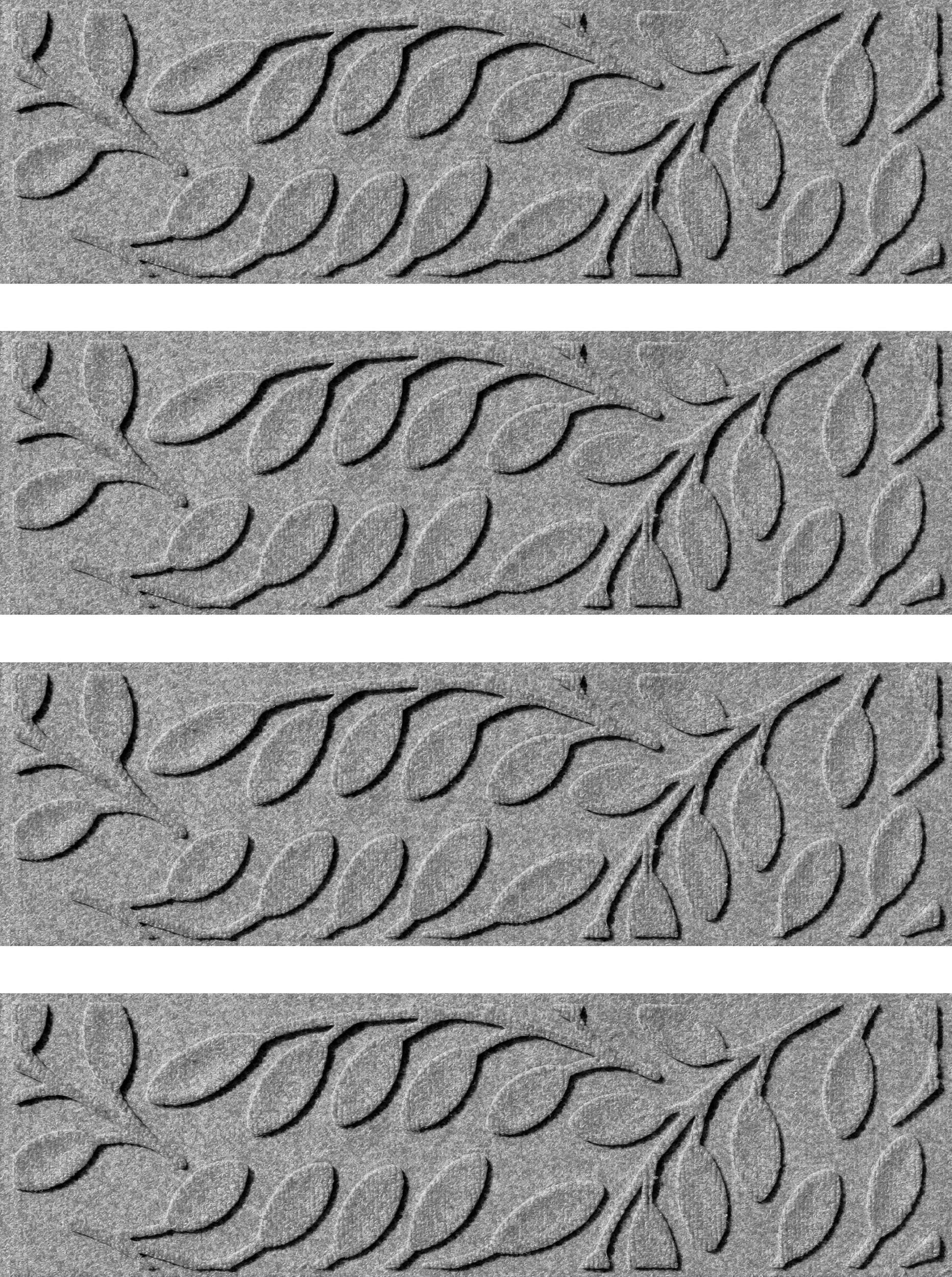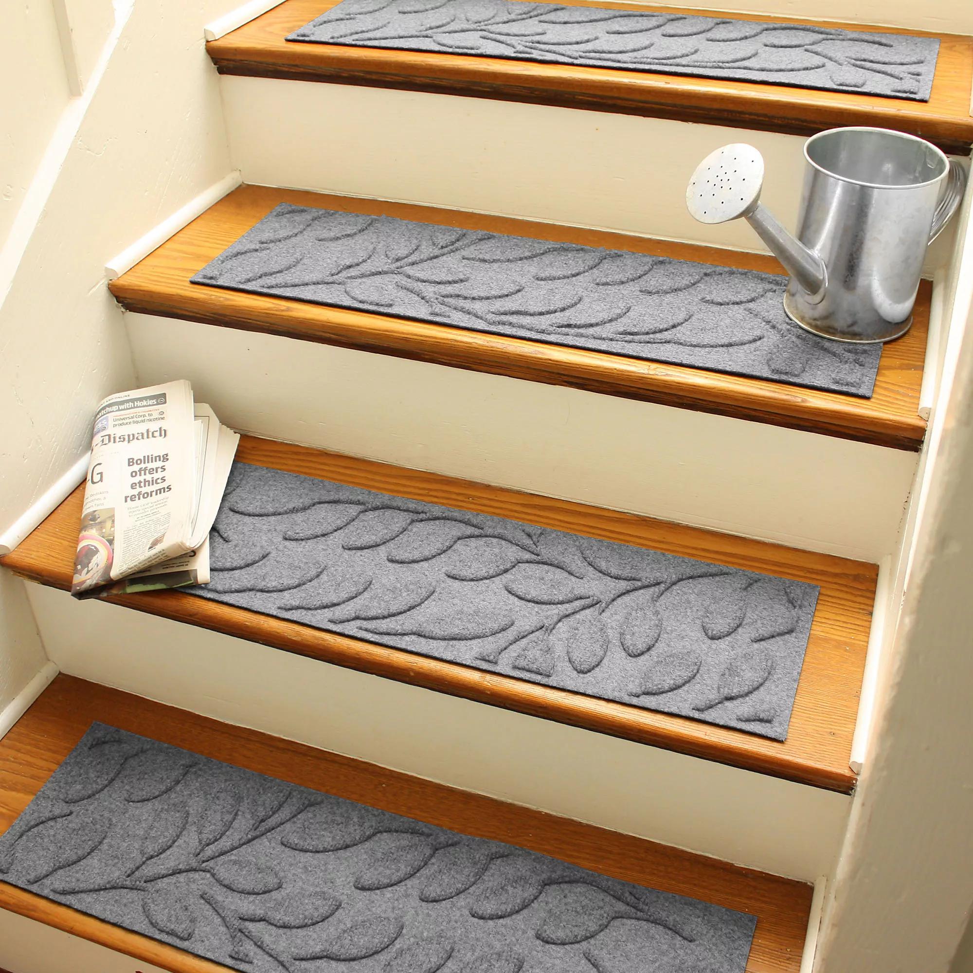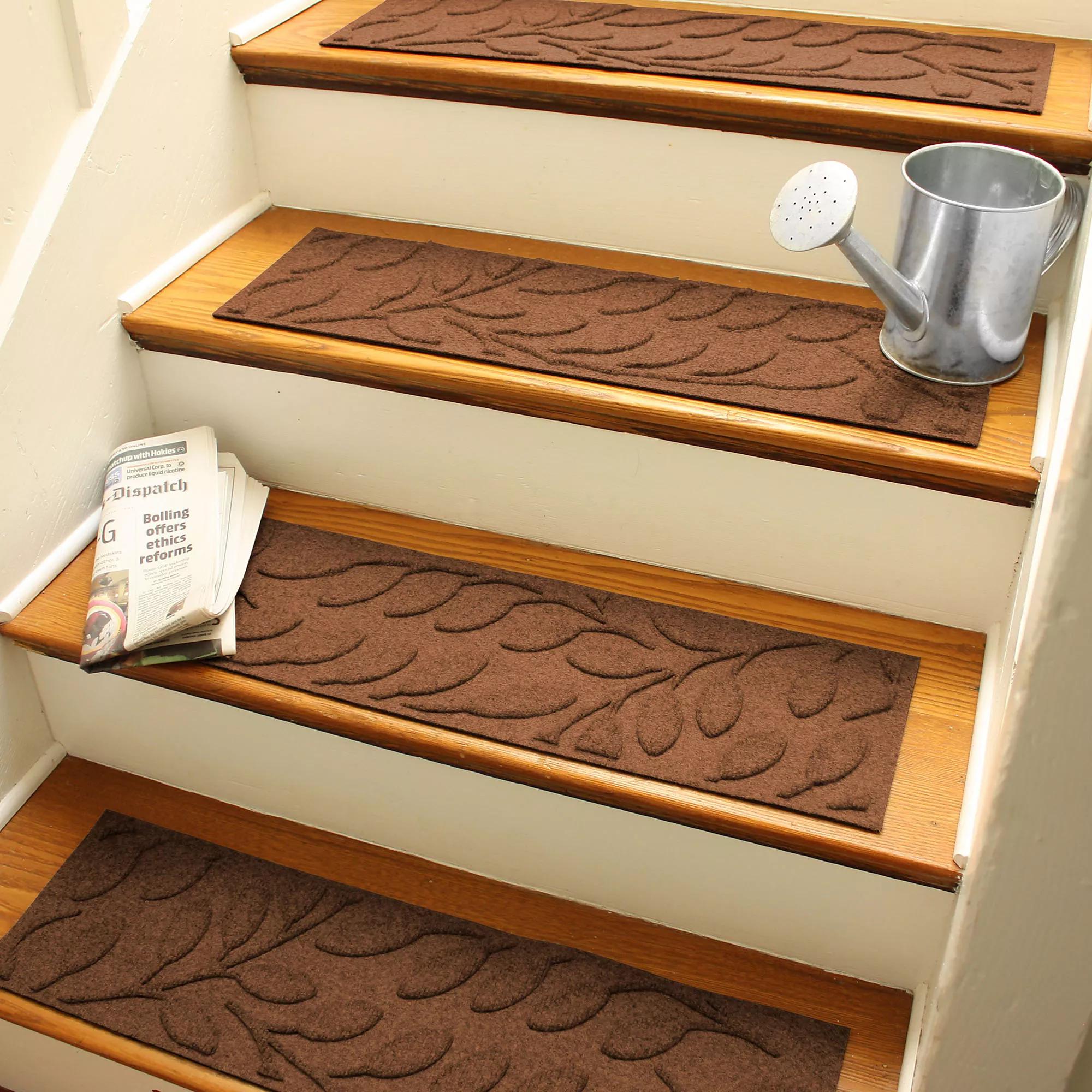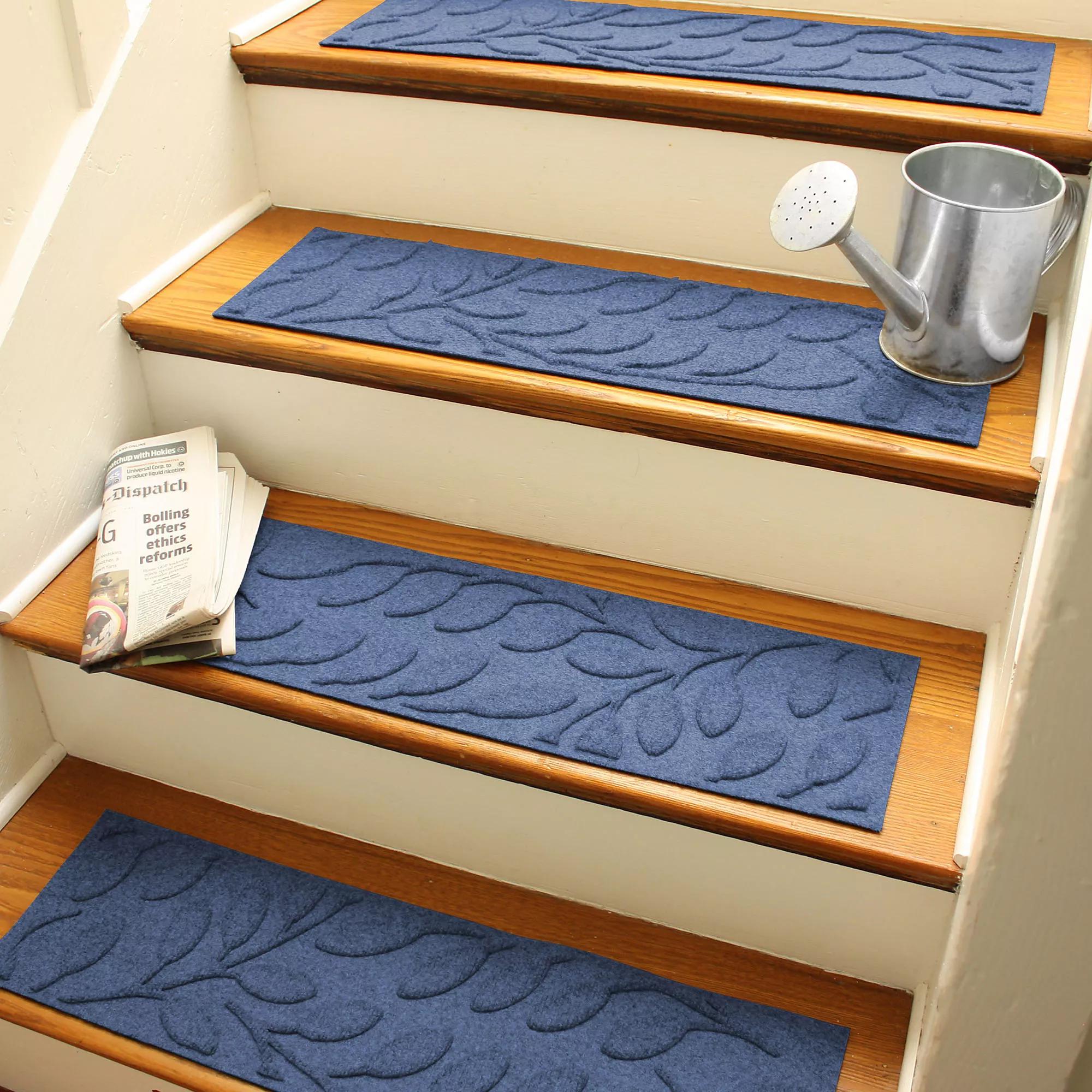 Protect your stairs from scuffs and yourself from painful slips and falls! These rugged beauties are made with commercial grade materials for tough environments. They won't fade, slip, or buckle. Built to tackle the rain, snow, mud, and other messes your loved ones track in, this set of 4 good-looking and hard-working WaterHog stair treads sport a textured design to scrape shoes clean, and a "water dam" edge to neatly contain up to 1 gallon of moisture. Made of tough, anti-static recycled polyester that dries quickly, resists mold and mildew, and won't fade or rot. A recycled rubber backing with non-slip grippers keeps these mats securely in place.