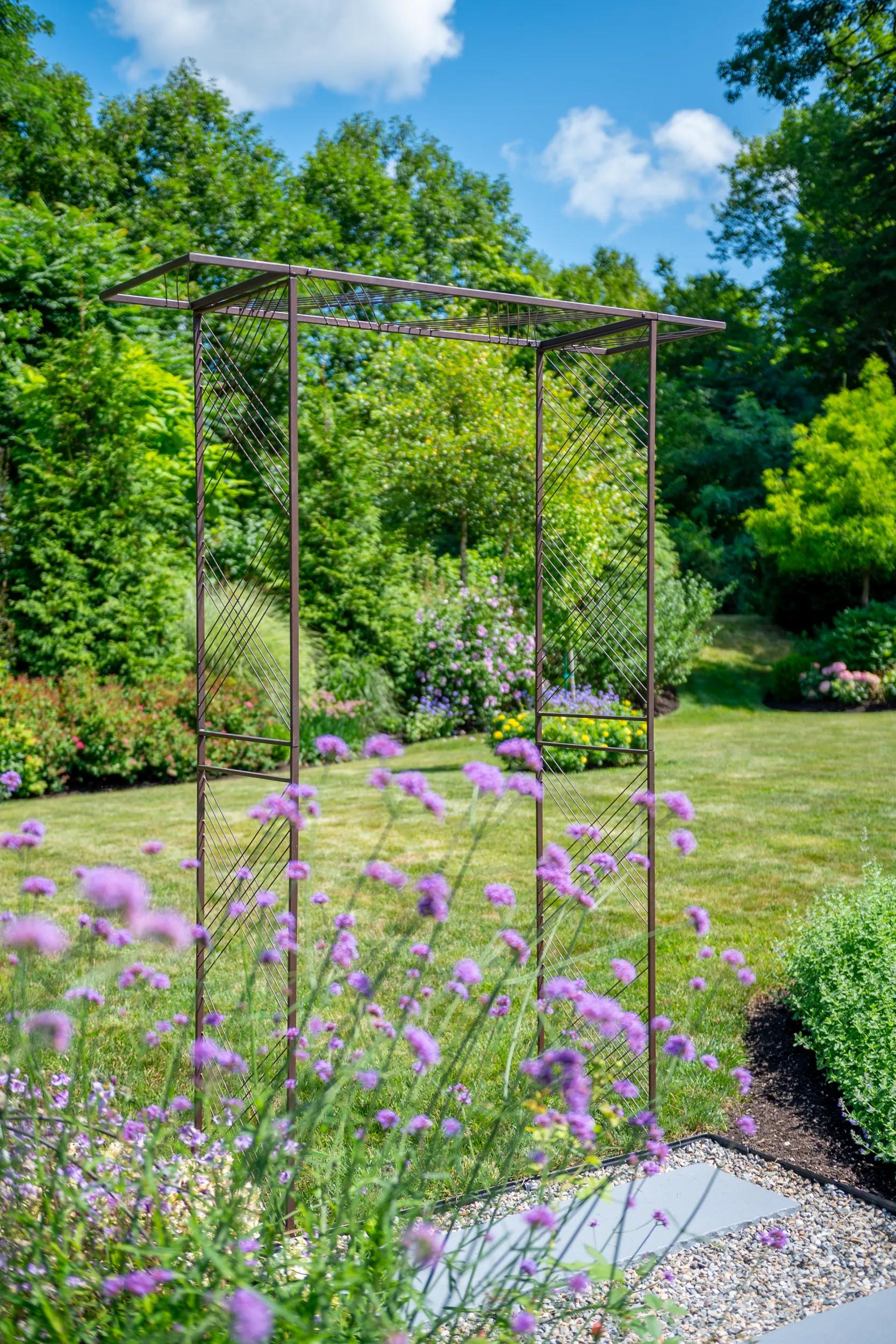 We'll take all of our passageways dripping with flowers, please! A garden archway evokes whimsy and wonder; even if you know what lies beyond, it feels like a portal to a magical, beautiful realm—because it is! Install this unique, flat-topped arch to create an elegant entrance that takes your favorite vining plants over the top. Climbing roses, sweet peas, and morning glories are among the plants that will thrive with this style of support.Complete the look with our Modena Wall Trellis.