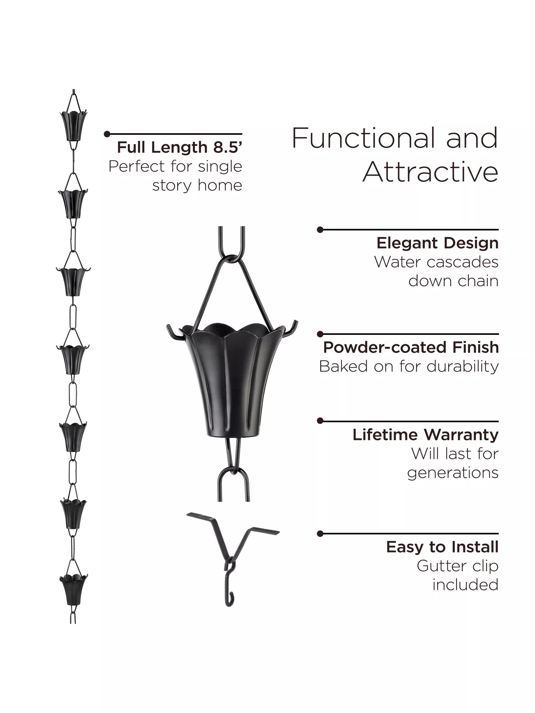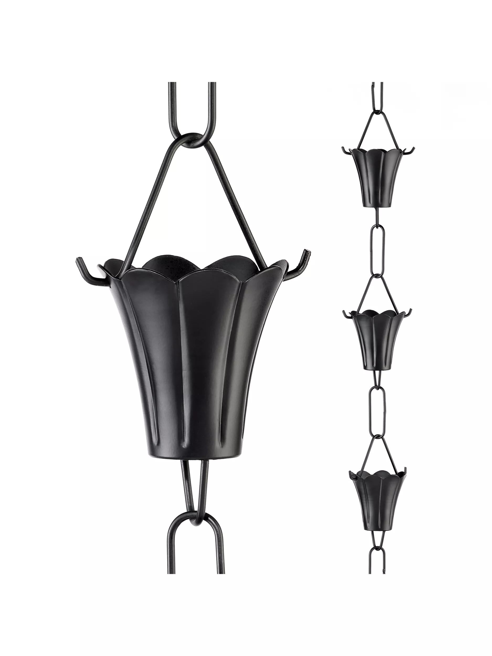 The Fluted Flower Rain Chain from Good Directions is artistically-designed and handmade to create a rain chain that is both beautiful and functional. Eleven, 3-inch wide fluted flowers link together with black chain to form an 8.5-foot rain chain that promotes water flow and allows water to cascade beautifully from rooftop to ground. Each cup features flared petals that are carefully-crafted to promote a steady stream of water. You will welcome rain when you replace your ordinary gutter downspout with this inspired rain chain. Our rain chains are built to last. Since 1982 Good Directions has been handcrafting works of art to enhance the homes of house-proud homeowners.