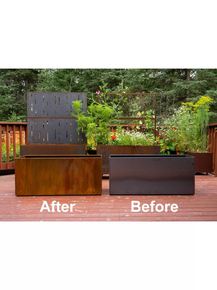 These planters are shaped from steel by skilled craftsmen utilizing precise folding of the metal to create a planter that uses no welding during the manufacturing process and assembles into a rectangular shape from five panels. Planter panels interlock together to form an incredibly solid plant container that can accommodate large plants. Most of all, the planter is simple, stylish, modern and minimalist. Corten steel planters do not ship pre-weathered and will arrive with the bare steel finish which will have to weather over time to develop its attractive and protective patina of rust. They should be placed on grass during weathering process to avoid staining of adjacent materials.