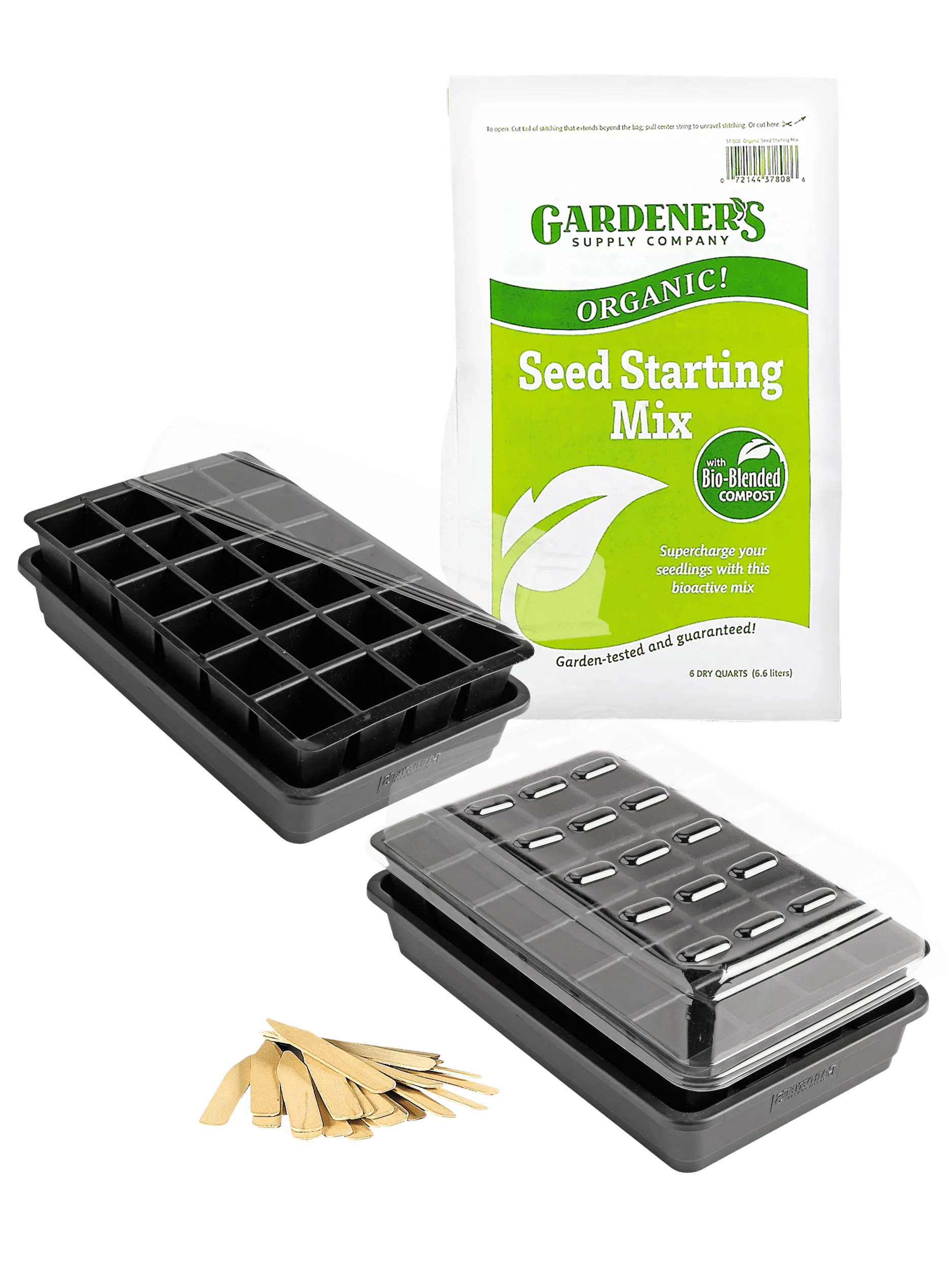 This complete seed starter kit includes two 24-cell GrowEase Seed Starters, 6 quarts of Organic Seed Starting Mix and 24 wooden seedling markers. Just add seeds!