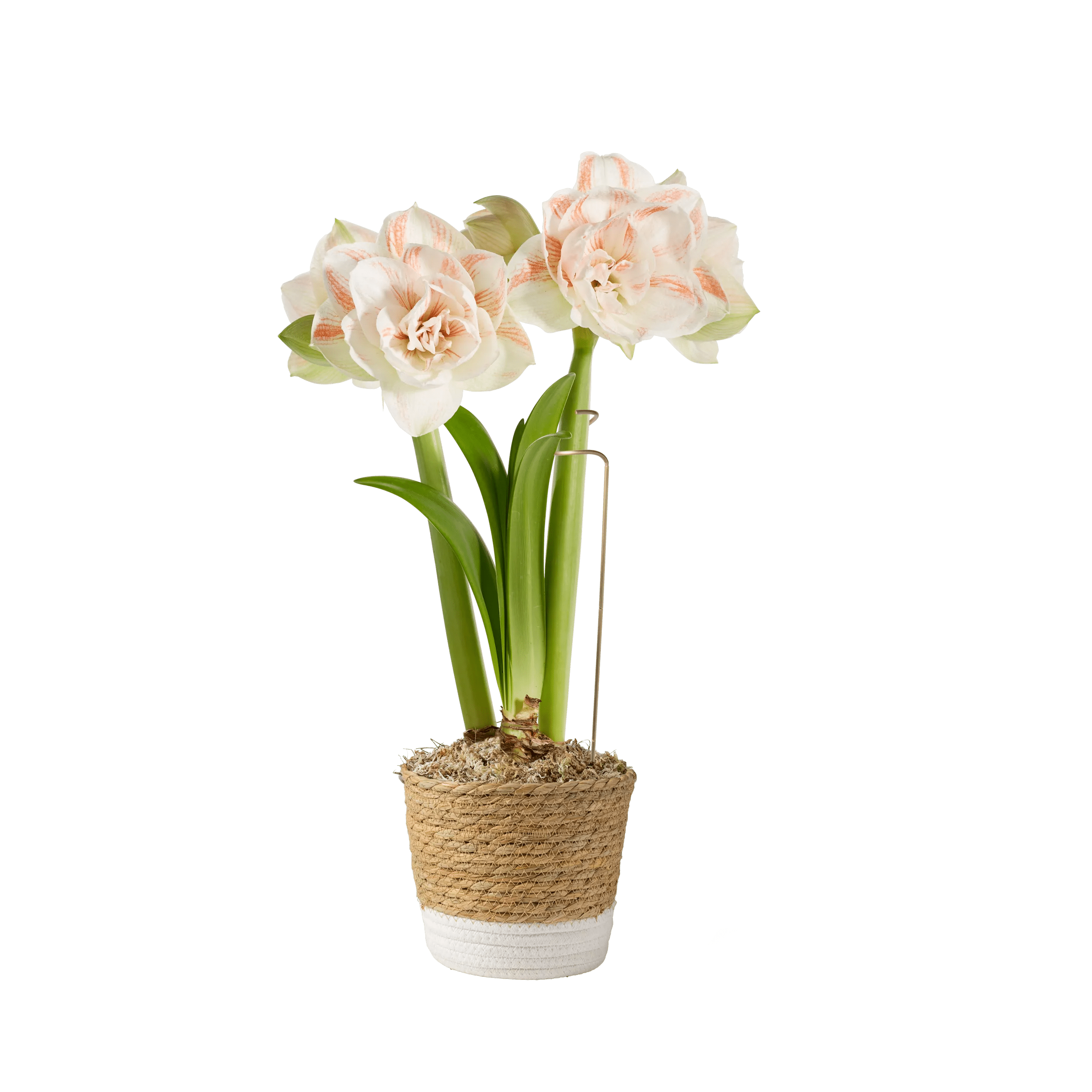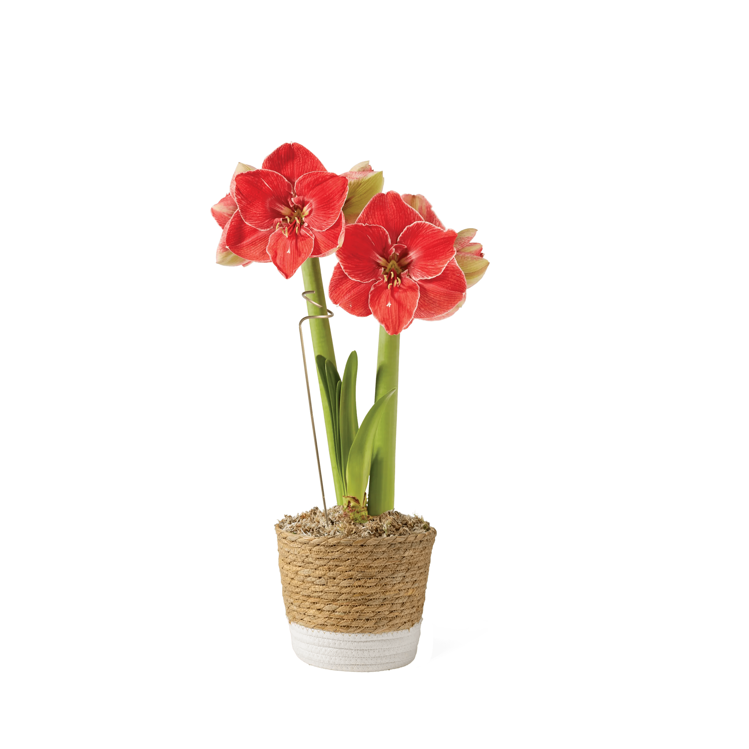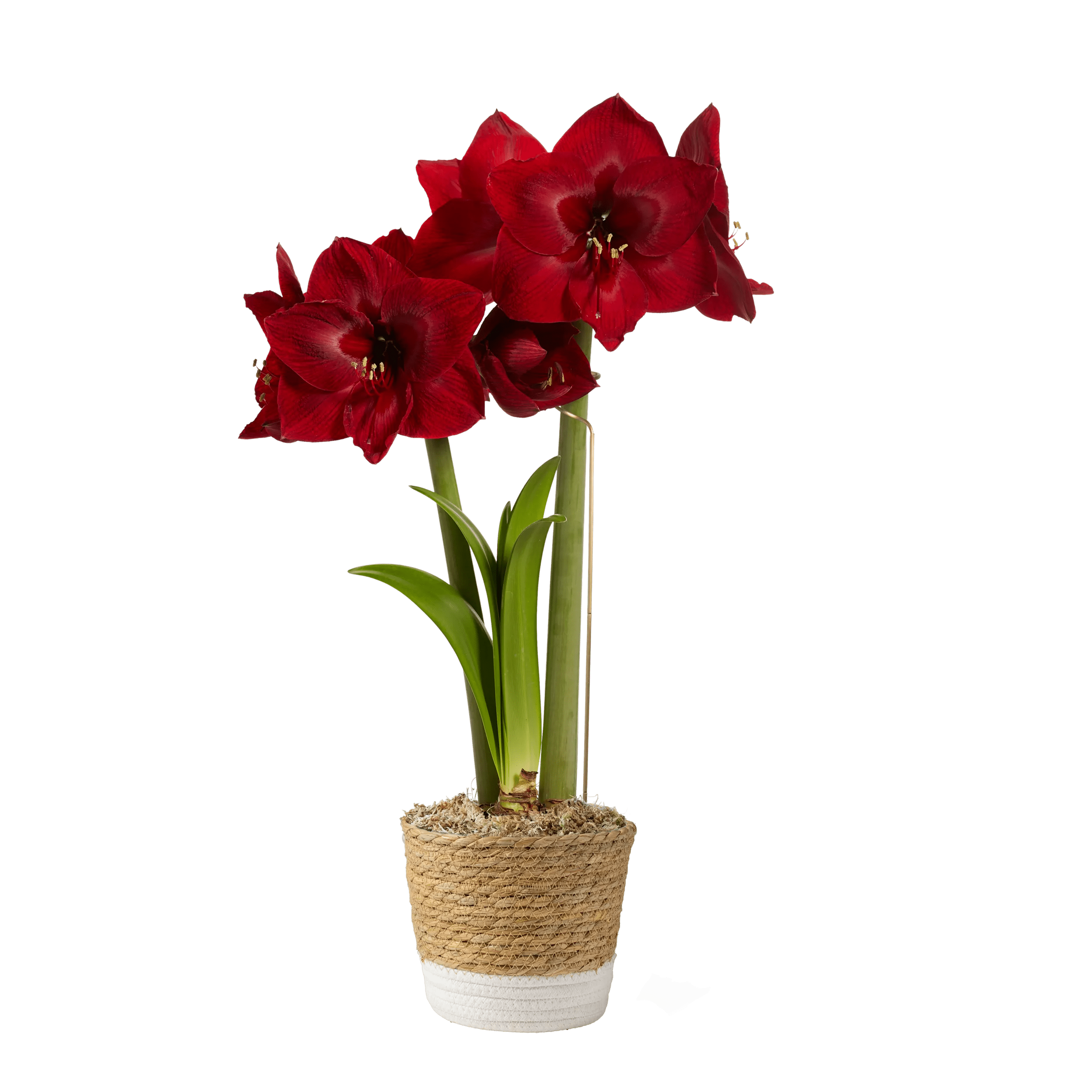 - Premium amaryllis bulb, potting medium, sphagnum moss, reusable woven cachepot, brass stake