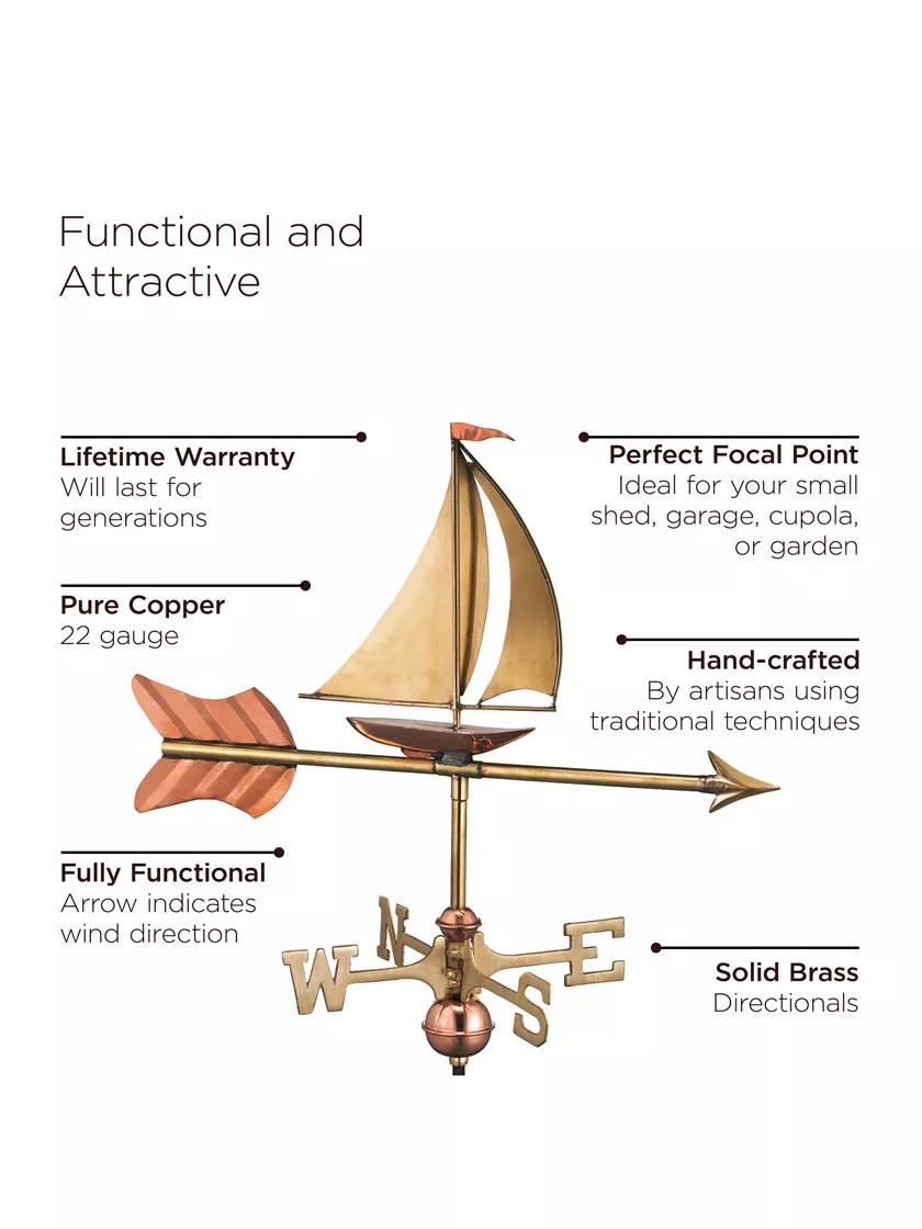 With its New England origins, this boat is ready to become a beautiful and functional decoration in your garden. For over 35 years Good Directions Pure Copper Weathervanes have been unsurpassed in style, quality, and durability – perfect for the house-proud homeowner. Bring the Joy of Outdoor Living℠ to your home with this heirloom-quality piece. The pure copper will age naturally over time. Mounting pole included