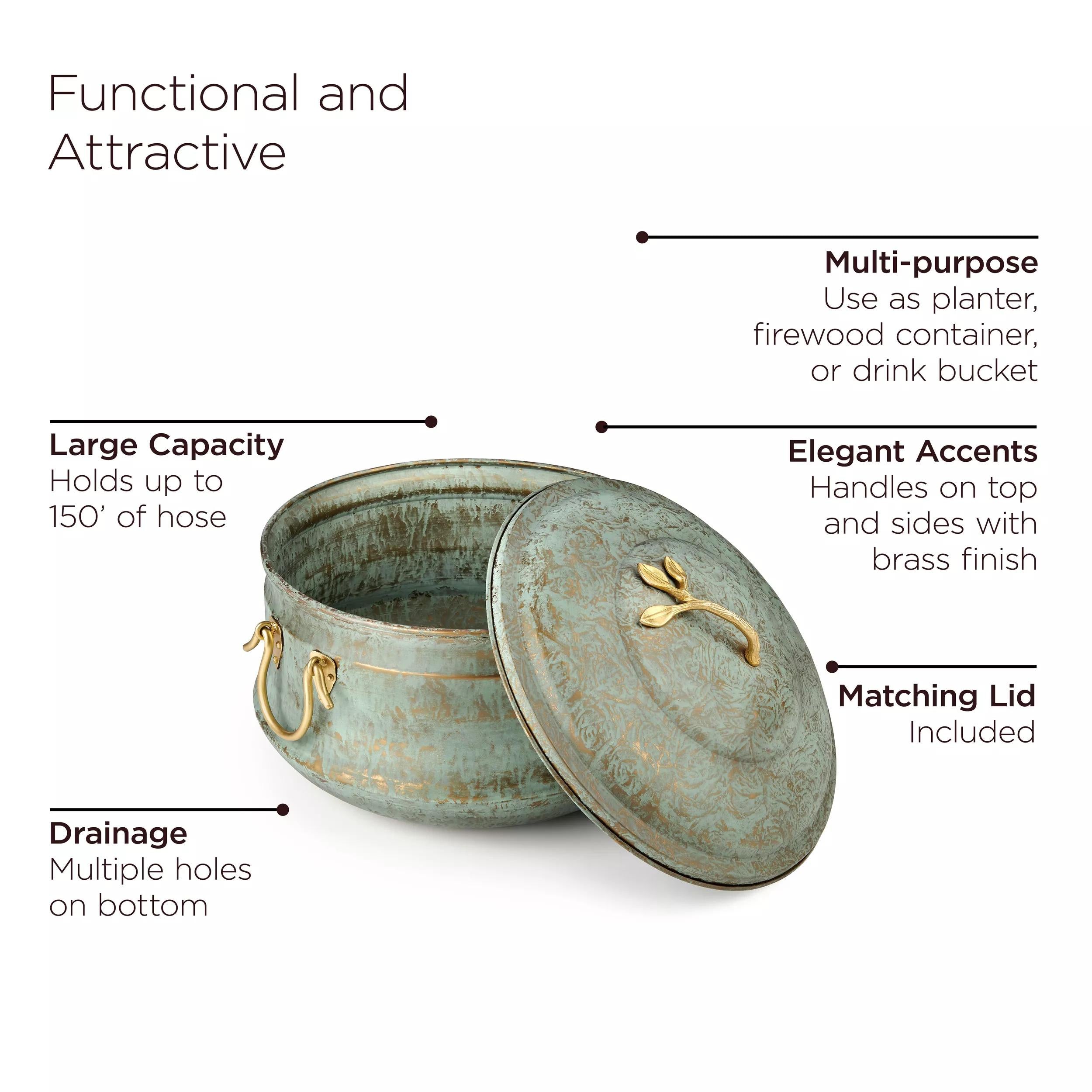 Built with durable materials, this long-lasting piece of perfection provides functionality while adding to the ambiance of any outdoor oasis. The Sedona boasts beautiful verdigris and brass accents which compliment any garden. Holds up to 100-feet of hose inside, and multiple drainage holes that eliminate excess water. An ample opening on the side allows for easy connection to an outdoor faucet. These versatile containers can also be used as graceful planters, firewood containers, or impressive drink buckets sure to strike up conversation.